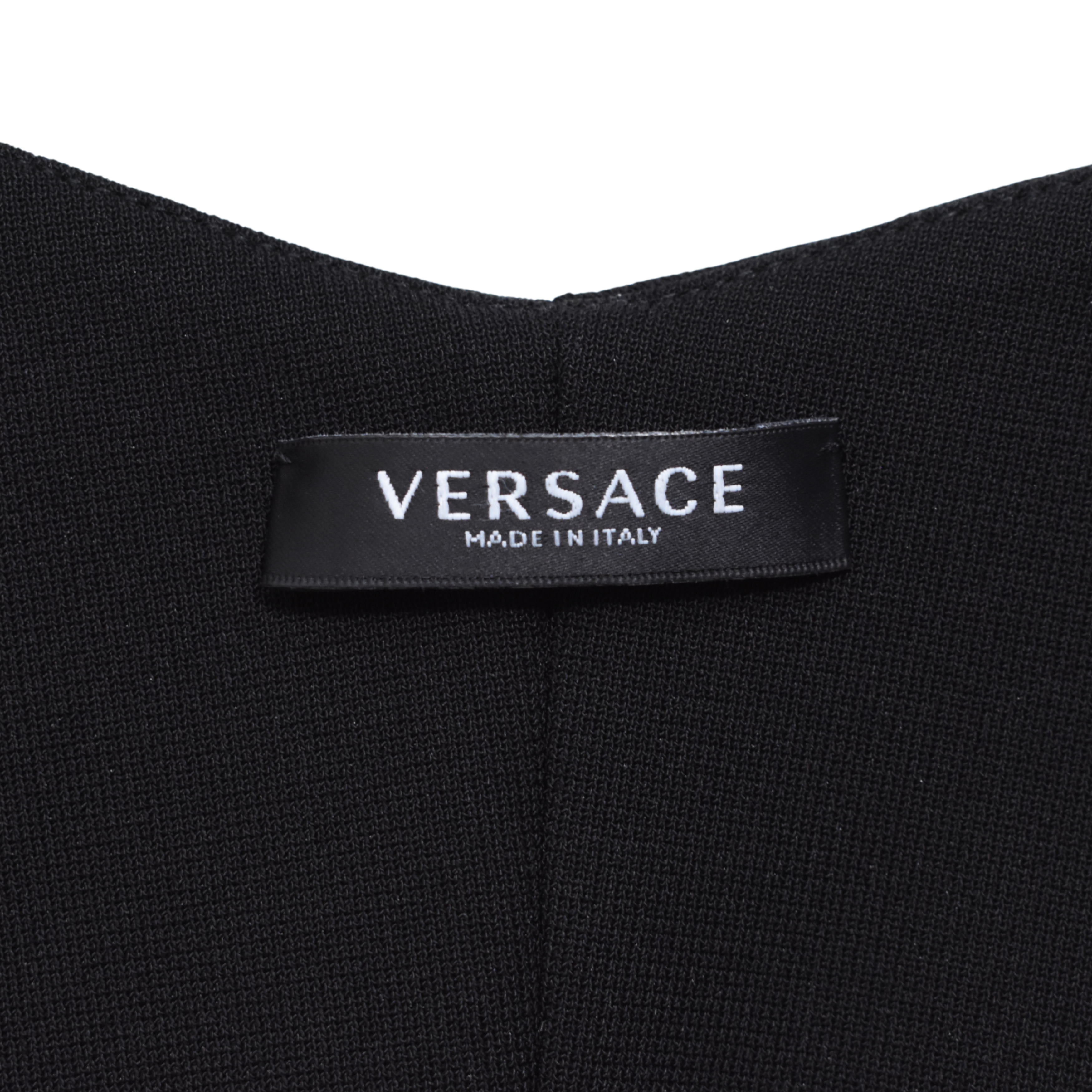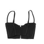 Versace cropped black bustier top with a silver zipper down the front, satin accents, and a stretch panel in the back.