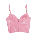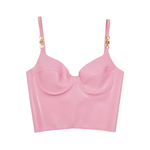 Versace 'Medusa '95' cropped bustier top in light pink latex with gold Medusa buckle on the straps and a zipper down the back.