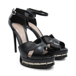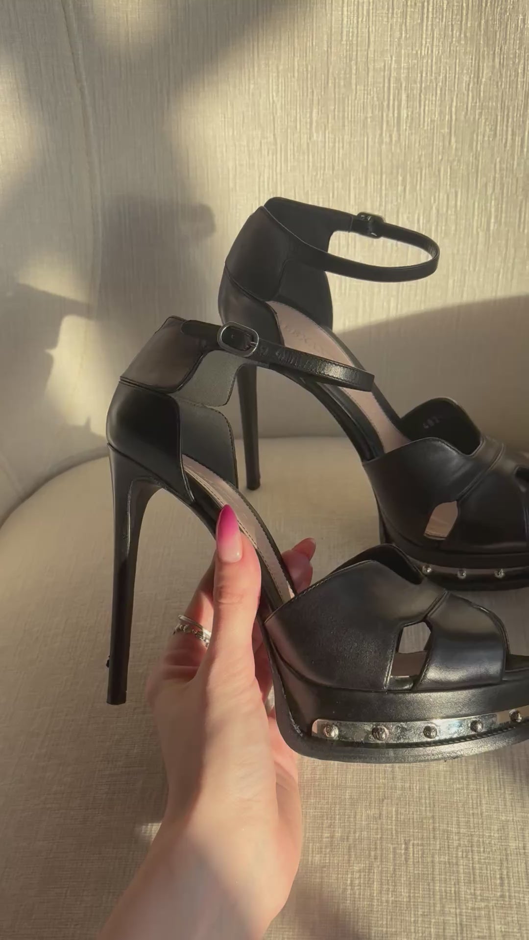 Alexander McQueen peep toe, platform, black leather heels with silver details. Features an adjustable ankle strap, cut outs on side of toe, and a stiletto heel.