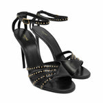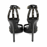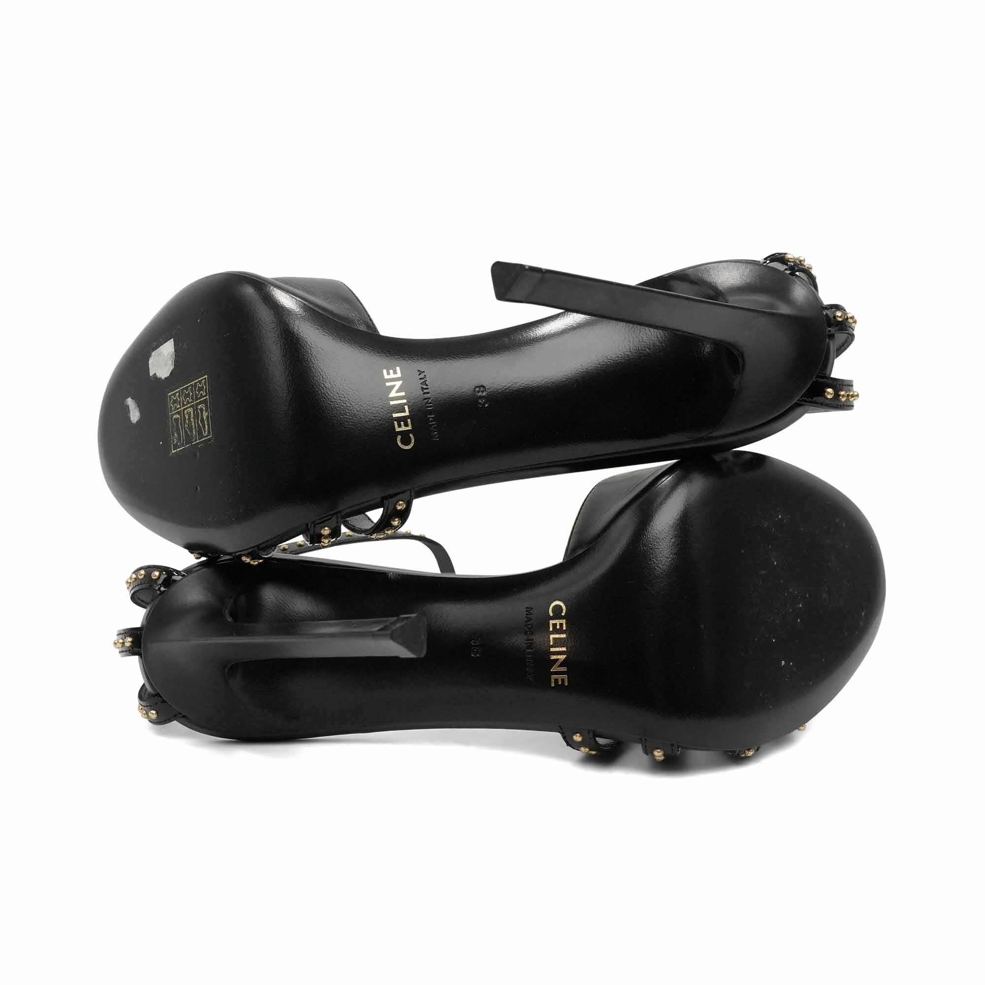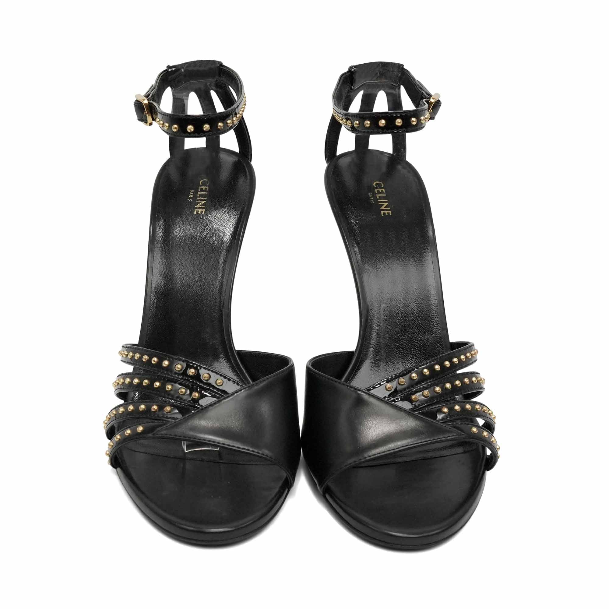 Celine 'Sharp' sandals in black leather with patent details, small gold studs throughout, an ankle strap, and a peep toe.