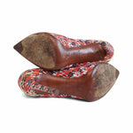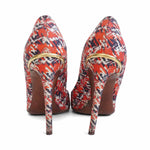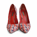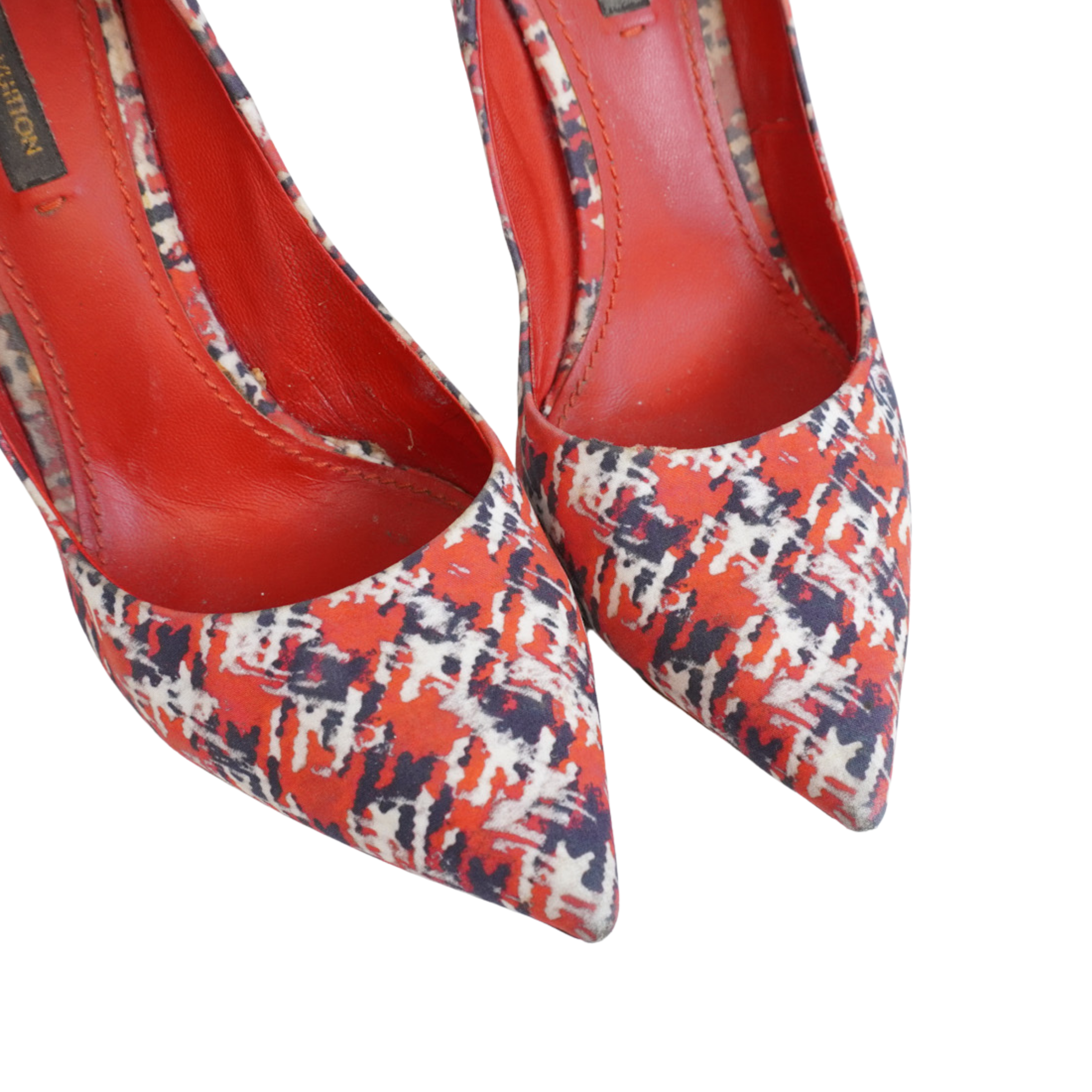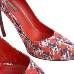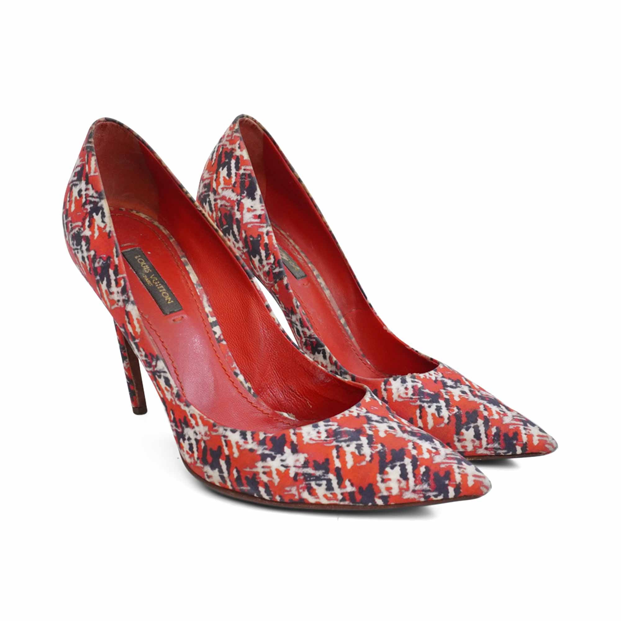 Louis Vuitton pumps in red satin with an all-over black and white abstract tweed print, a stiletto heel with gold metal trim, and a pointed toe.