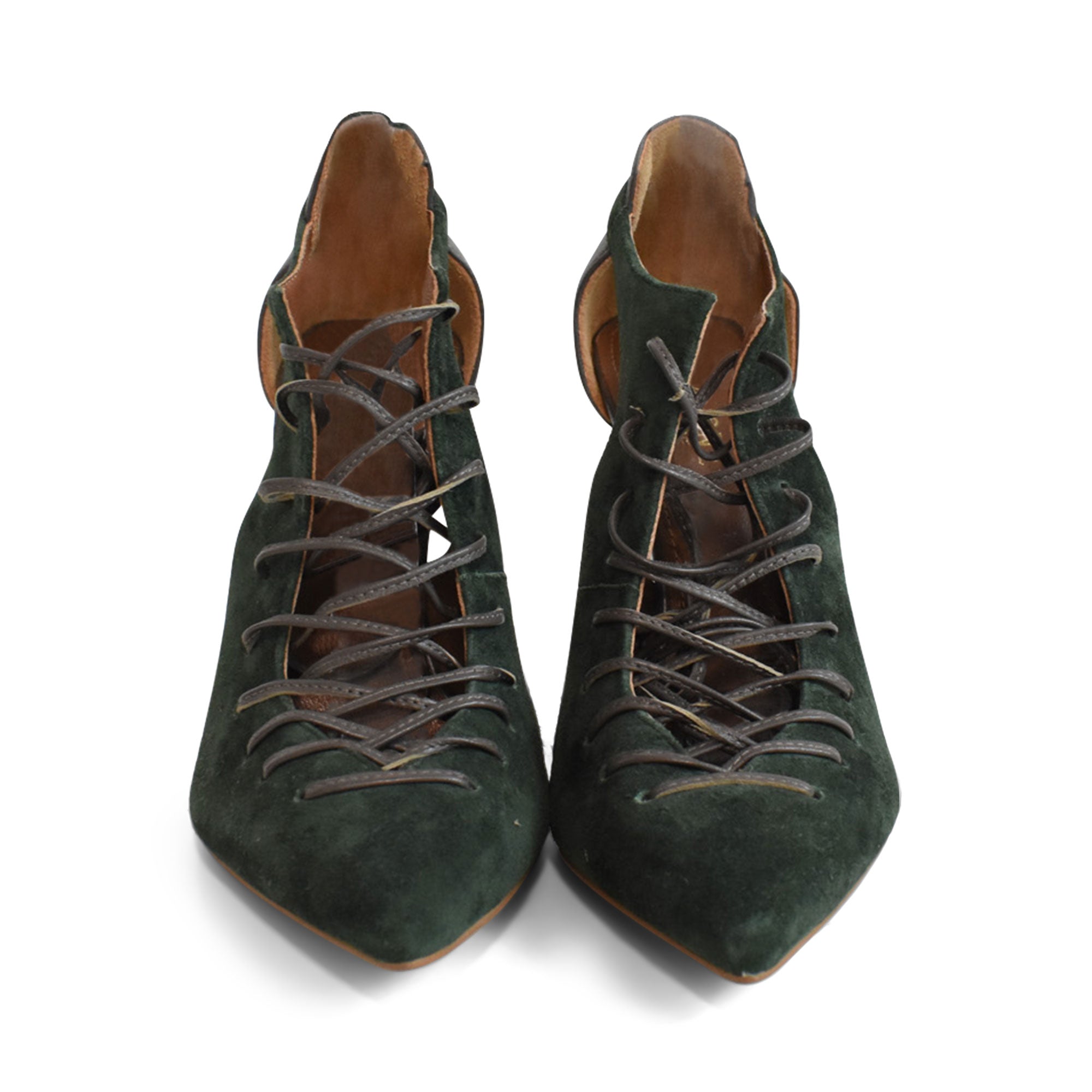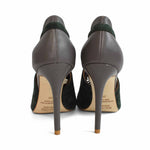 Malone Souliers heels in green suede with grey leather panels, a cutouts at the sides, a lace up closure, and a pointed toe.
