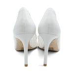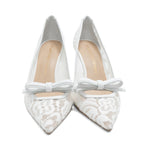 Stuart Weitzman pointed toe pumps in white 'garden' lace with white leather trim. Features a white leather bow on the front, white leather heel, and a mesh underlay under the lace.