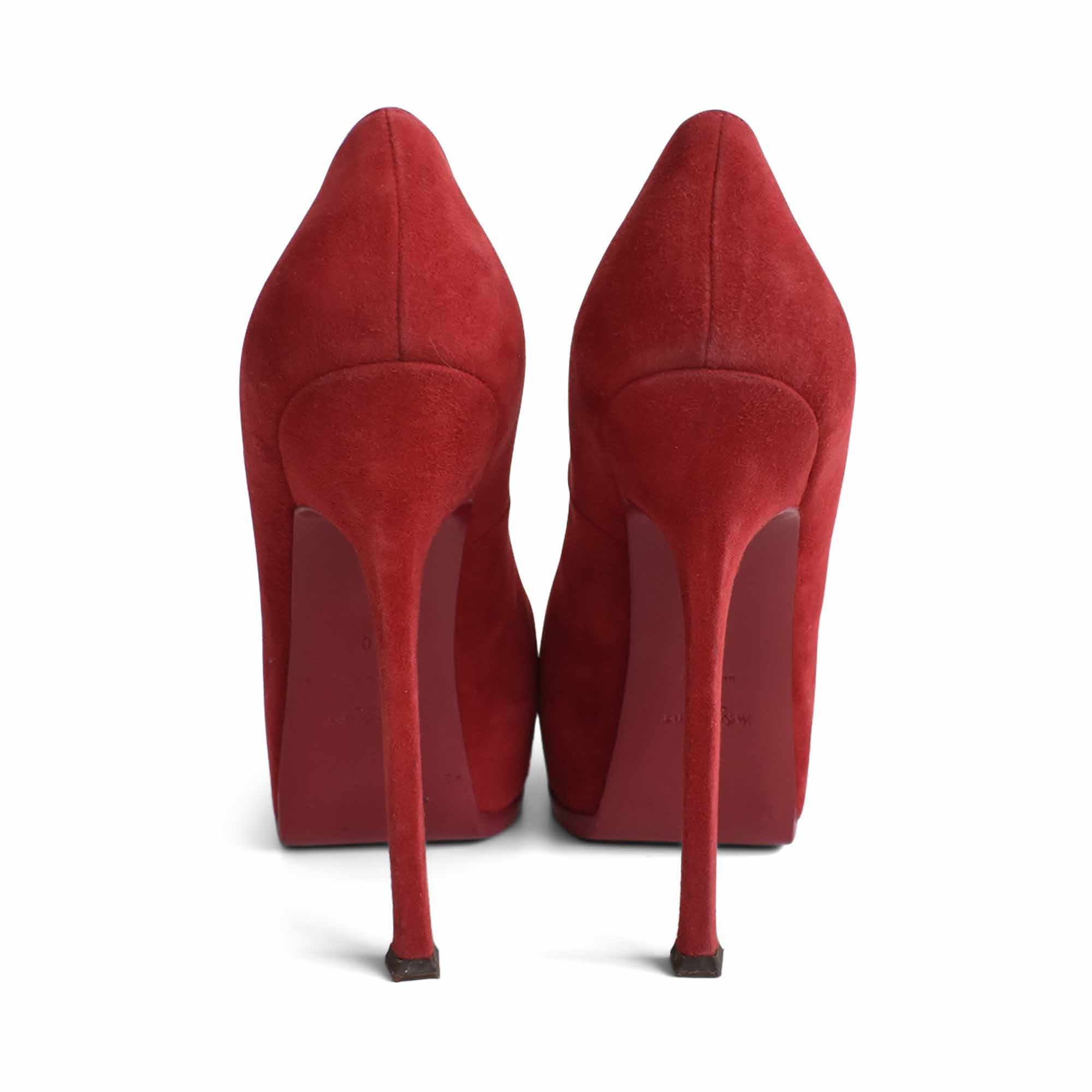 Yves Saint Laurent 'Tribtoo' platform pumps in red suede with round toes and stiletto heels.
