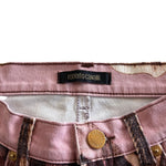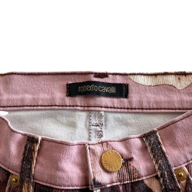 Roberto Cavalli high-waisted straight-leg jeans in a pink feather print with five-pocket styling and gold hardware.