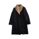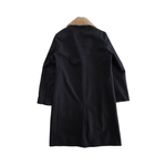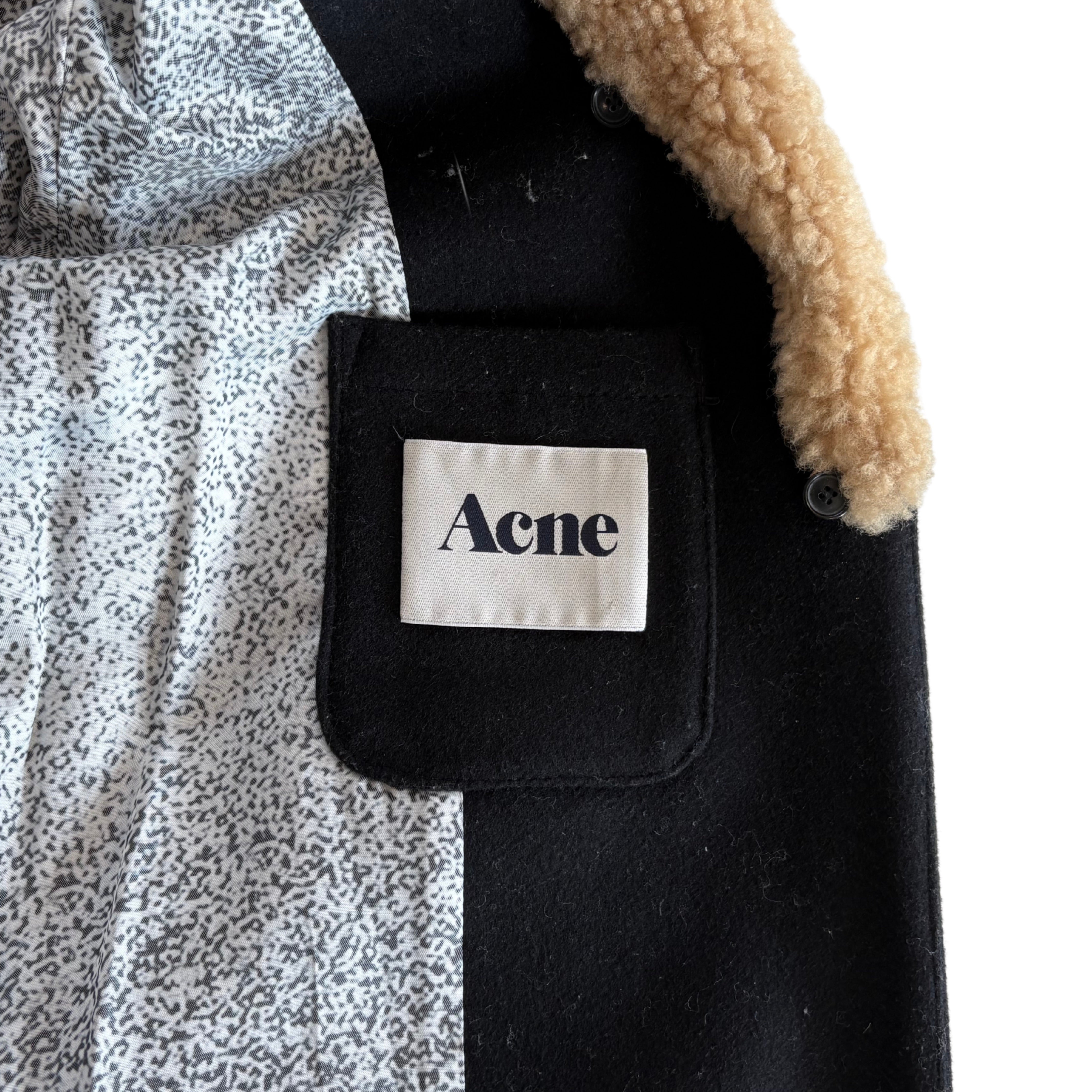 Acne trench coat in black wool with a front-button closure, zip pockets at the side seams, and a removable beige faux shearling collar.