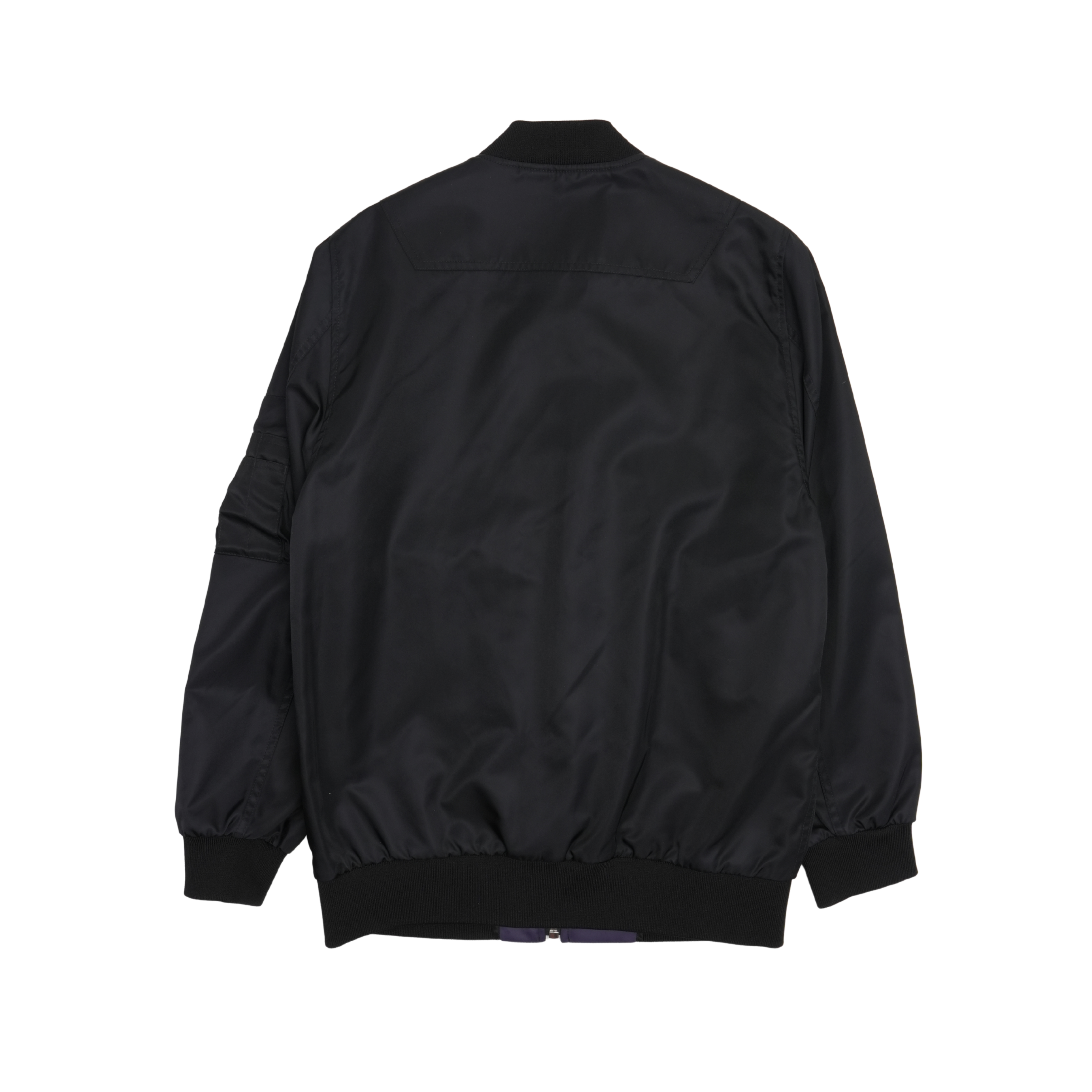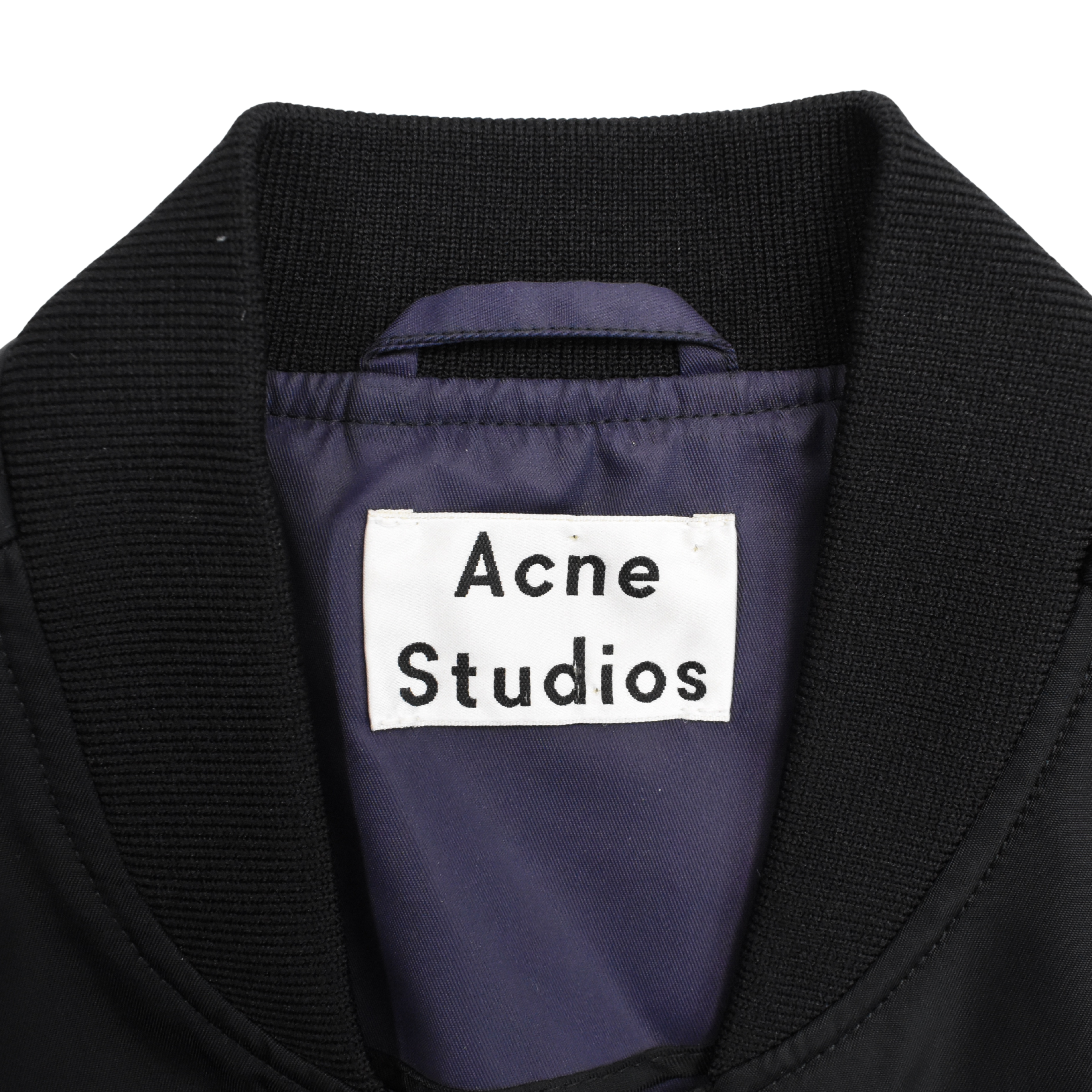 Acne Studios 'Makio' bomber jacket in black nylon with a front zip and snap button closure in silver hardware, side zip pockets, and a patch pocket on the sleeve.
