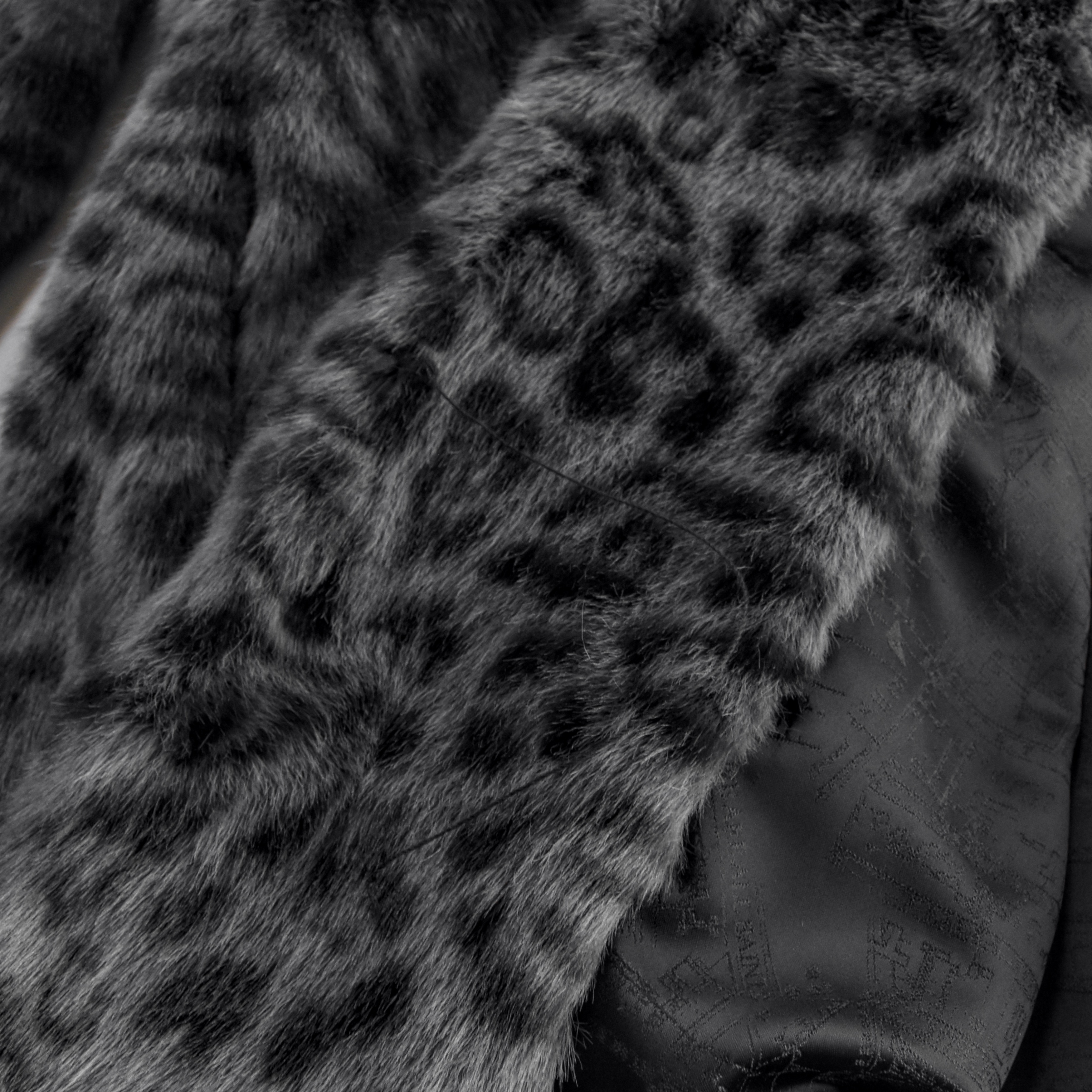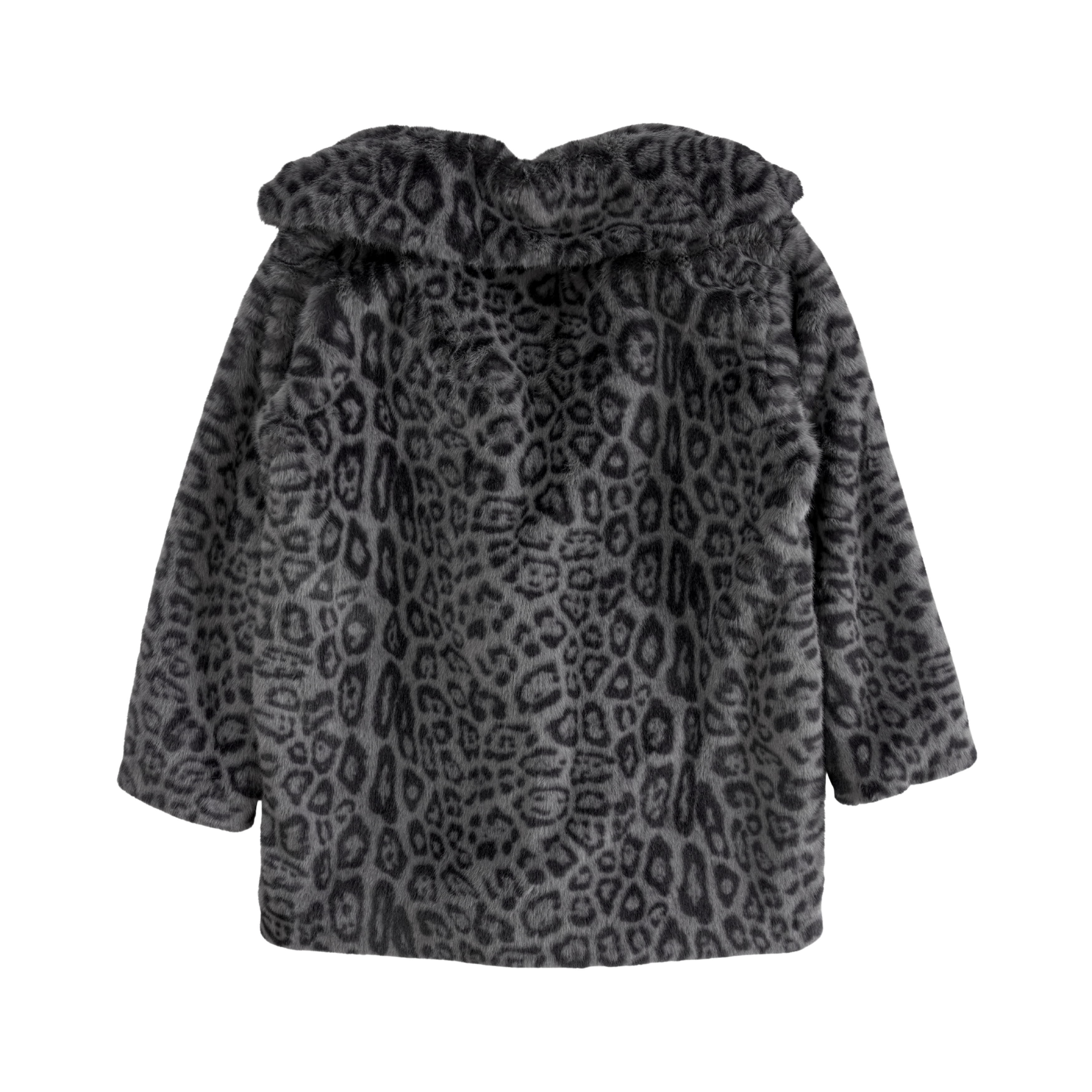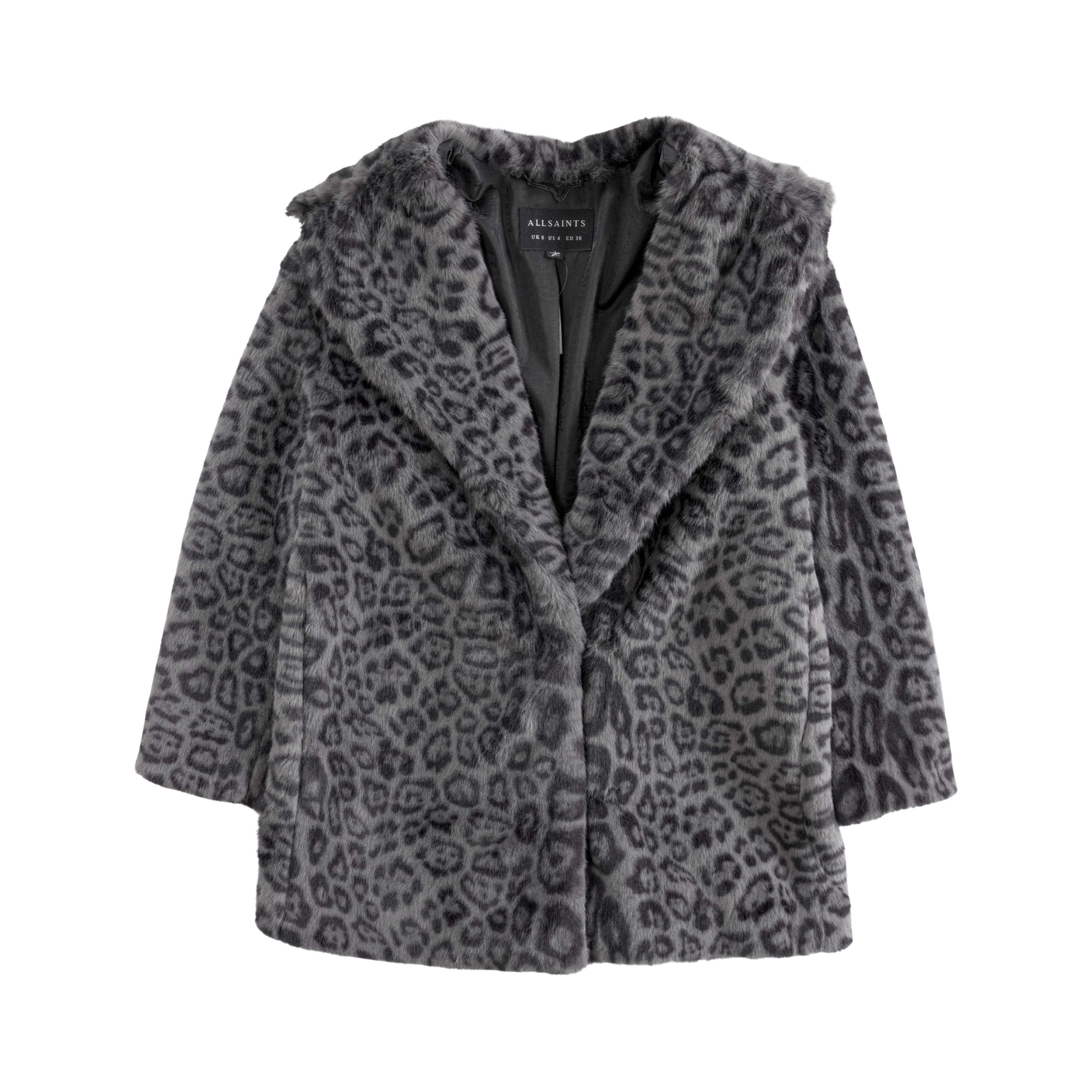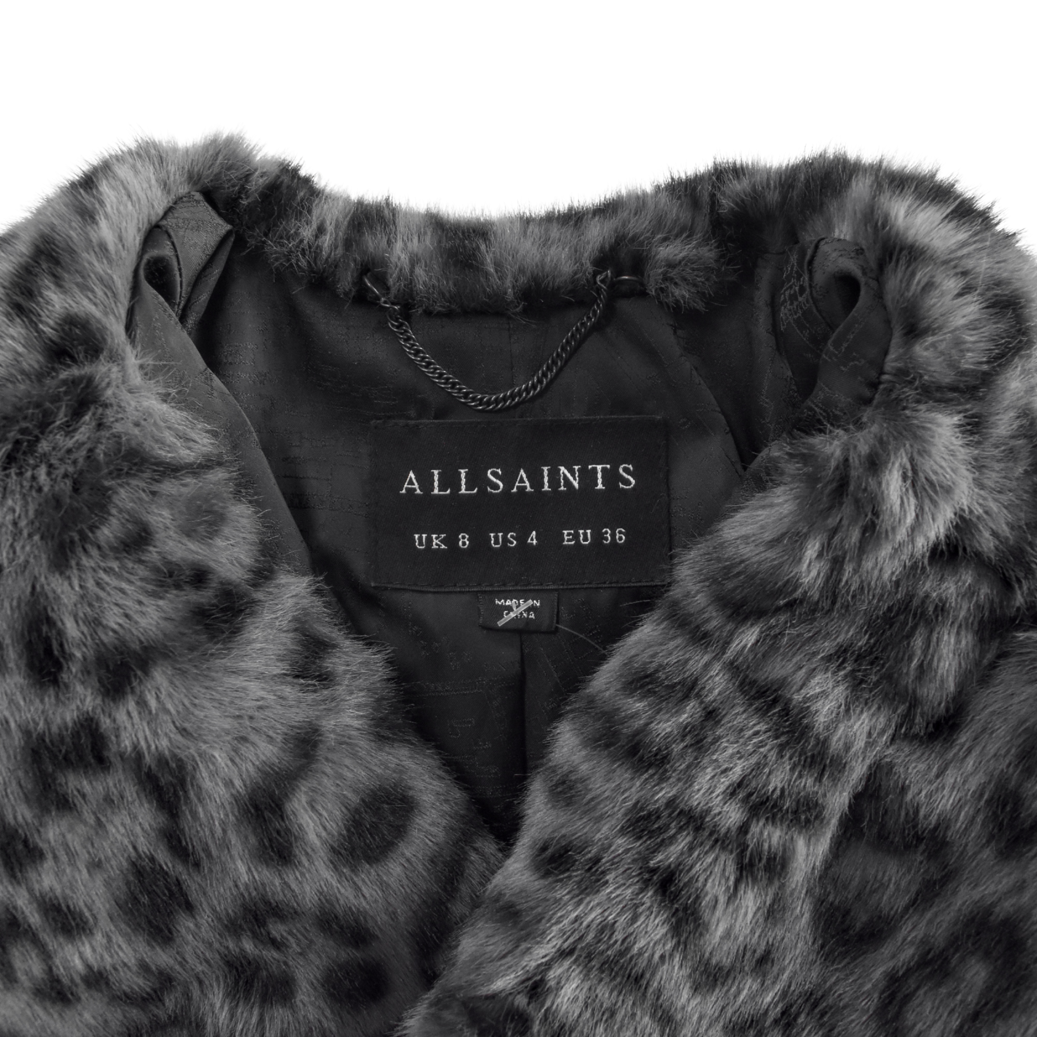 All Saints 'Amice Leopard' mid-length jacket in grey and black leopard printed faux fur with two hook closures at the front, side slip pockets, and a large collar.