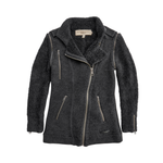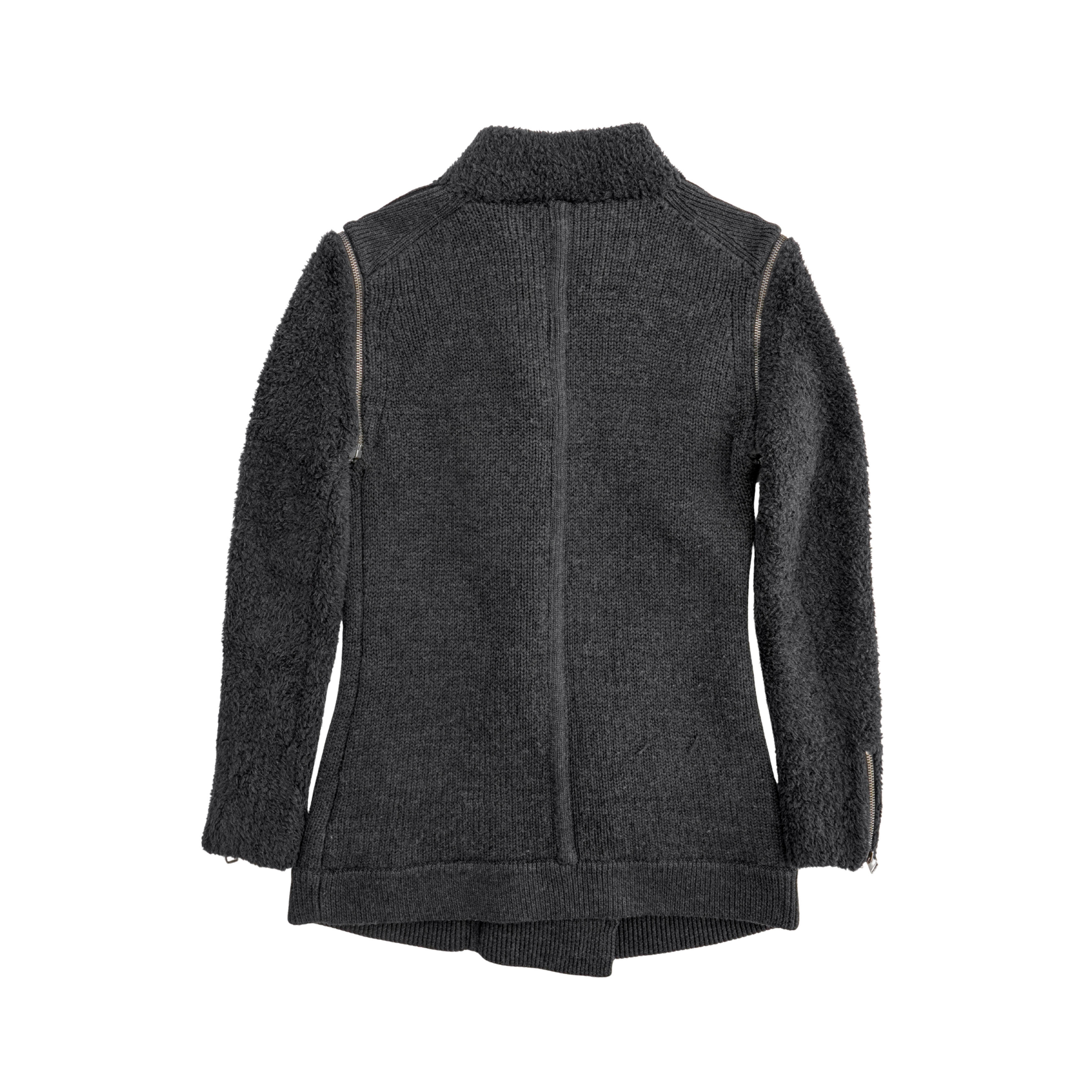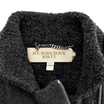 Burberry Brit convertible knit jacket in grey wool with textured sleeves and collar, an asymmetrical front zip opening in brushed silver hardware, front zip pockets, shoulder epaulettes. Features removable sleeves which are able to be zipped off to turn the jacket into a vest.