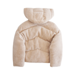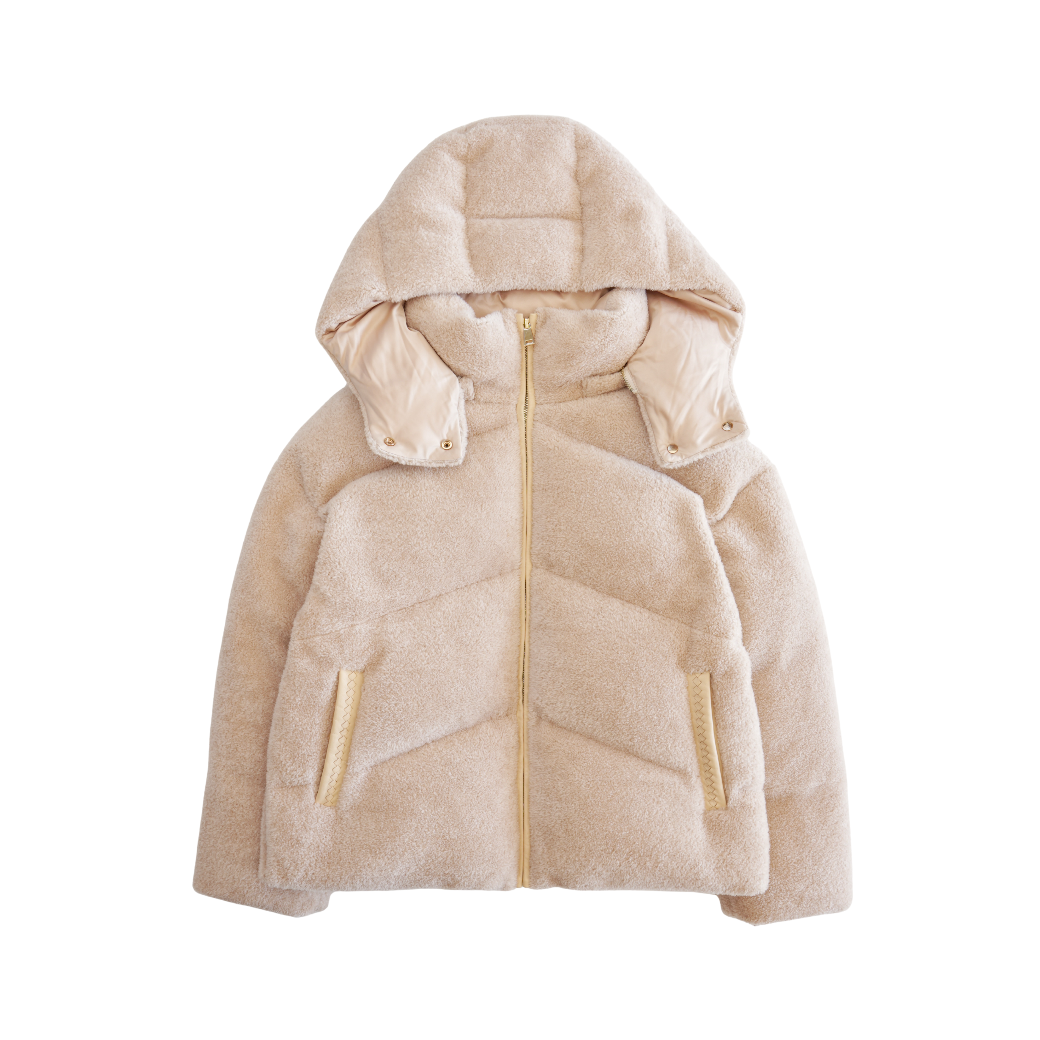 Camellia teddy puffer jacket in beige teddy wool with beige braided leather trim, a front zip opening in gold hardware, and a removable hood.