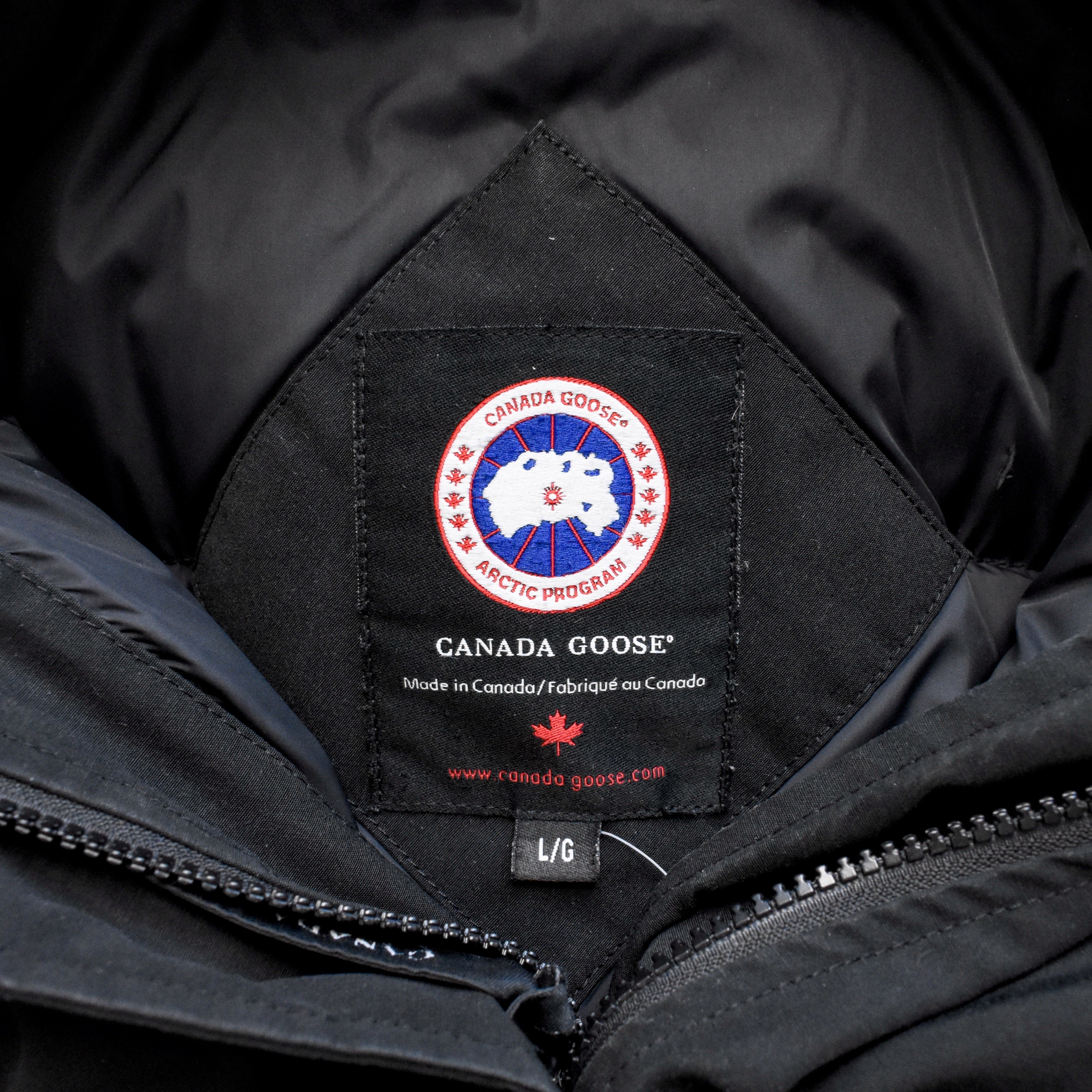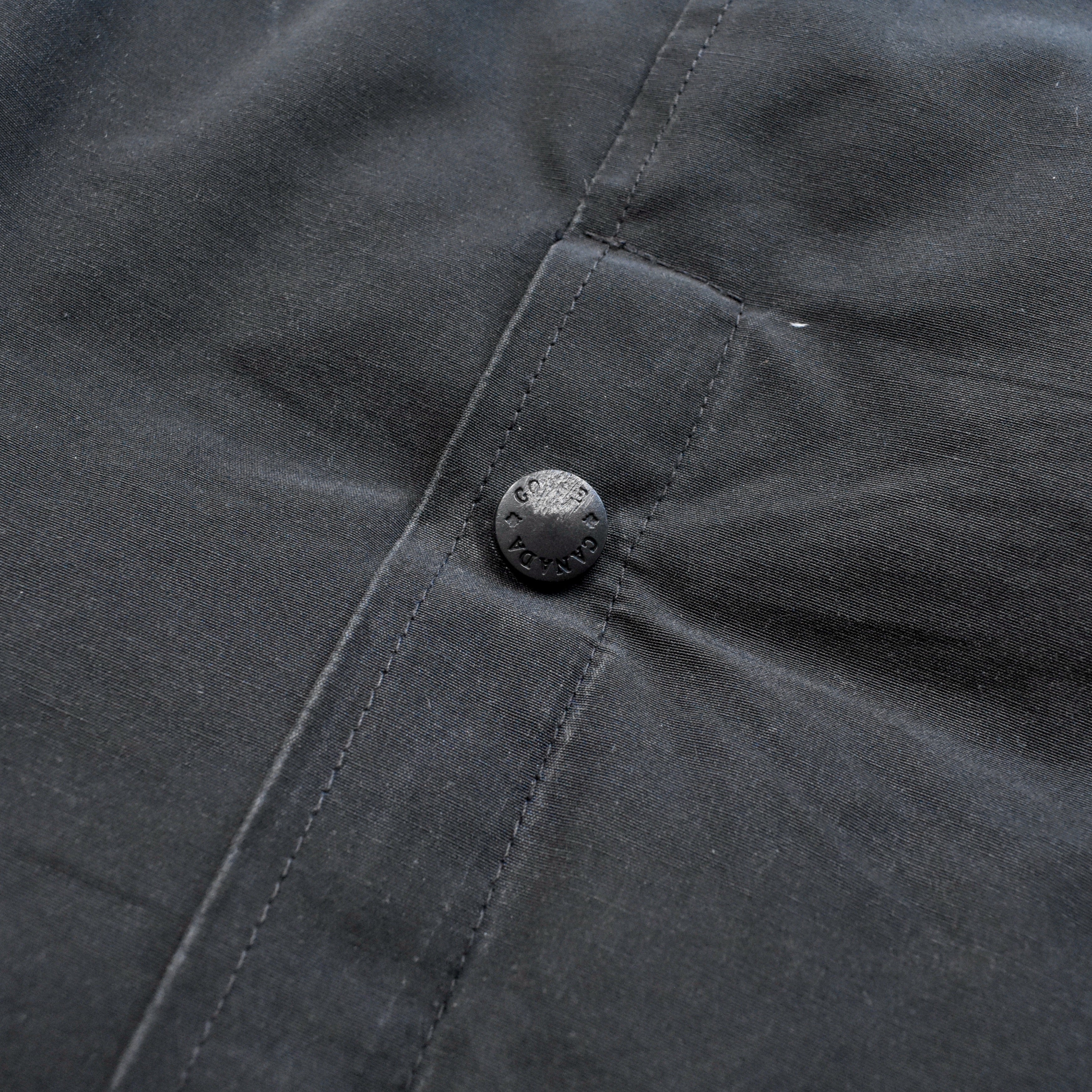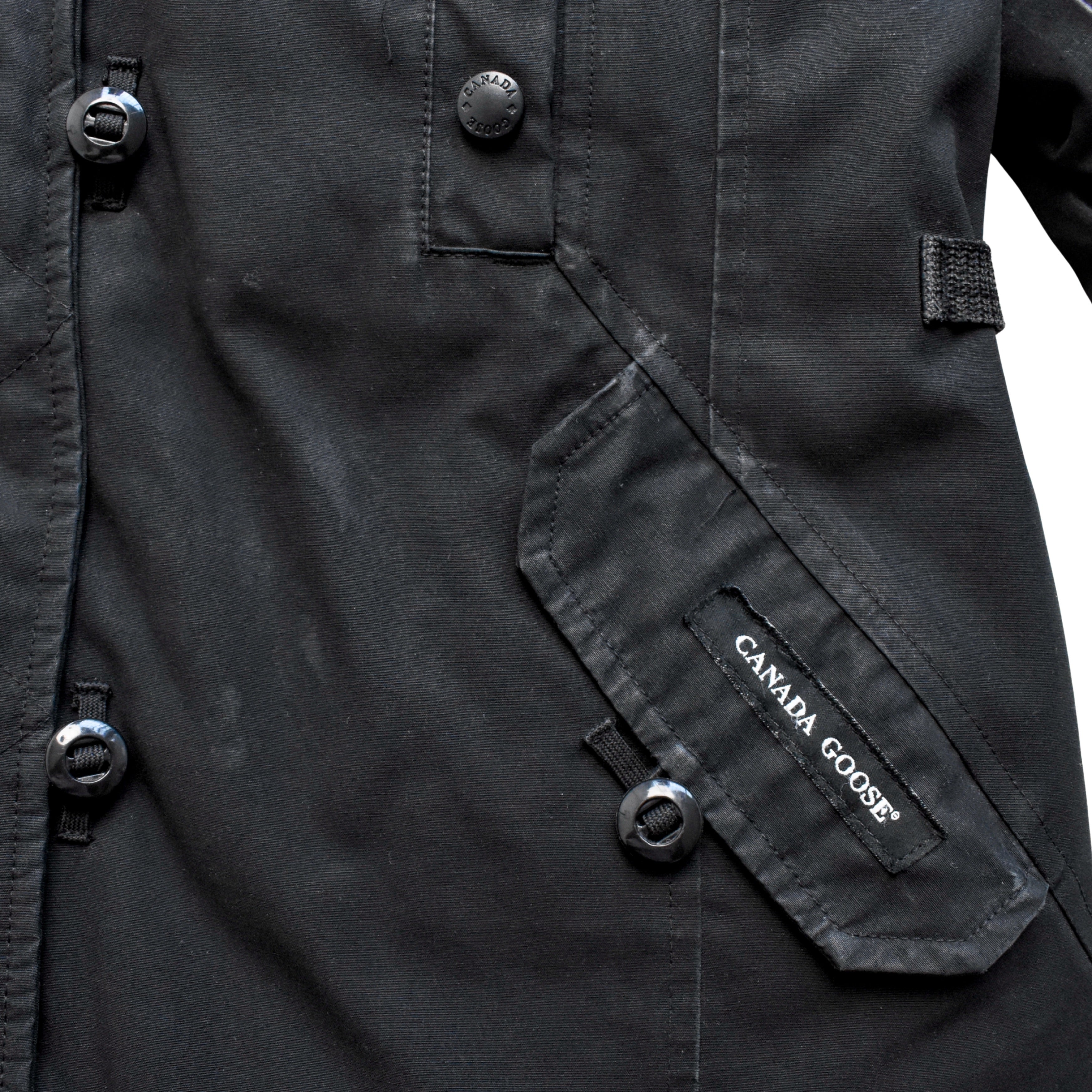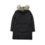 Canada Goose 'Kensington' parka jacket in black nylon with a hidden front zip opening in black hardware, toggle button closures, front pockets, a signature logo patch on the sleeve, and a removable coyote fur hood trim.