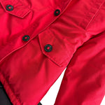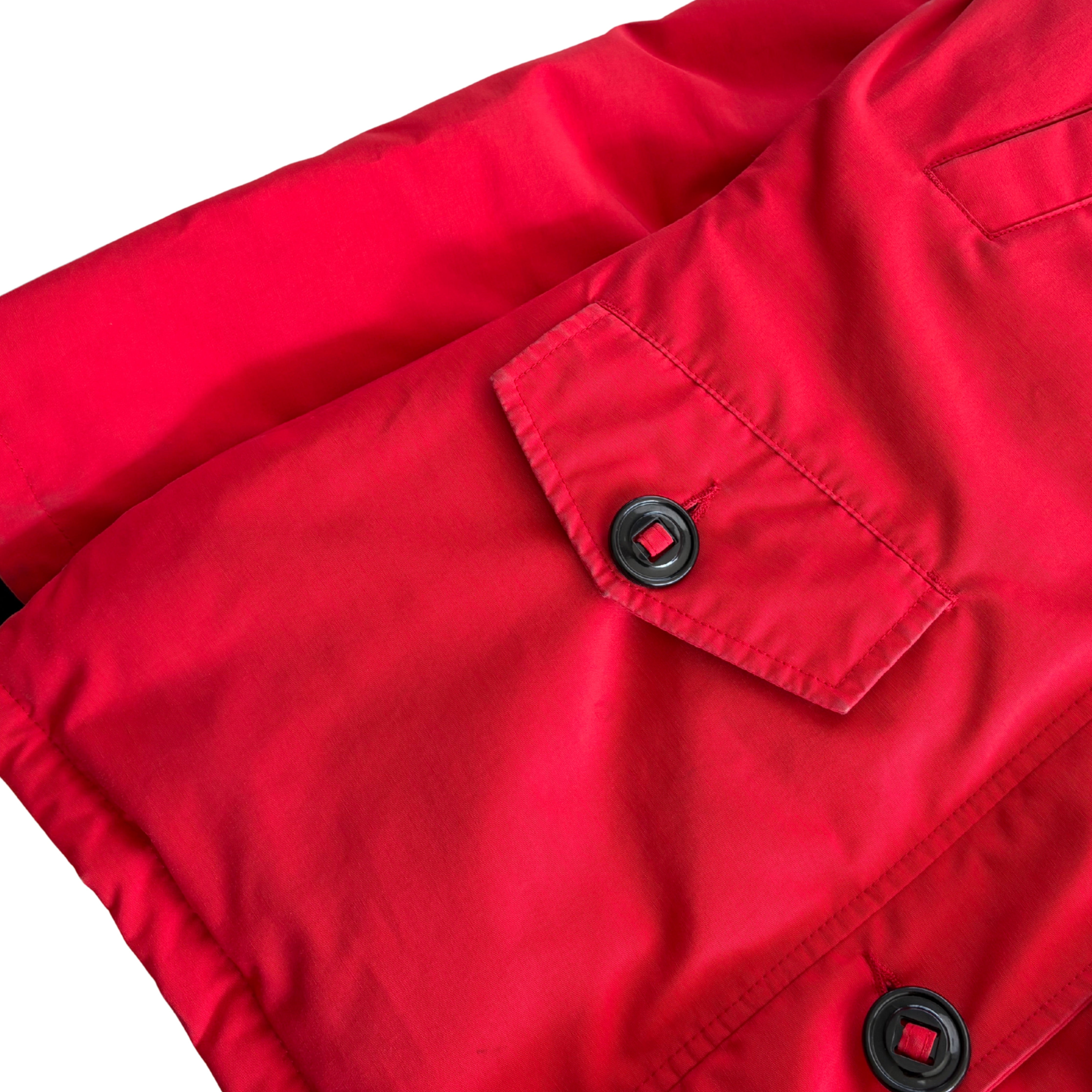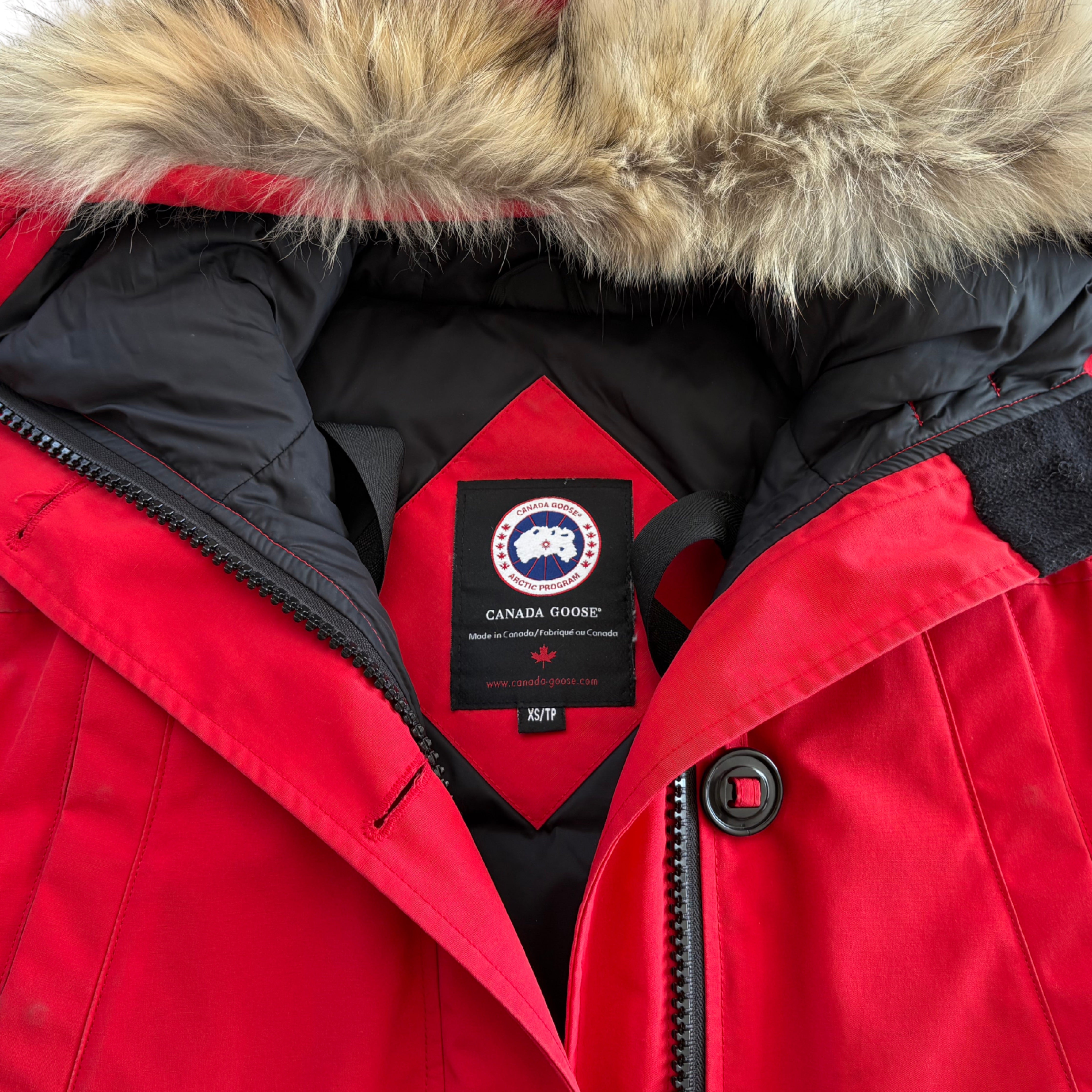 Canada Goose 'Montebello' down filled parka in red with removable coyote fur hood trim. Features two way zipper with button down storm flap, multiple pockets, and embroidered logo patch on the left sleeve.