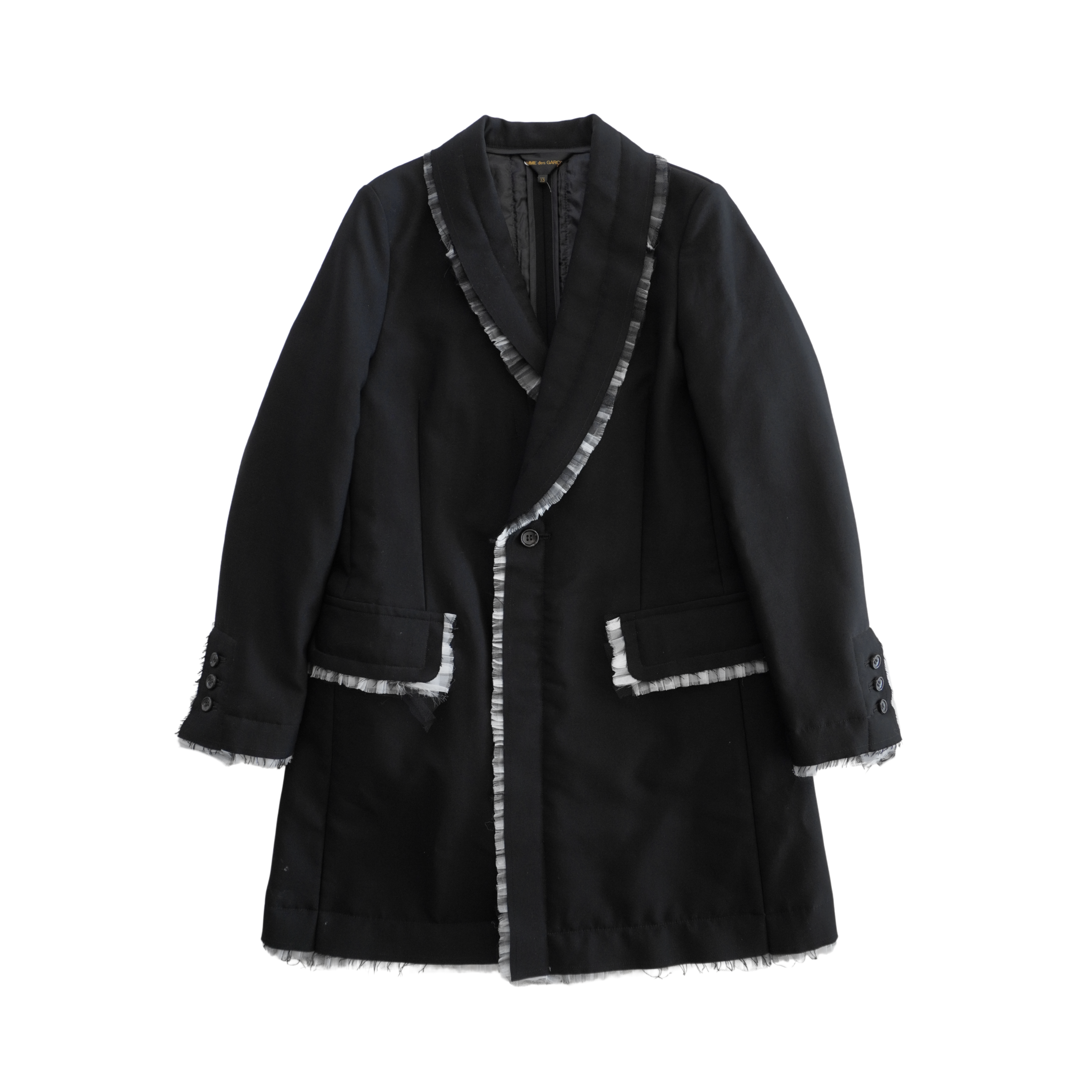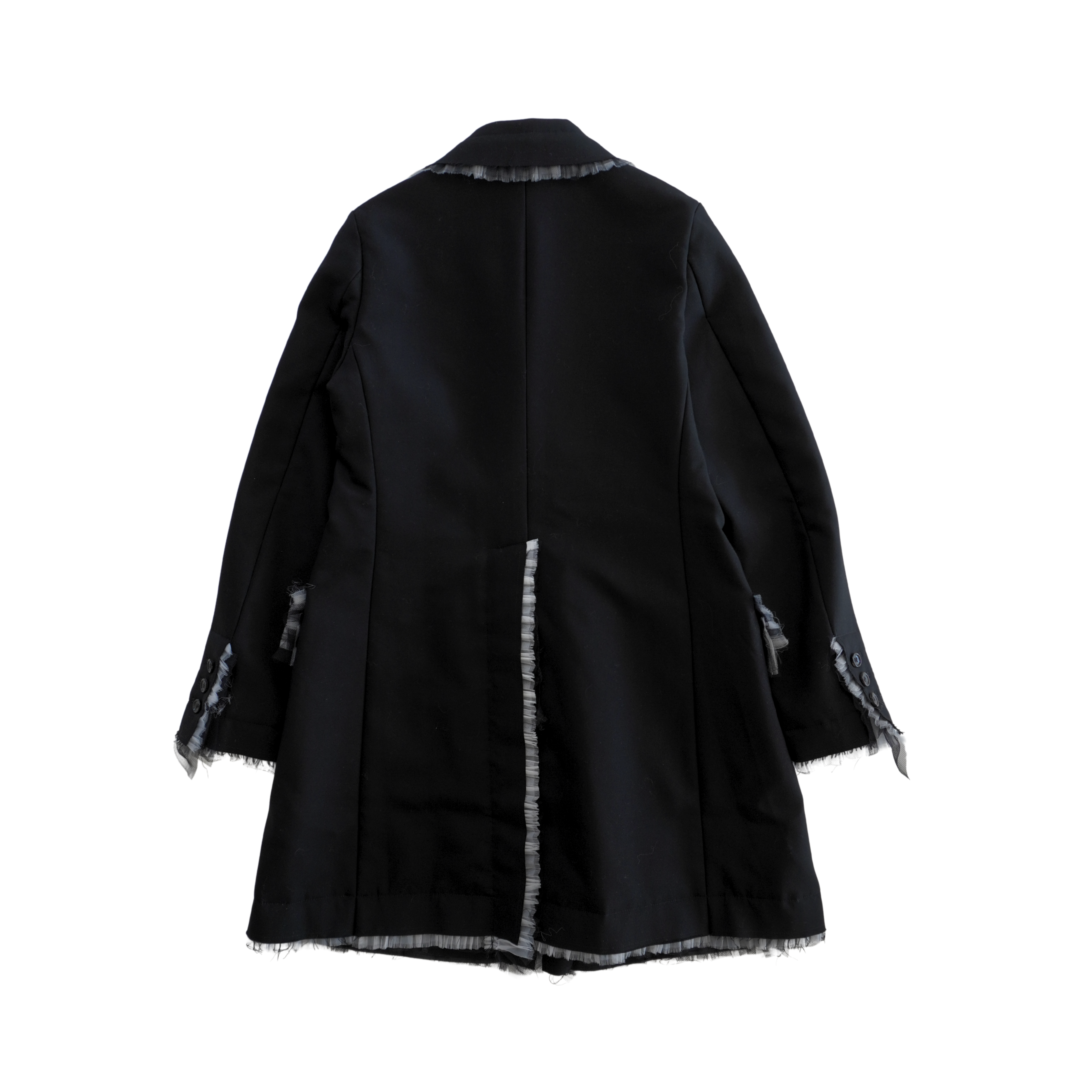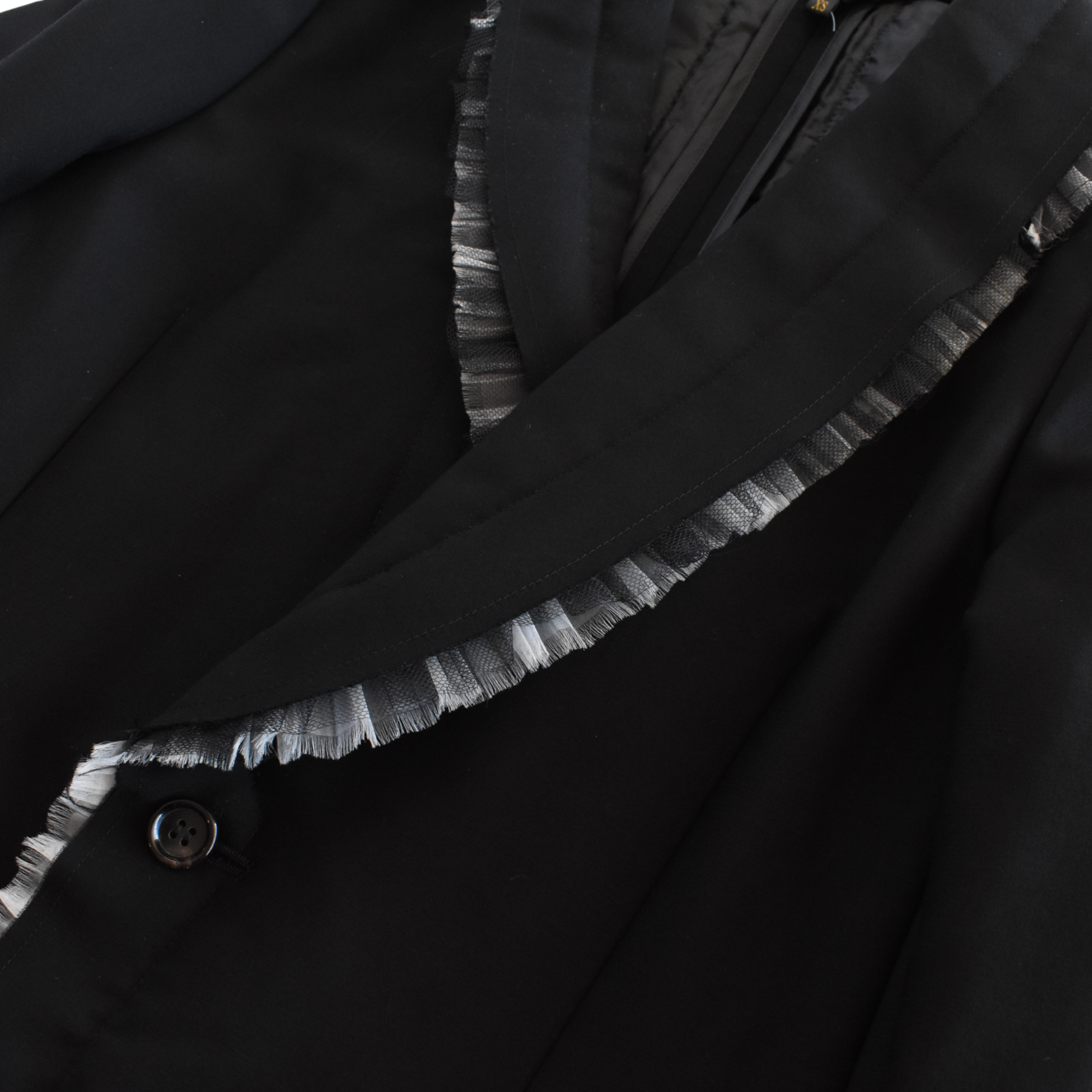 Comme Des Garcons mid length black wool coat with single button closure, flap pockets, and a lightly padded lining. Features raw pleated black and white mesh tulle trim throughout.