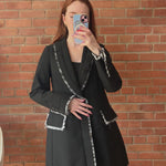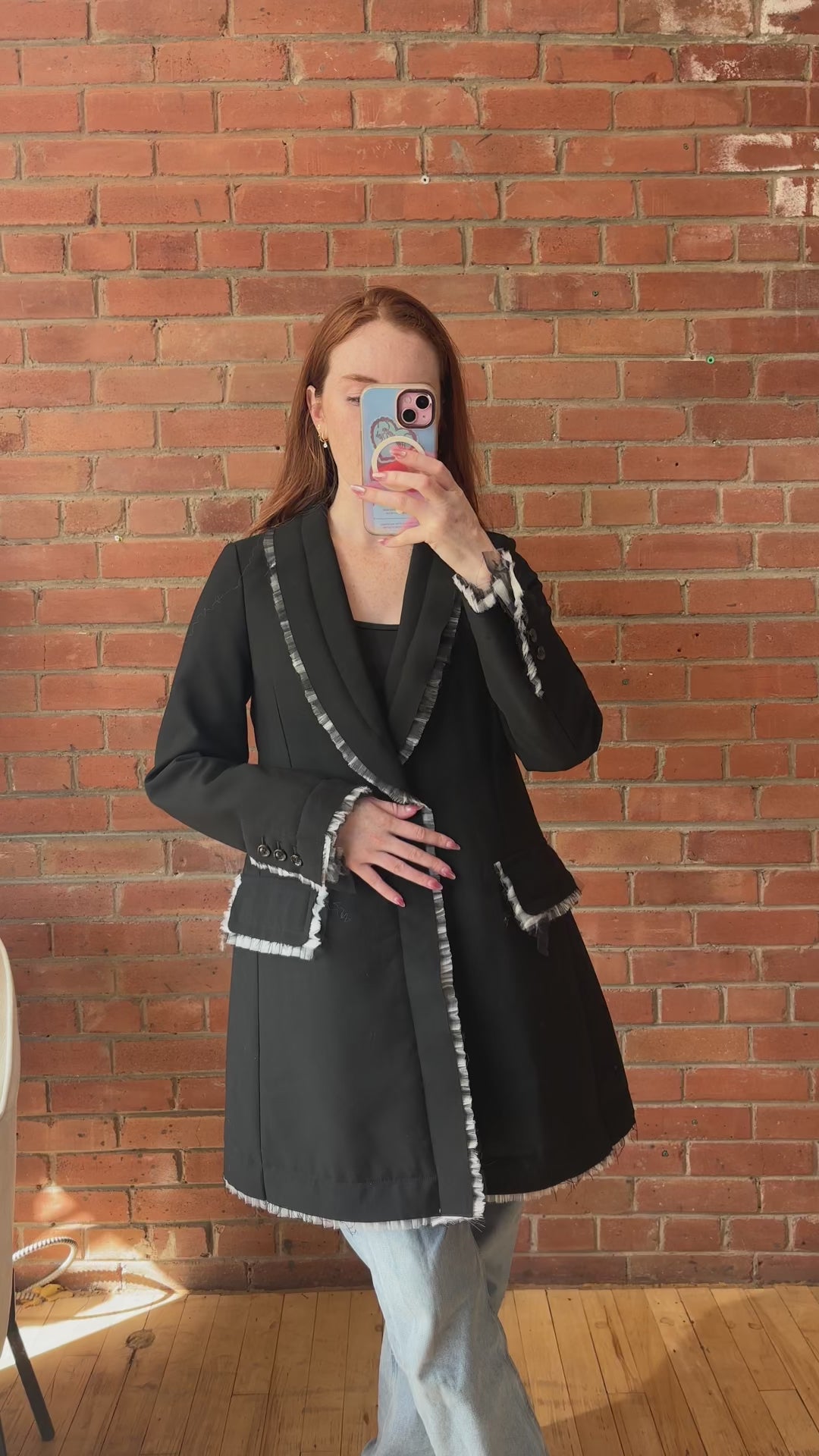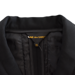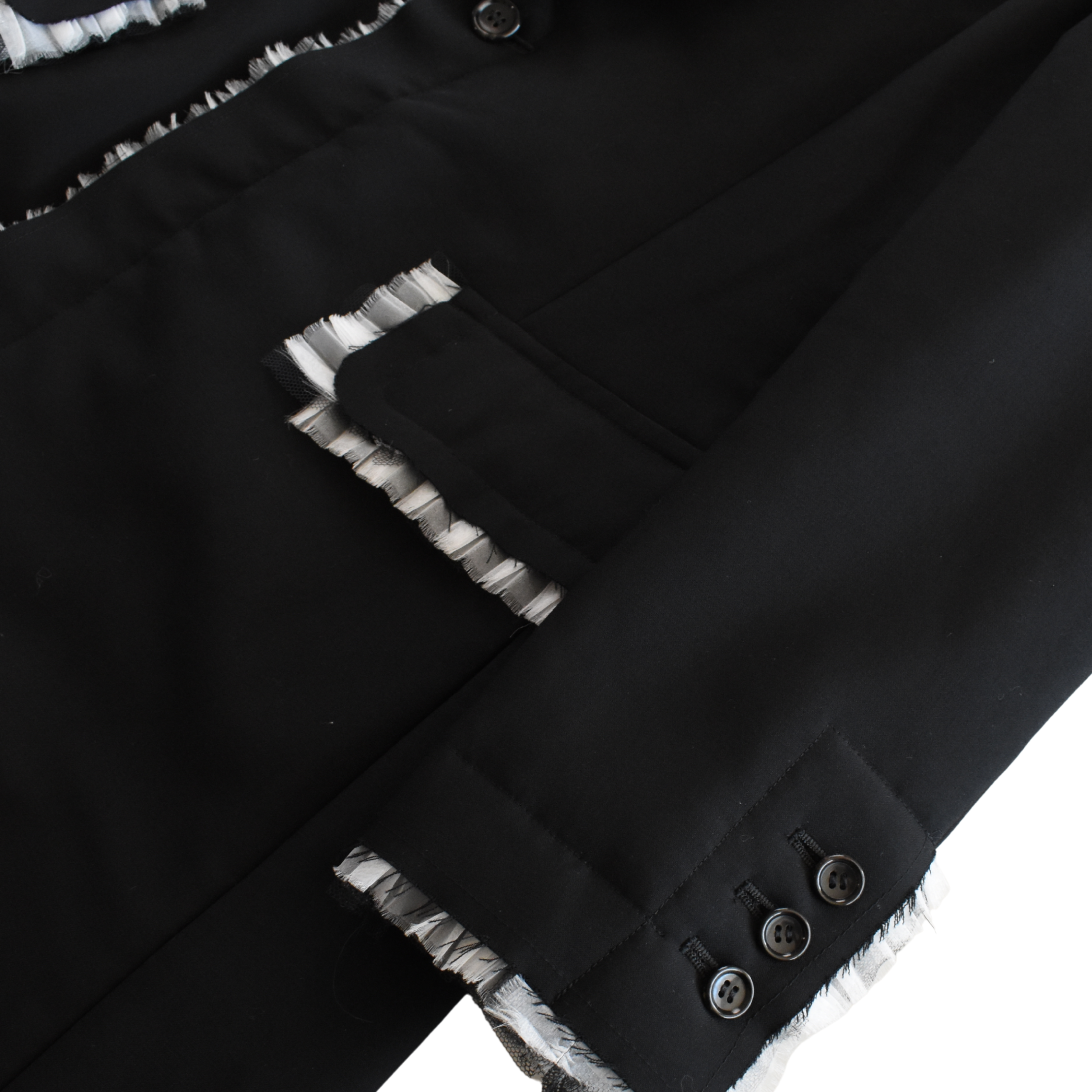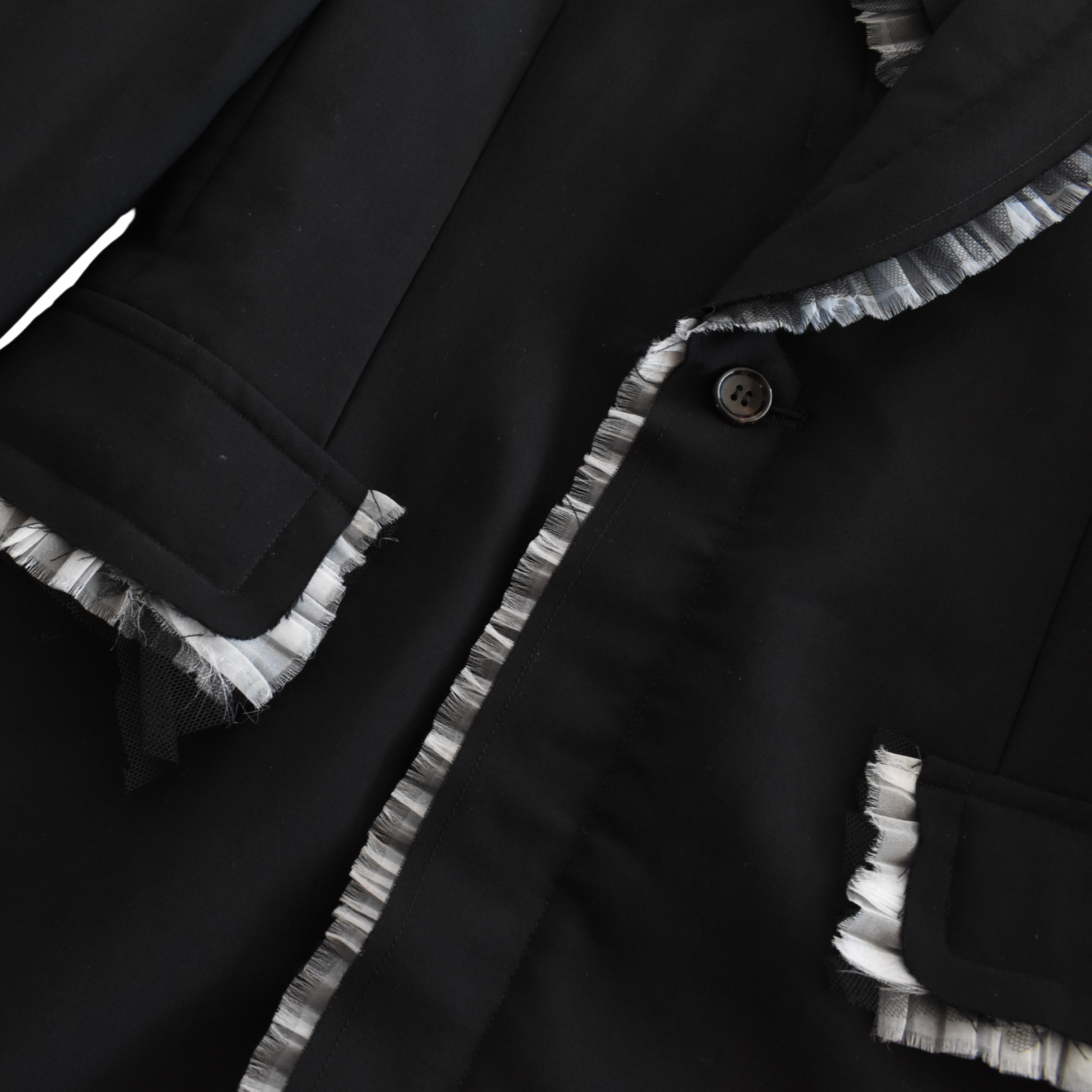 Comme Des Garcons mid length black wool coat with single button closure, flap pockets, and a lightly padded lining. Features raw pleated black and white mesh tulle trim throughout.