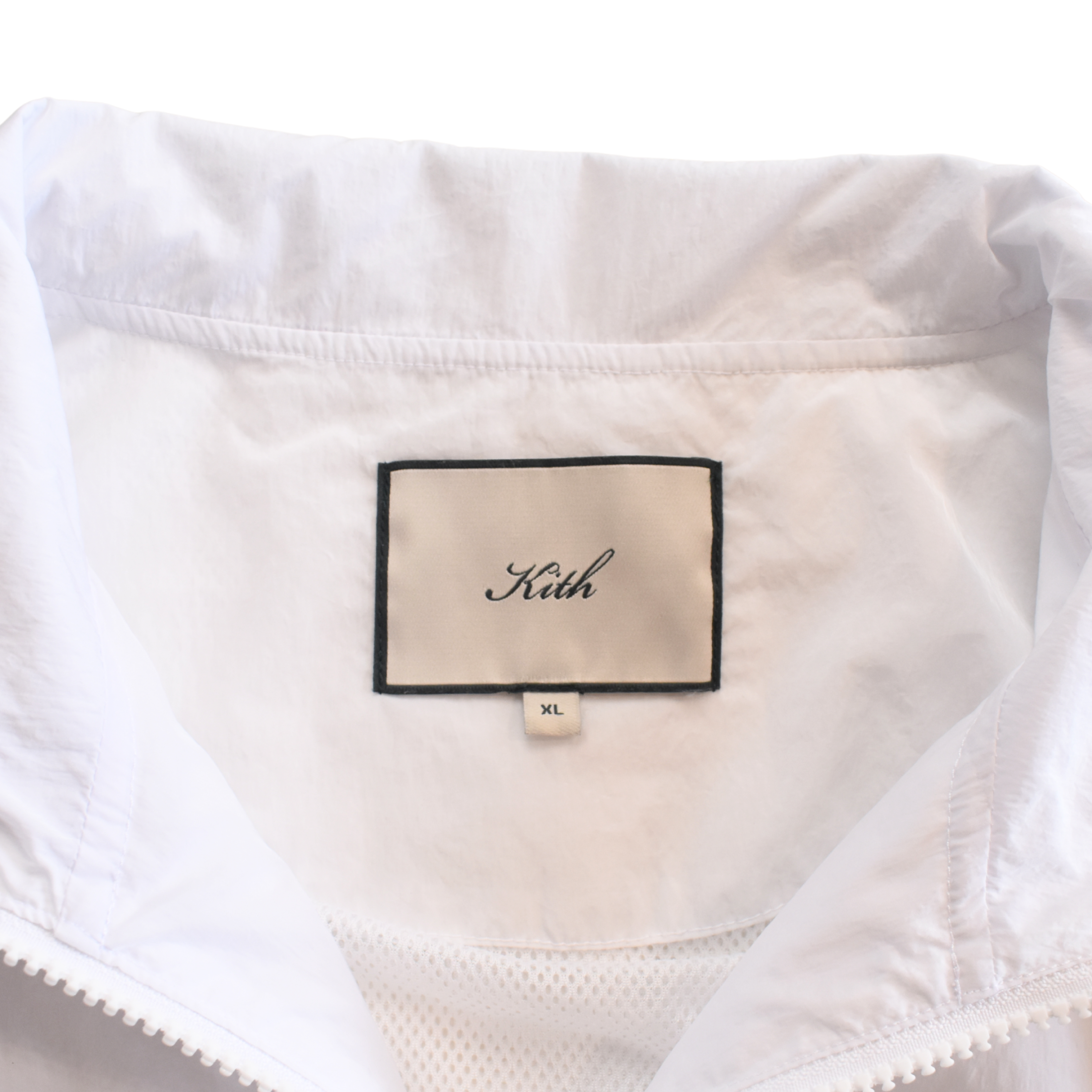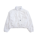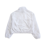 Kith 'Faris' cropped windbreaker jacket in white nylon with a front zip opening, large chest pockets, and an embroidered black logo.