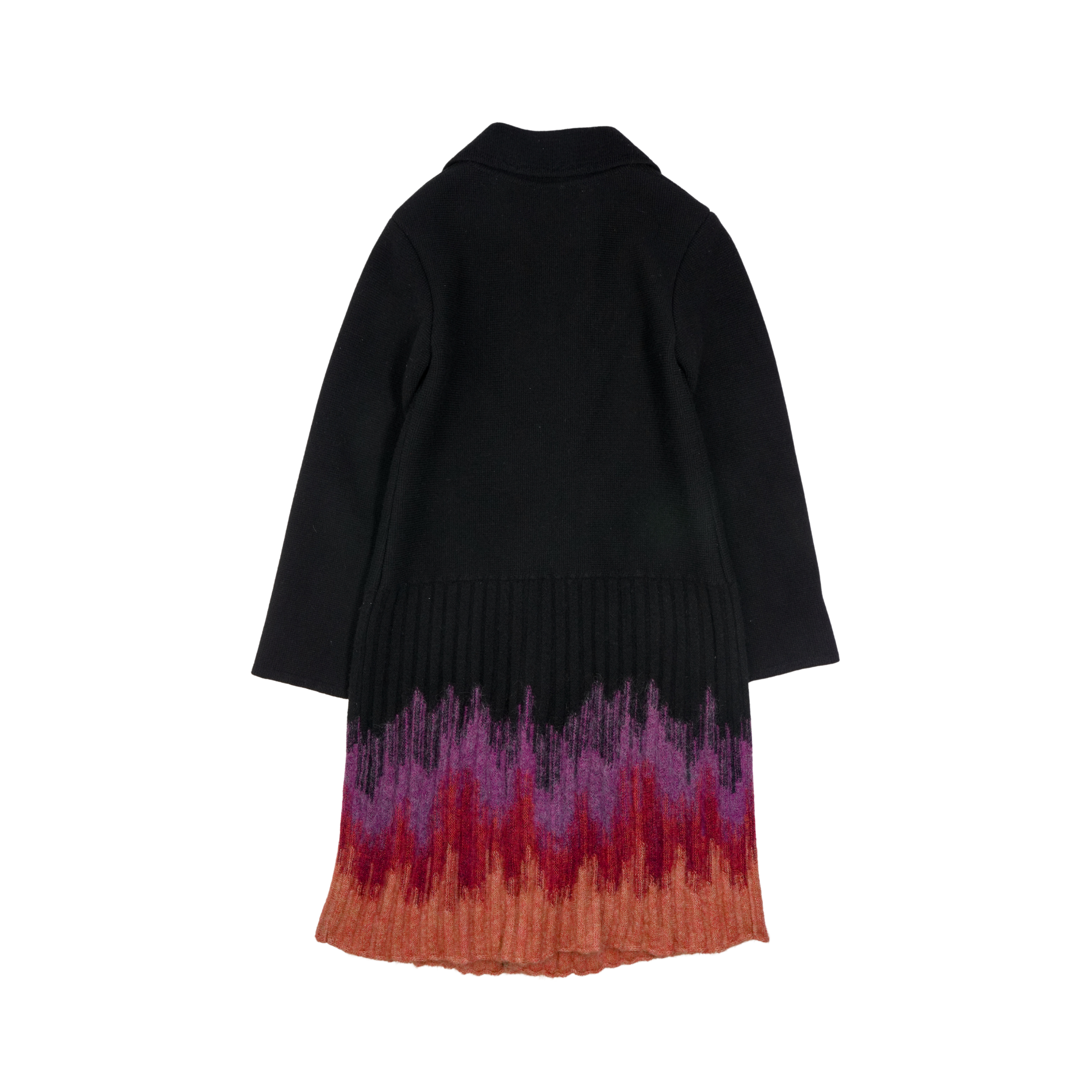 M Missoni double breasted black knit jacket with purple, red, and orange ribbed knit bottom.