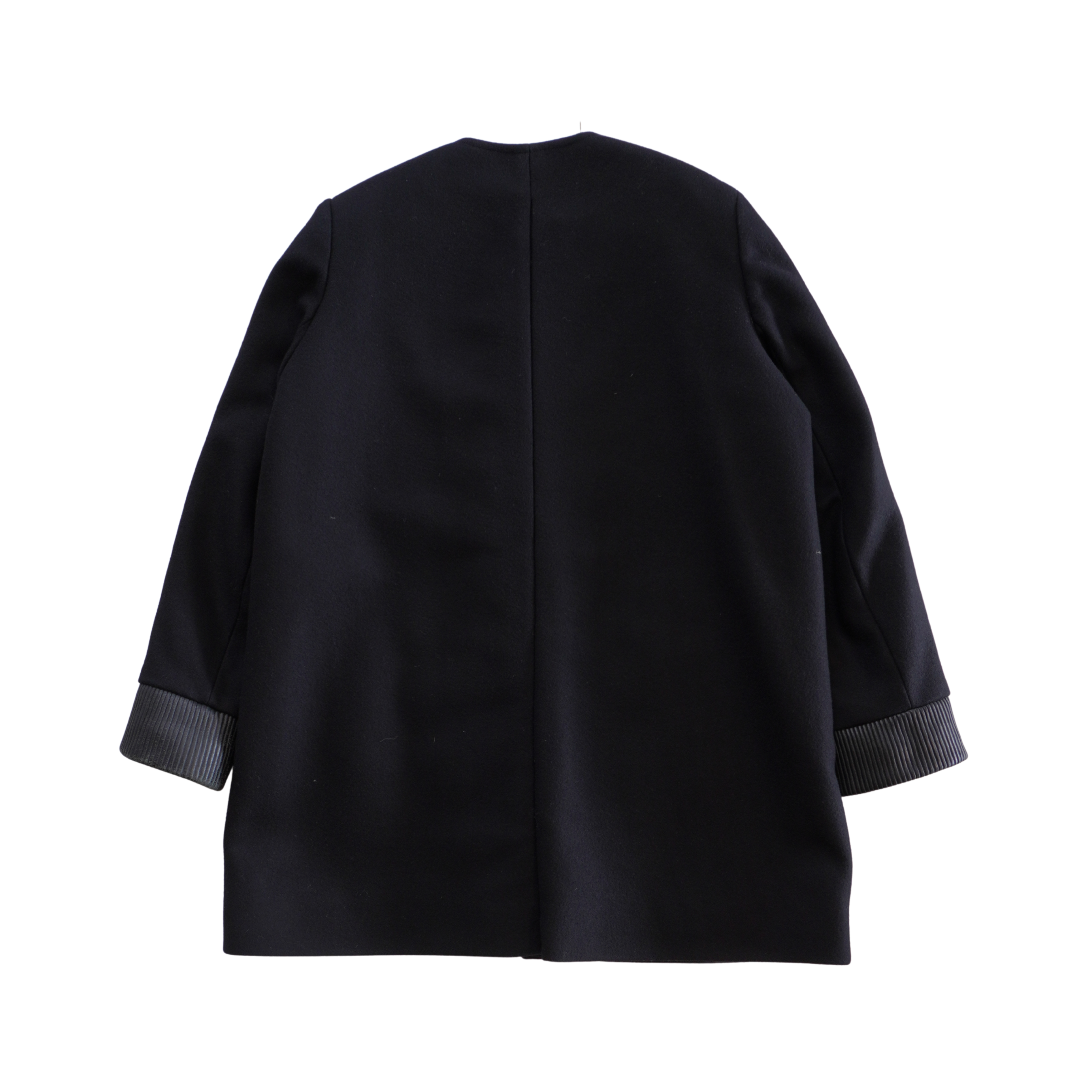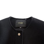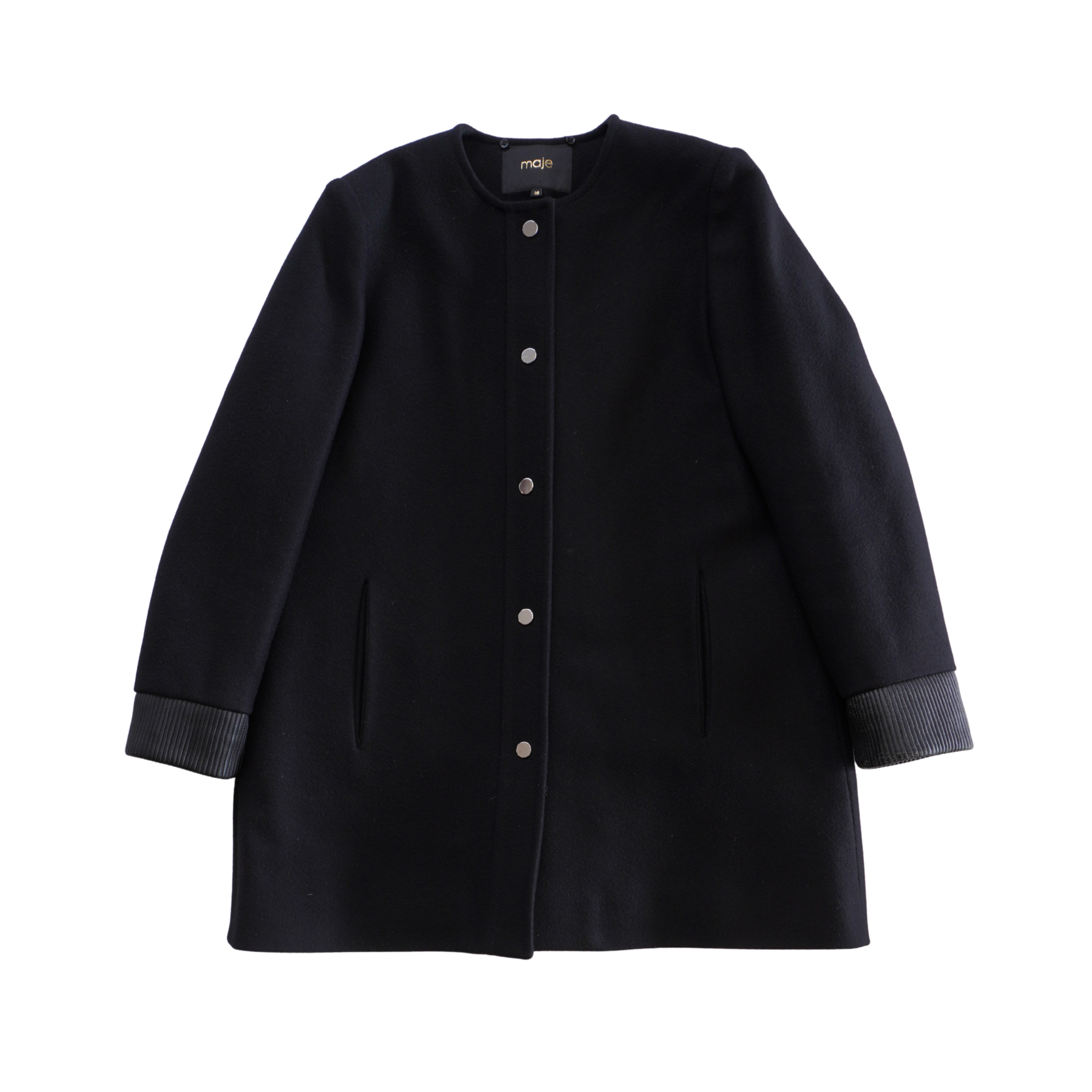 Maje collarless coat in black wool with front snap button closure in silver hardware, ribbed leather cuffs and two front slip pockets. Featuring an optional back box pleat that can be zipped shut.