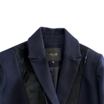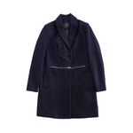 Maje single breasted wool coat in navy wool blend with horizontal silver zipper details at the waist, black fur panels under the collar and double button closure.