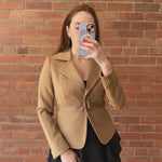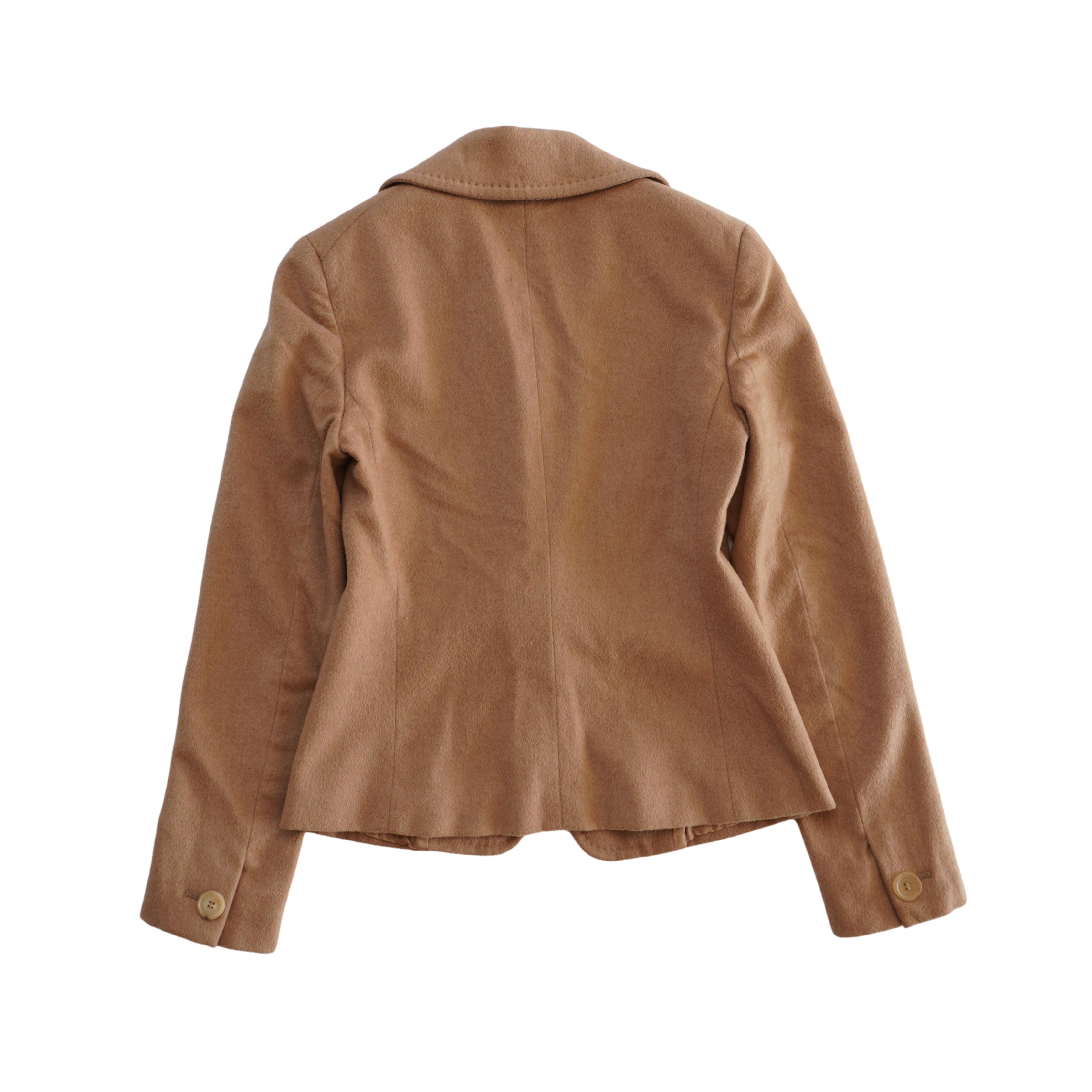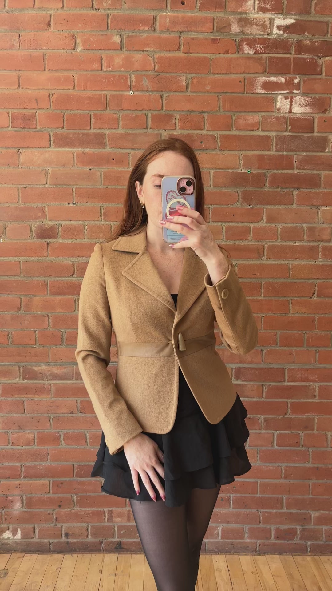 Max Mara camel hair blazer with a single horn toggle closure and tonal leather panel at the waist.