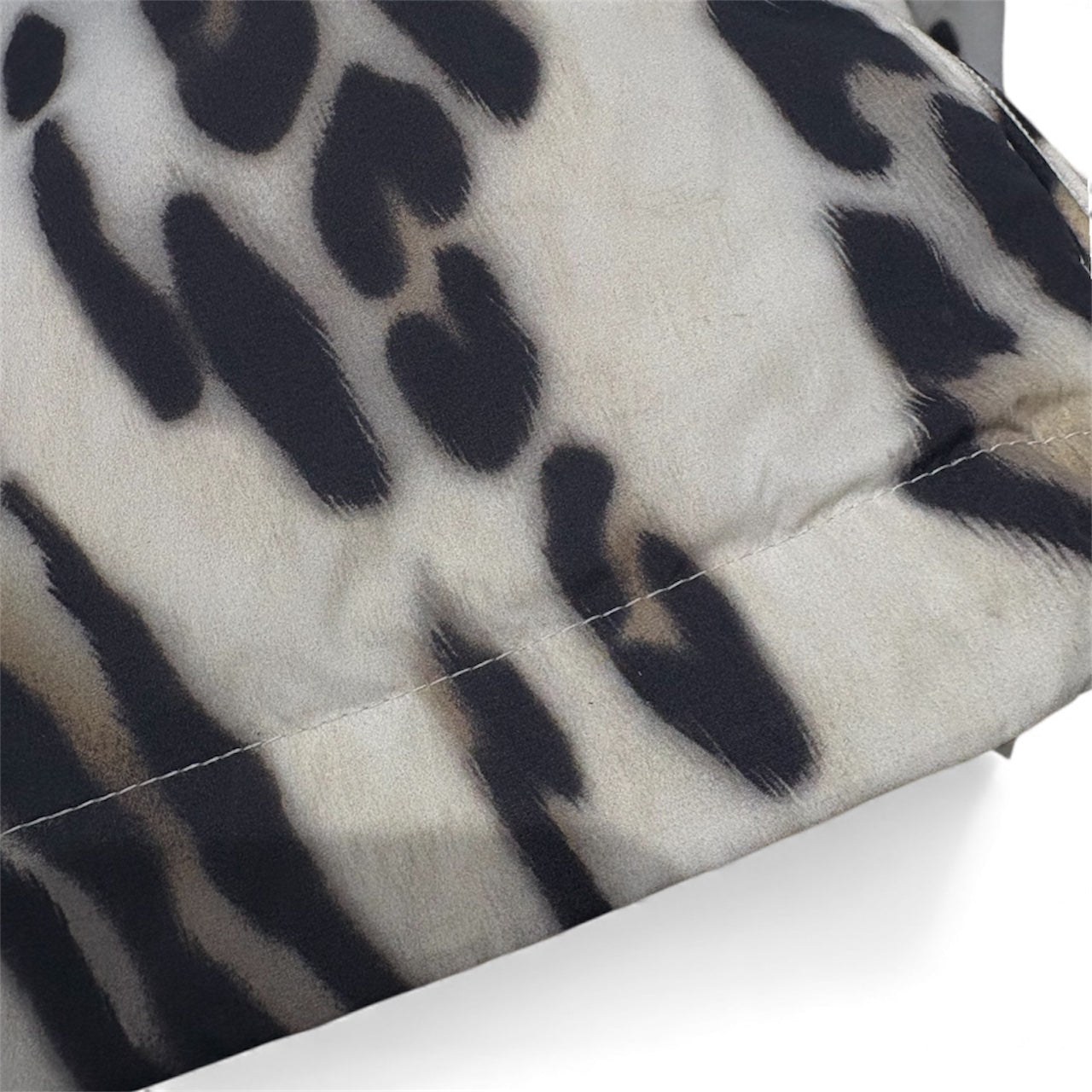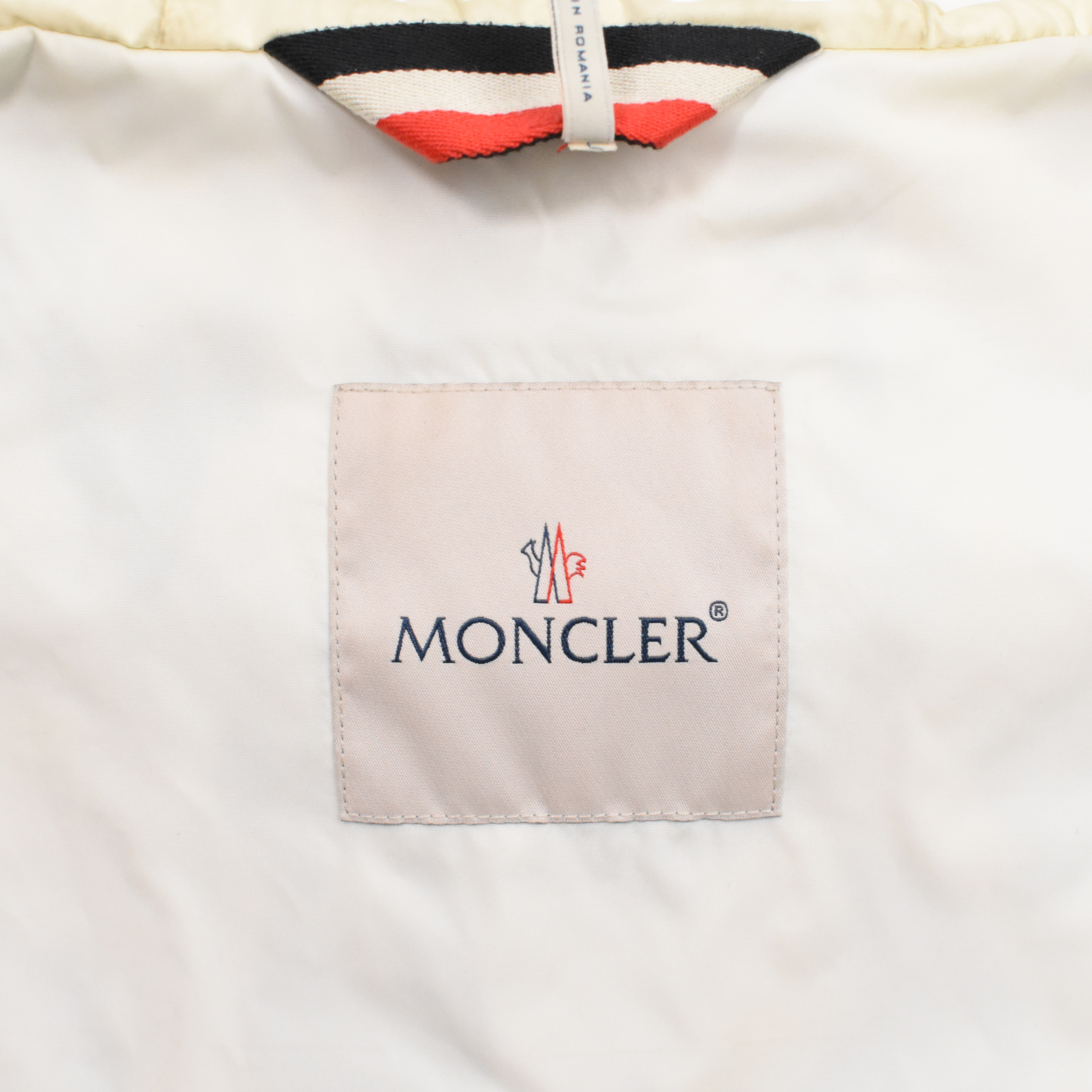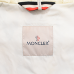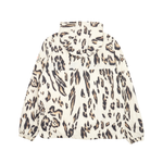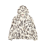 Moncler Genius '1952 Jau' hooded shell jacket in cream with an all-over 'Ocelot' animal print. Features a double zip front closure, zip front pockets, an elastic drawcord at bottom hem and in the hood, and a felt logo patch on the arm.