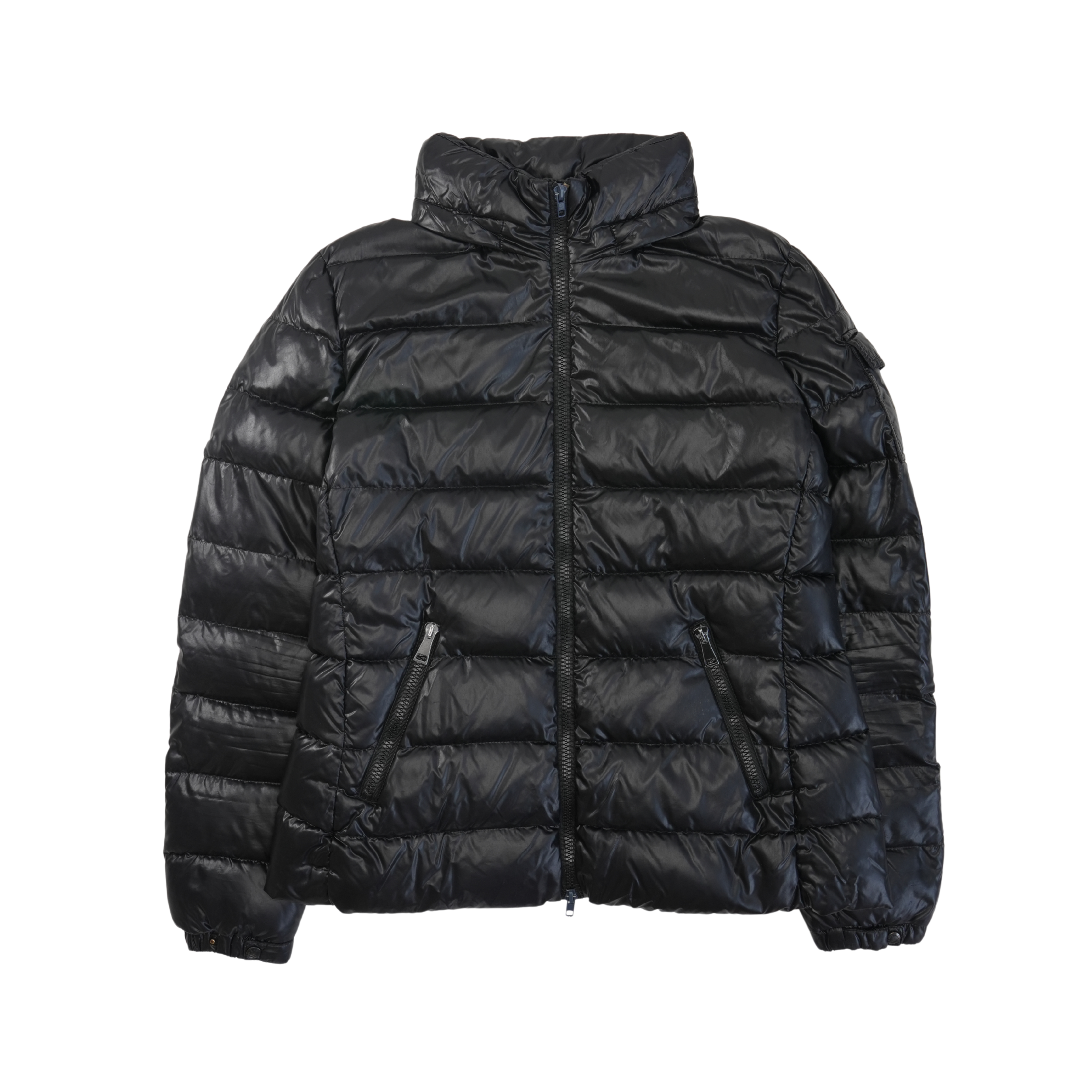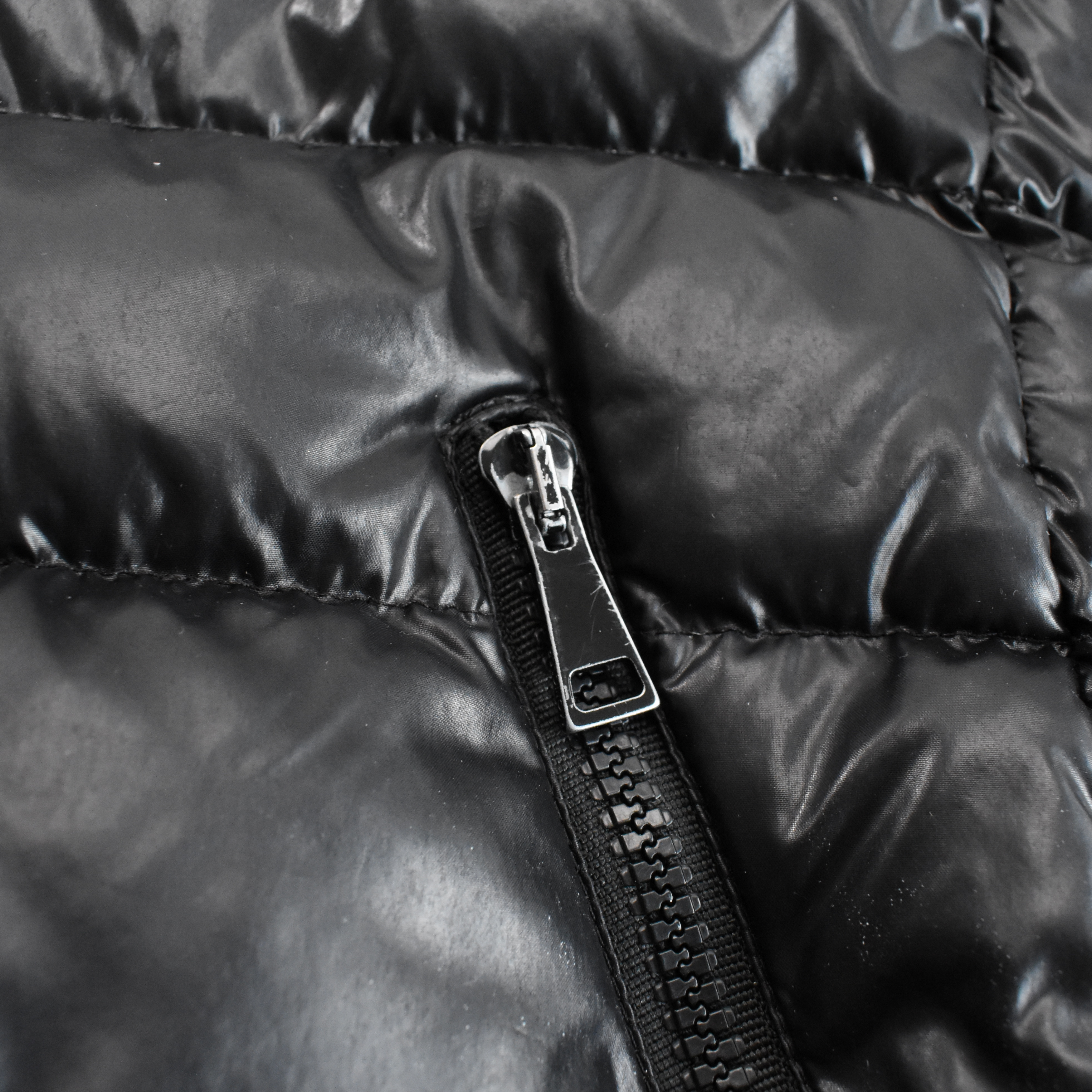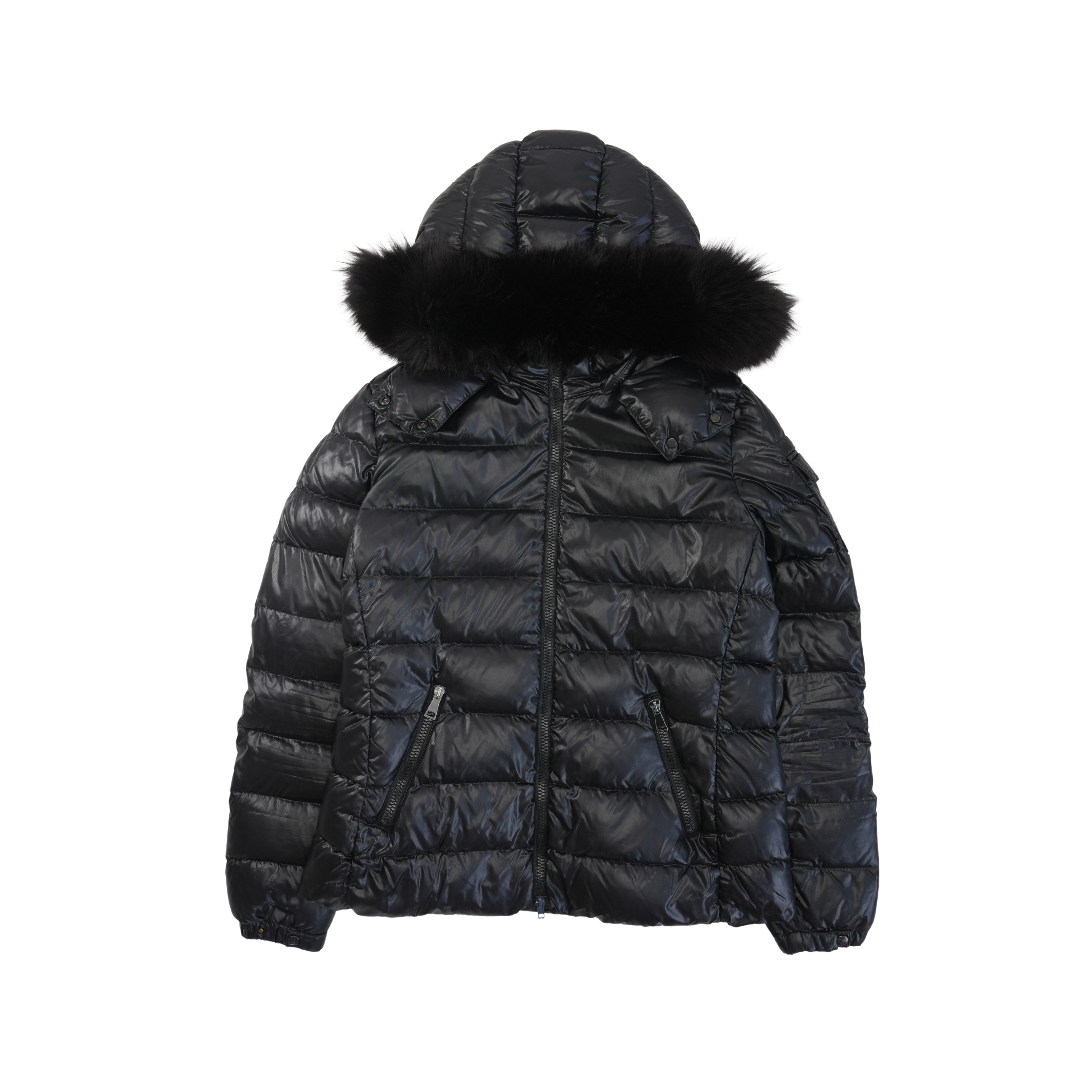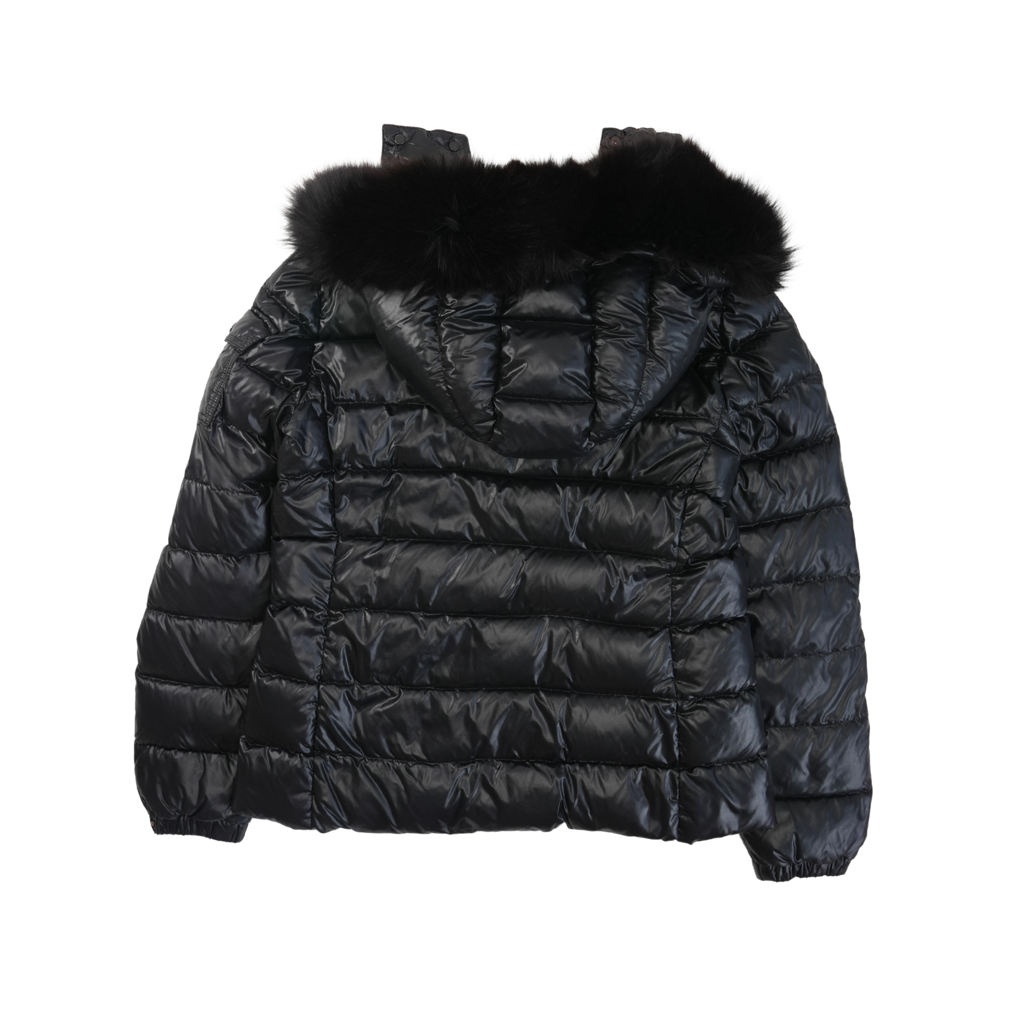 Moncler 'Maya' puffer jacket in black nylon with front zip opening in black hardware, side zip pockets, snap flap pocket on arm and detachable hood. Featuring removable dark brown fur trim on hood.