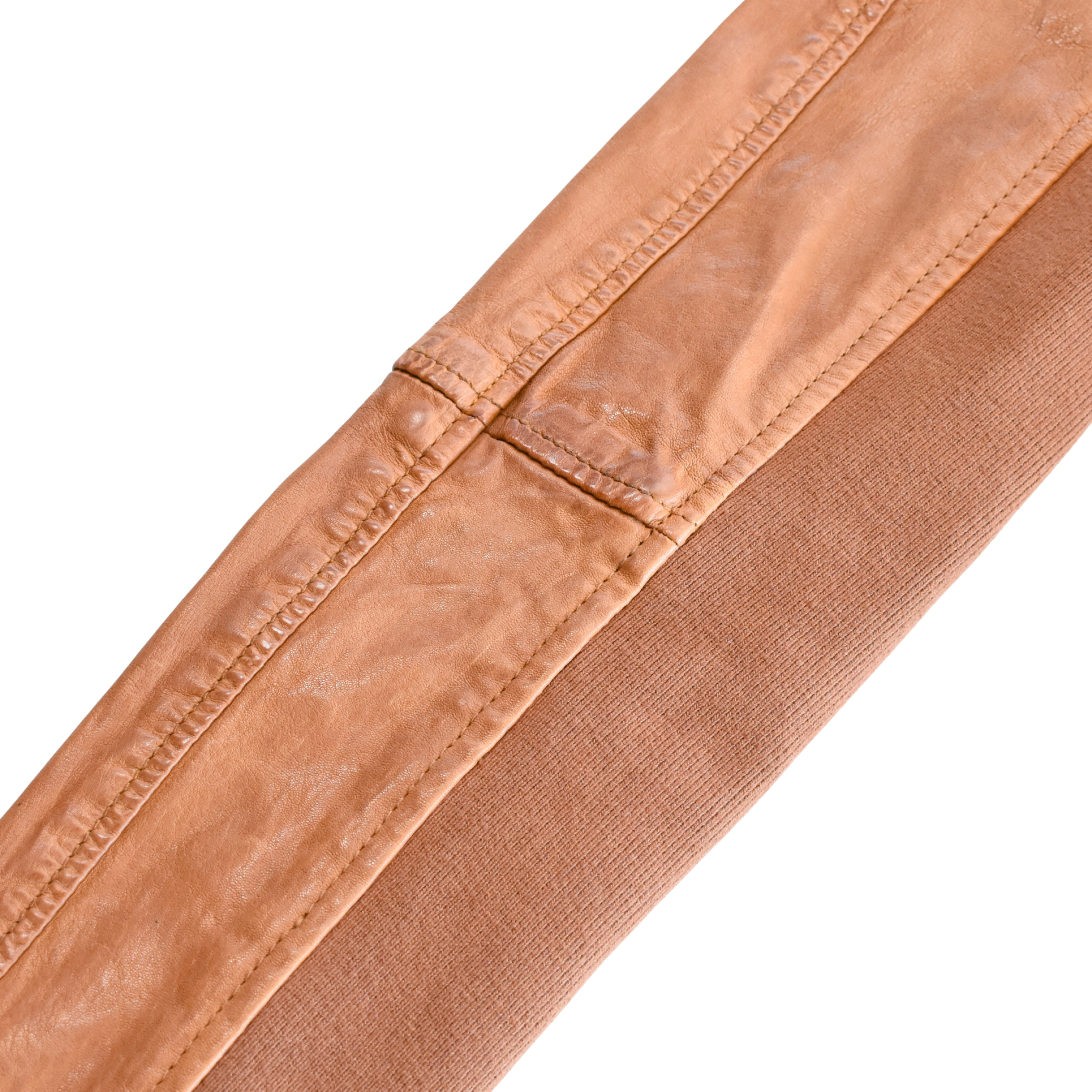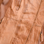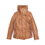 Nicholas K 'Brock' jacket in distressed light brown leather with ribbed poly side panels and sleeves, a hidden front zip and button closure, zip pockets, and a cowl collar.