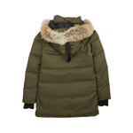 Nobis 'Meredith' mid-length parka jacket in an olive green polyester shell with four pocket styling, removable fur trim, thick ribbed cuffs with thumb openings and covered zip closure.