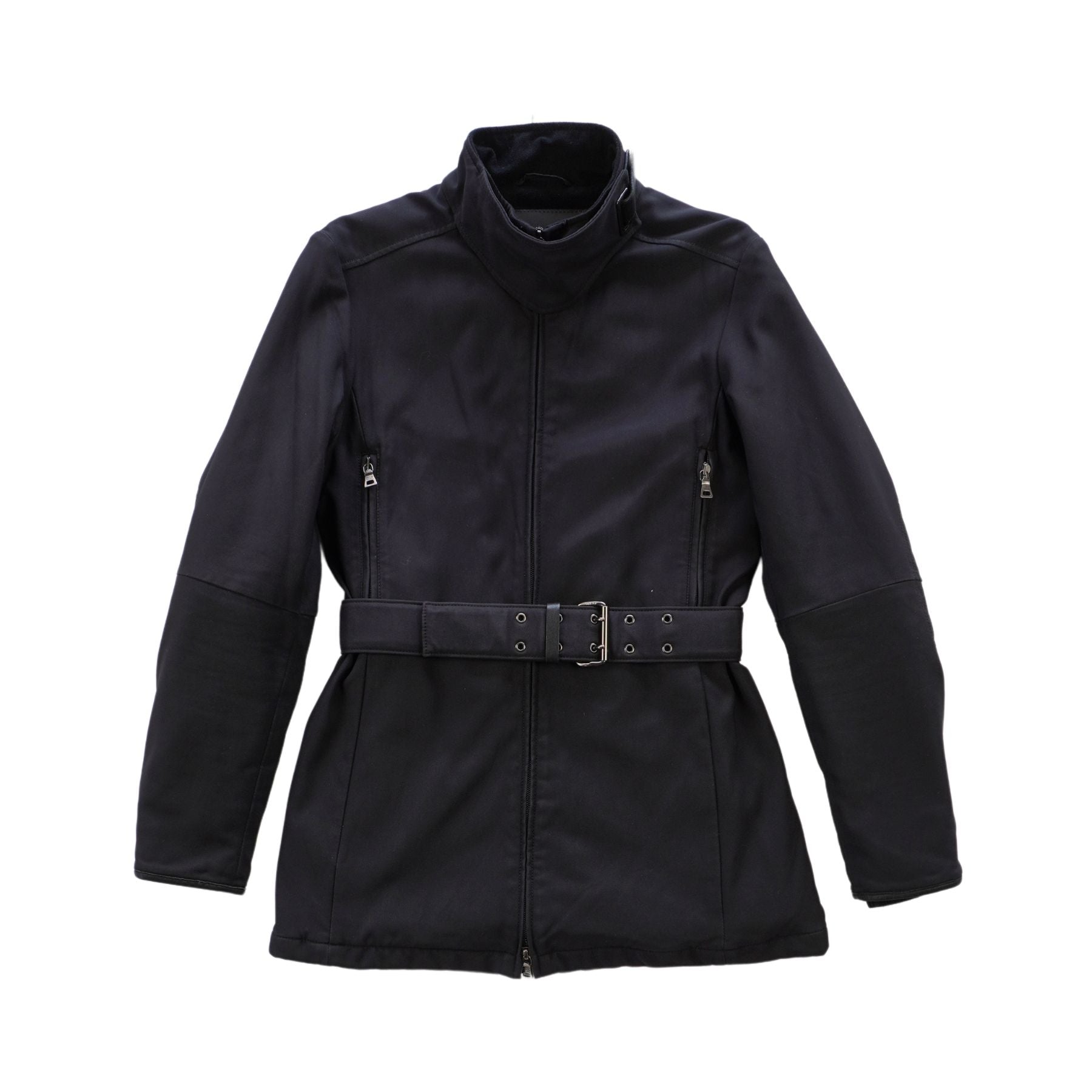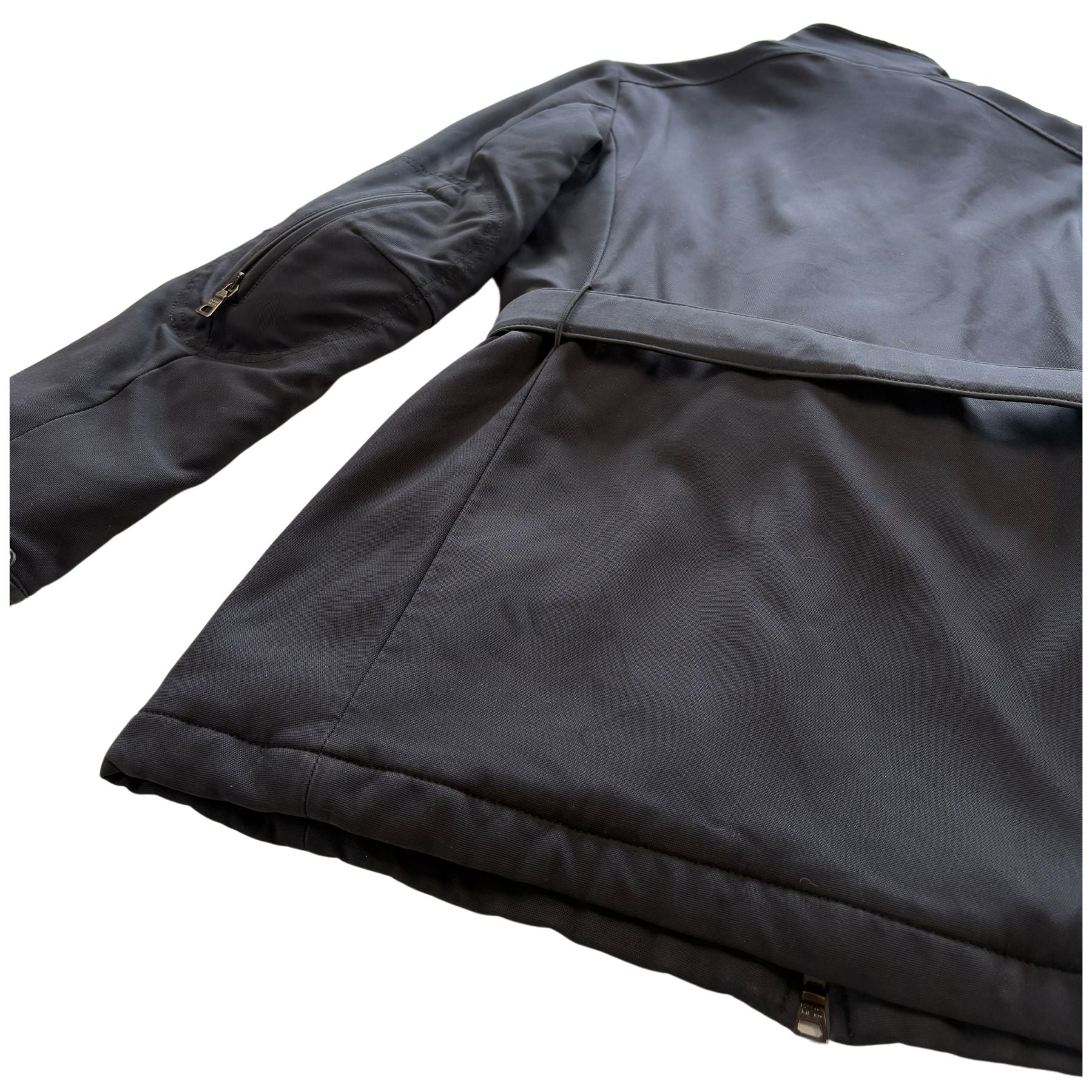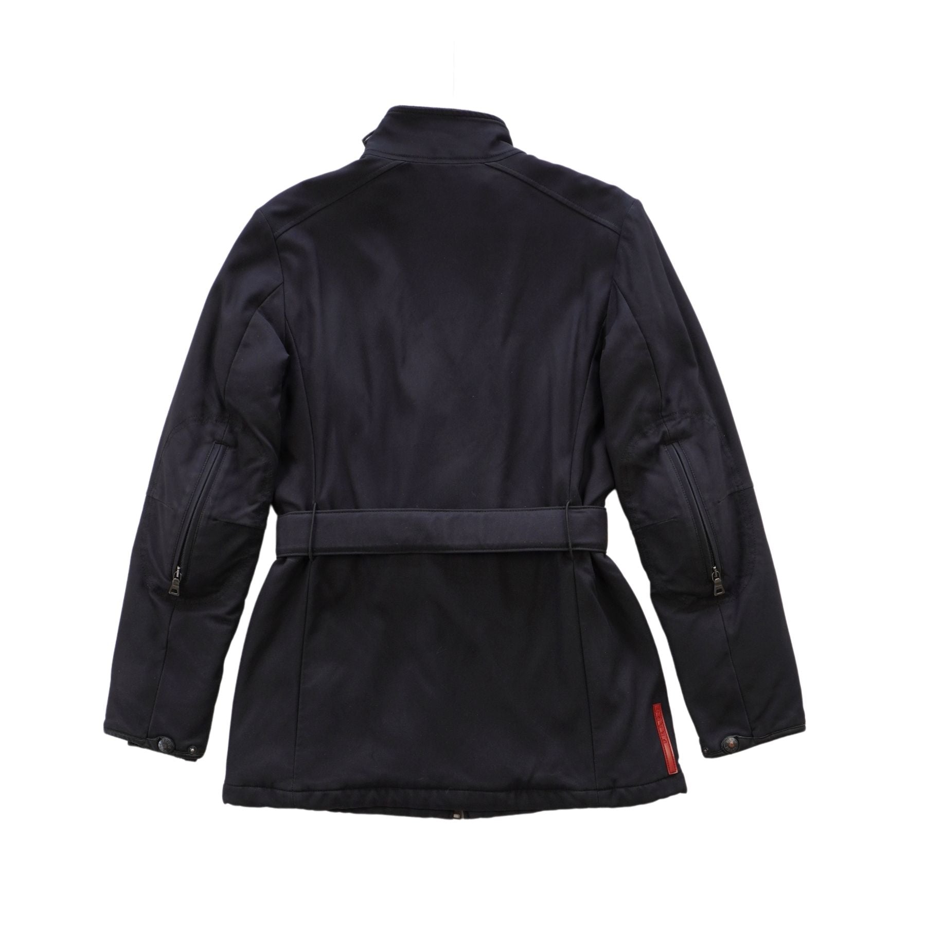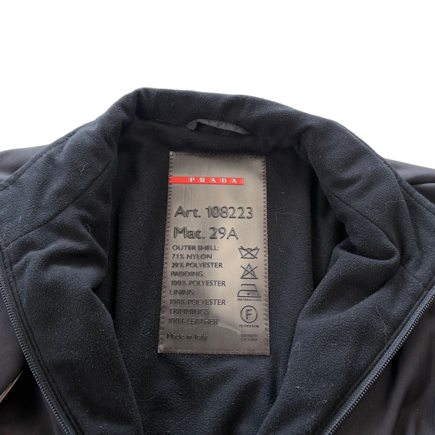 Prada fitted jacket in black nylon with a black fleece lined interior. Features an adjustable belt at the waist, a double-zip closure, an adjustable high-neck collar, side zip pockets, removable elbow pads, gunmetal hardware, and elasticized inner cuff lining.