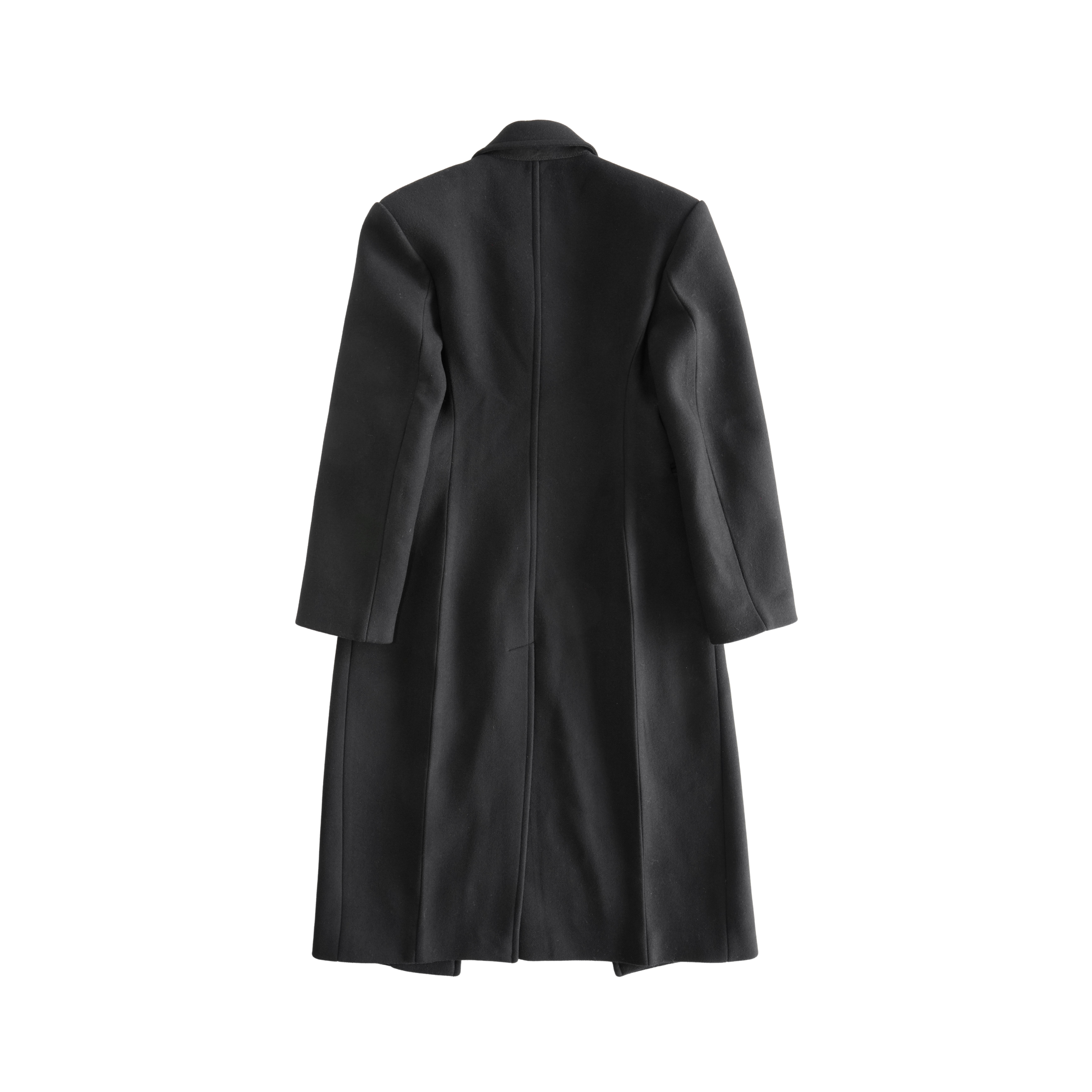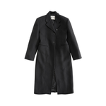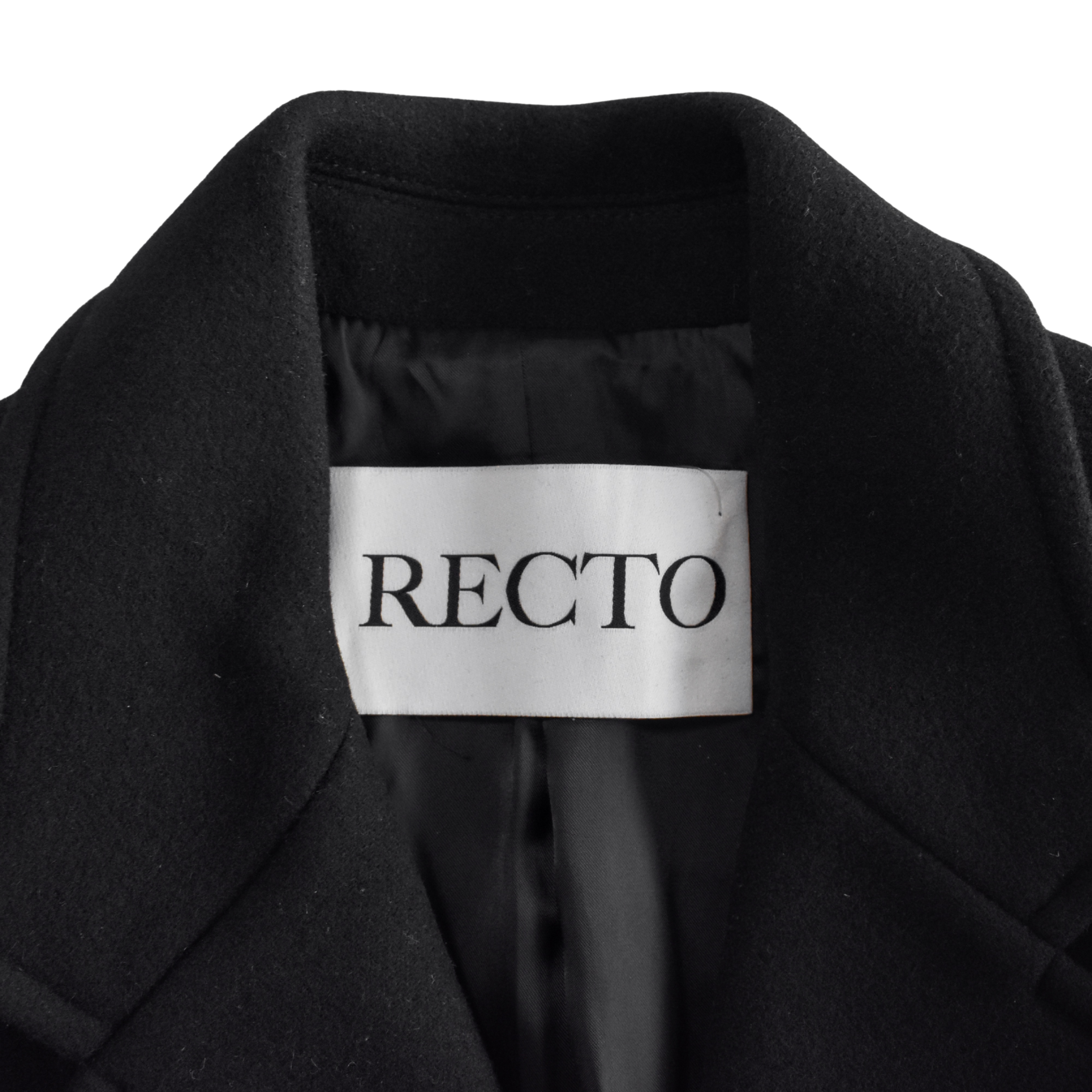 Recto long black wool coat with two button closure, flap pockets, and a notched collar. Features darting at the waist and a front slit.