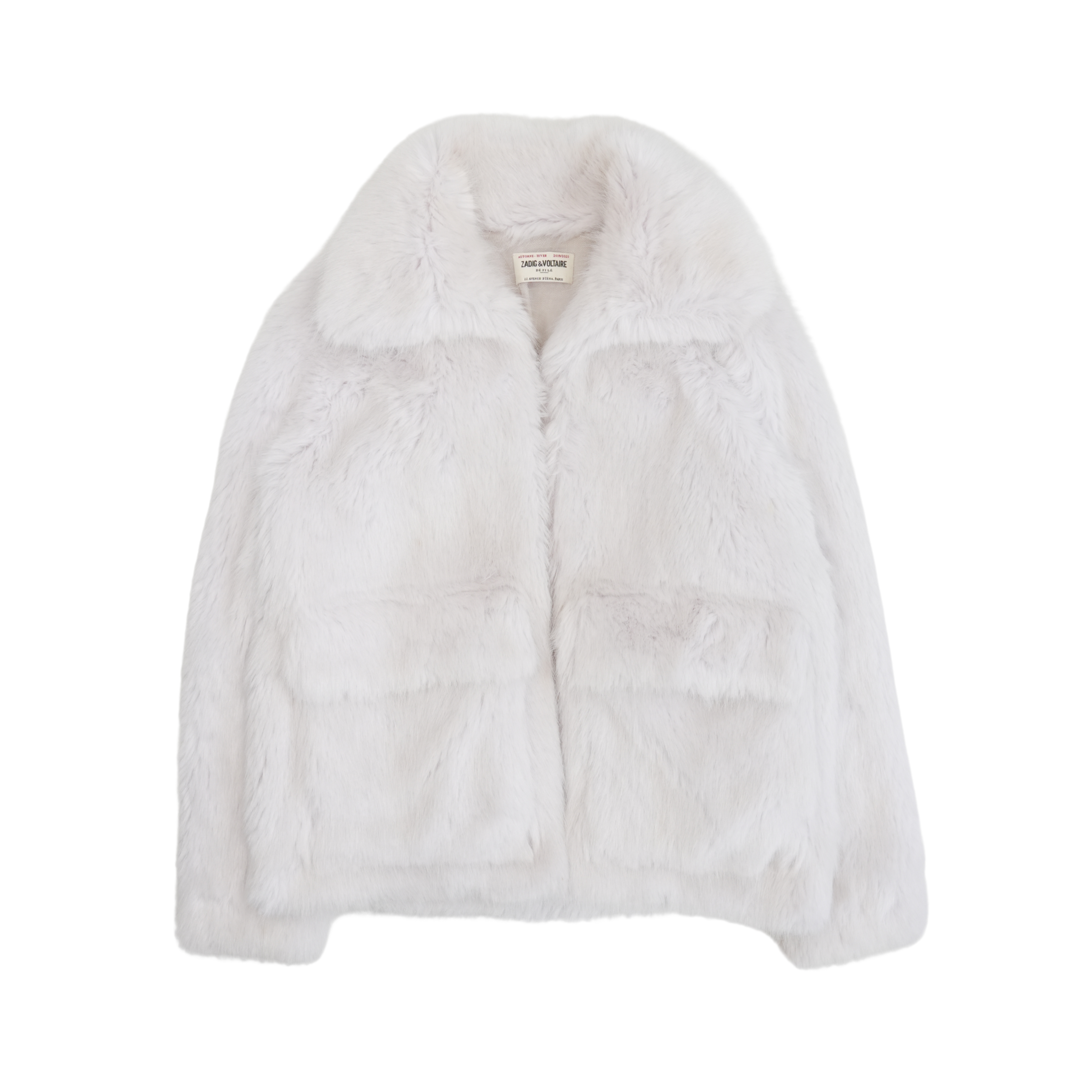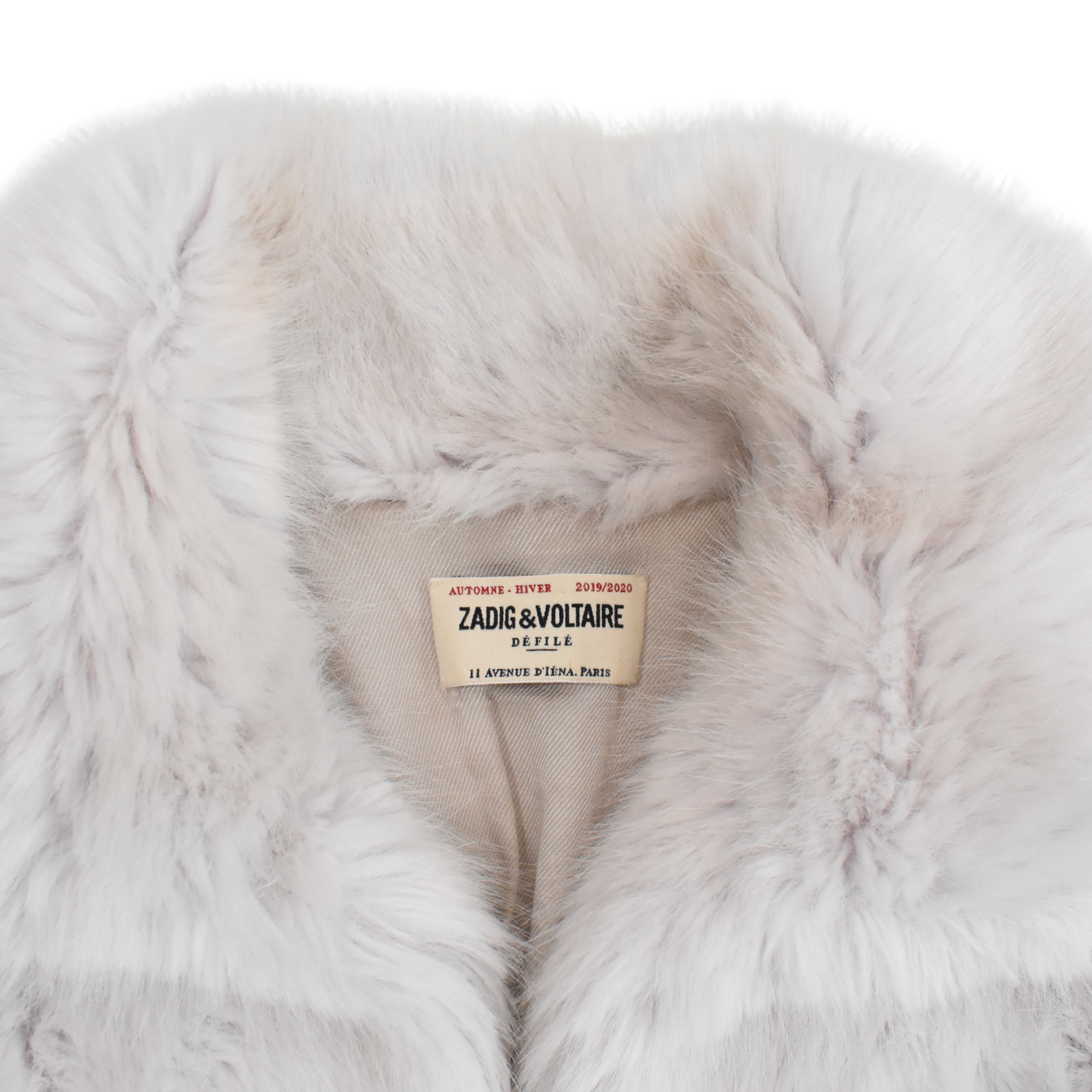 Zadig & Voltaire faux fur coat in light grey with pointed collar flap pockets and hook and eye closure.