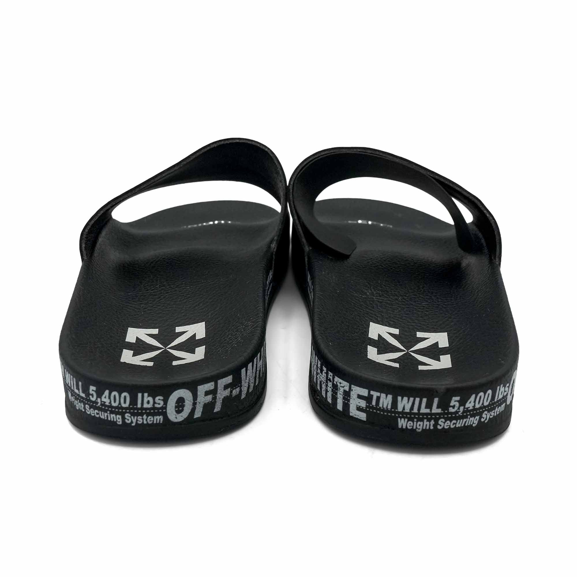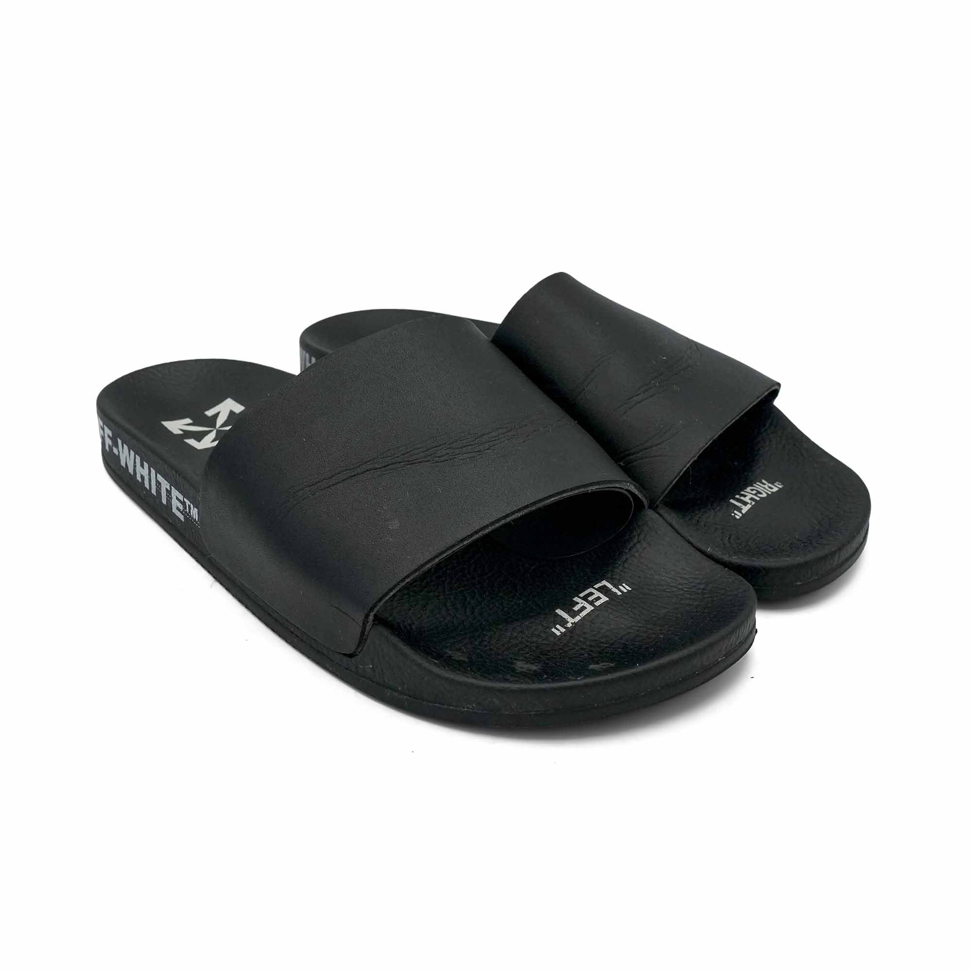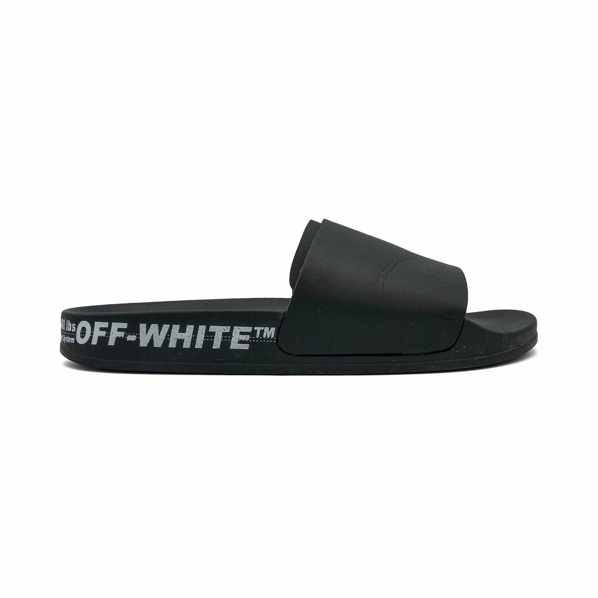 OFF-WHITE pool slide sandals in black rubber with white logo text along the heel of the soles.