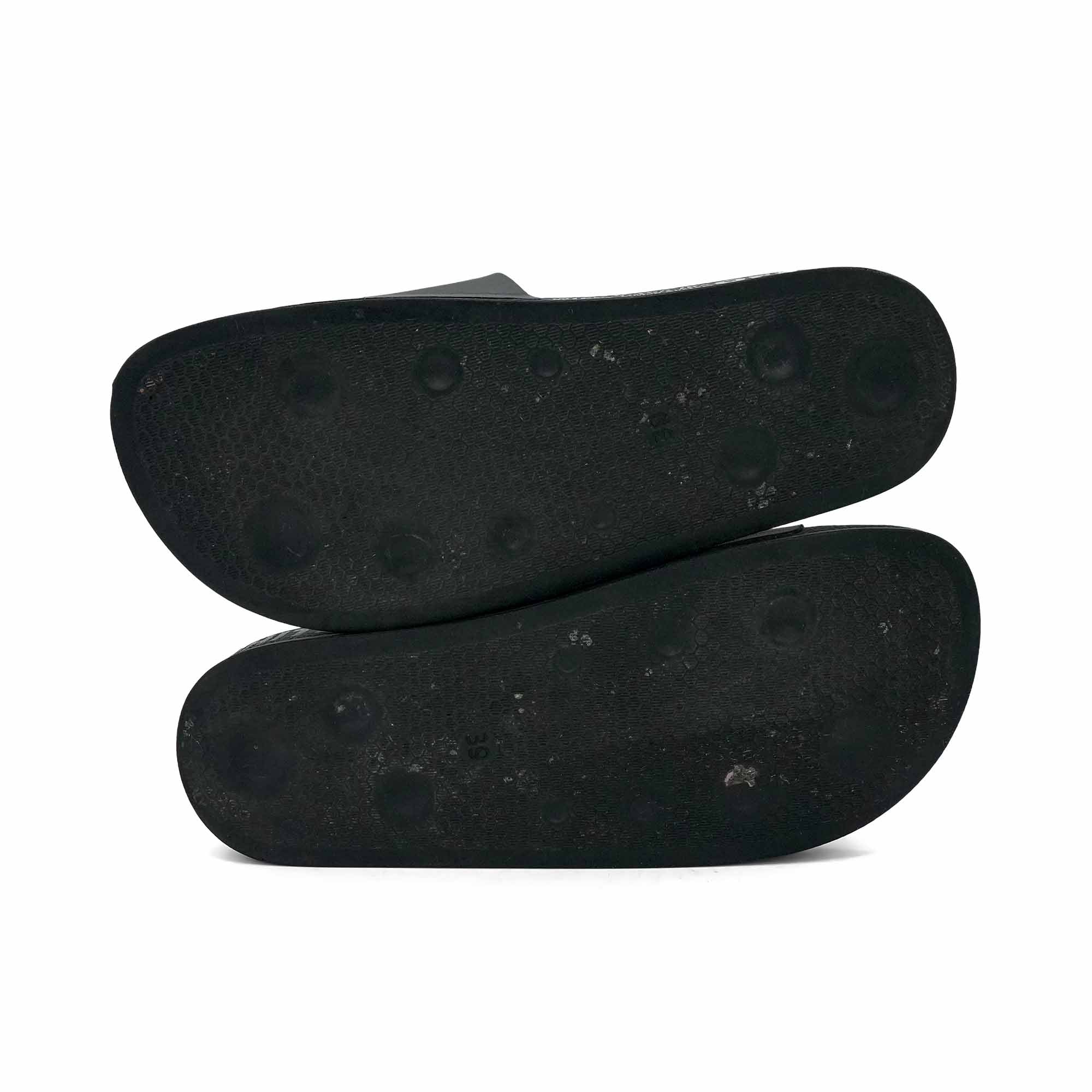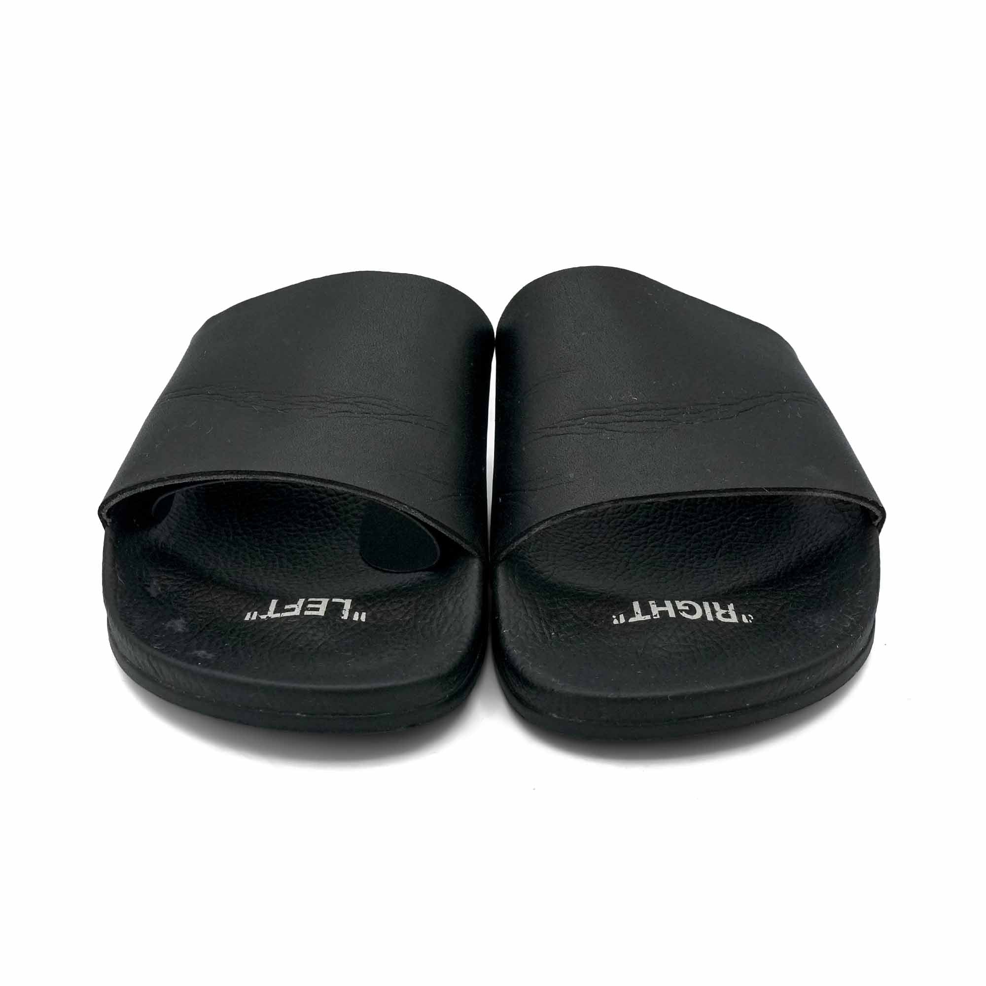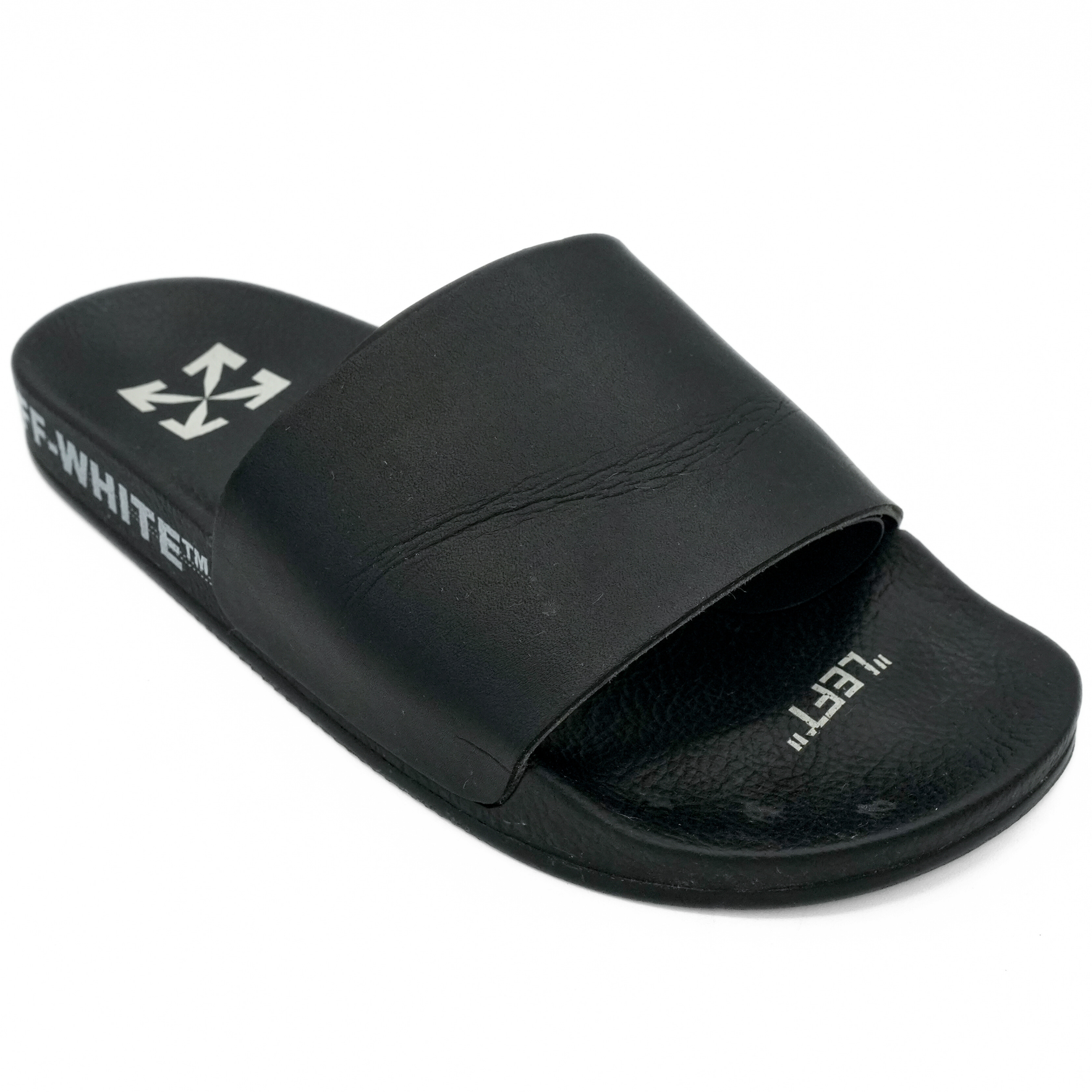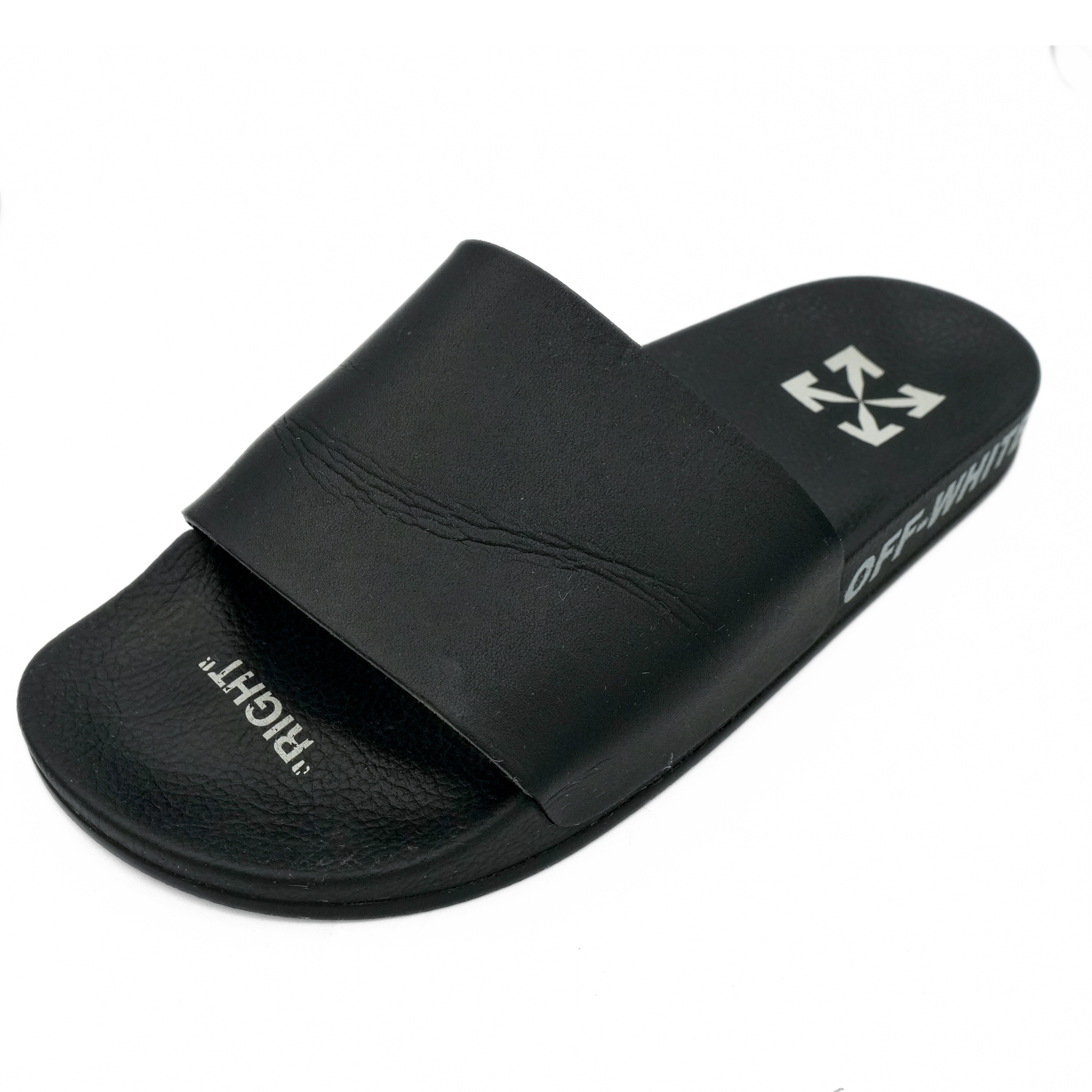 OFF-WHITE pool slide sandals in black rubber with white logo text along the heel of the soles.