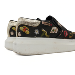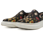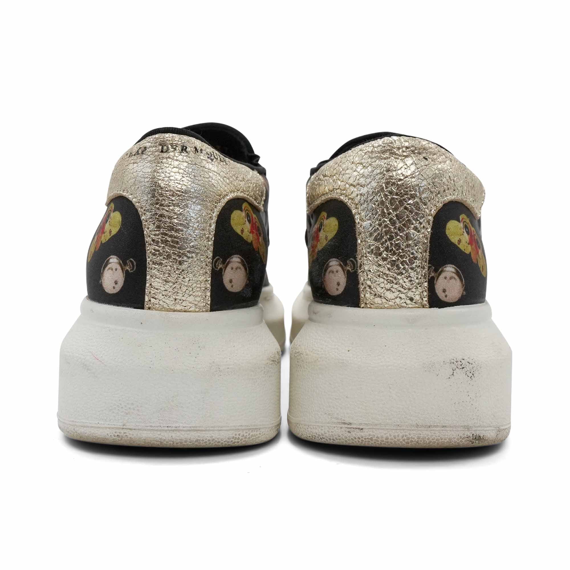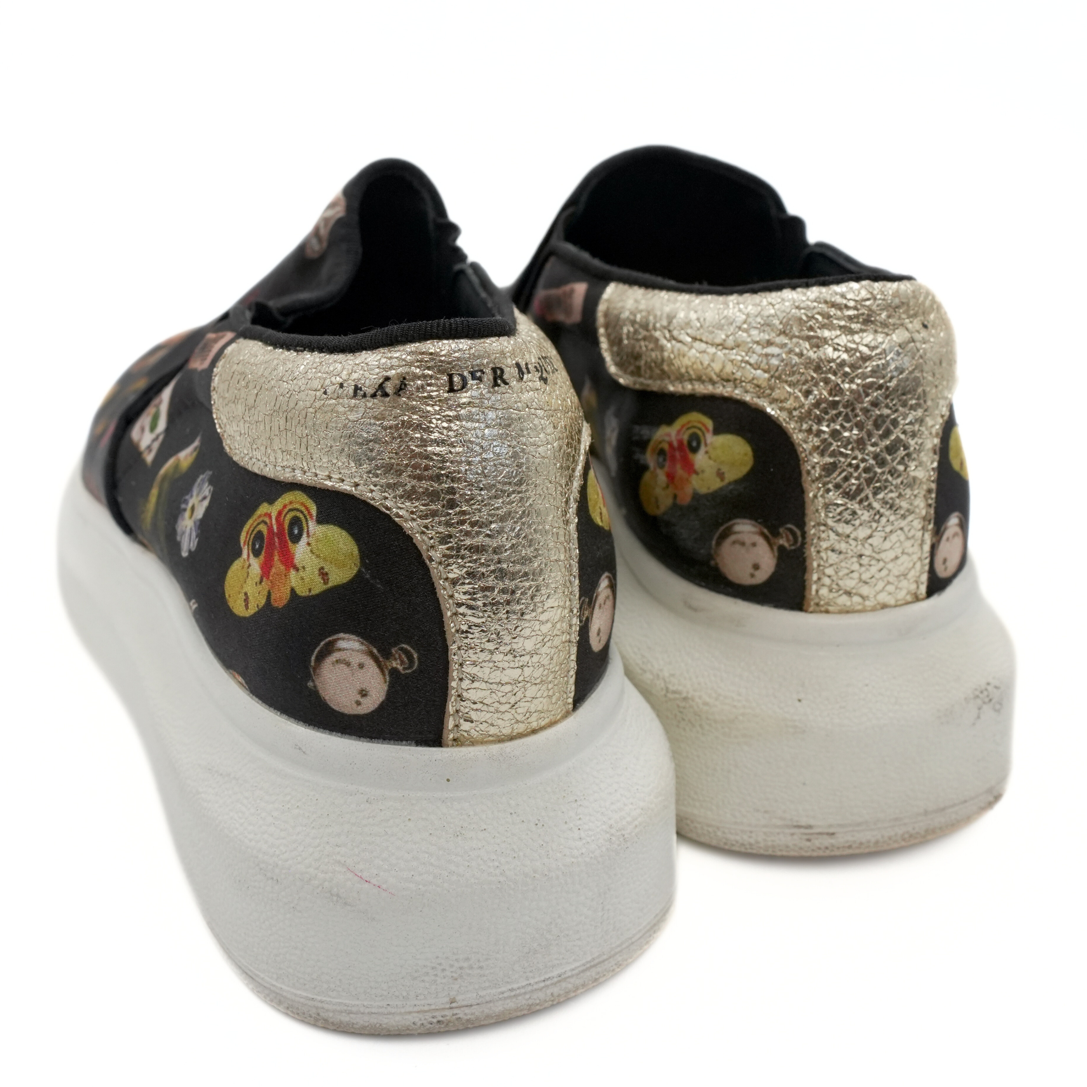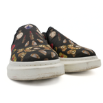 Alexander McQueen 'Obsession Talisman' slipon sneakers in black satin with an all-over multi graphic print, a gold leather patch on the heels, and a chunky white sole.