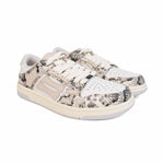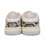 Amiri 'Skel' low-top sneakers in white leather with snakeskin panelling throughout, signature cream bone shaped patches on the sides, and a flat rubber sole.