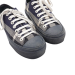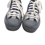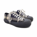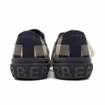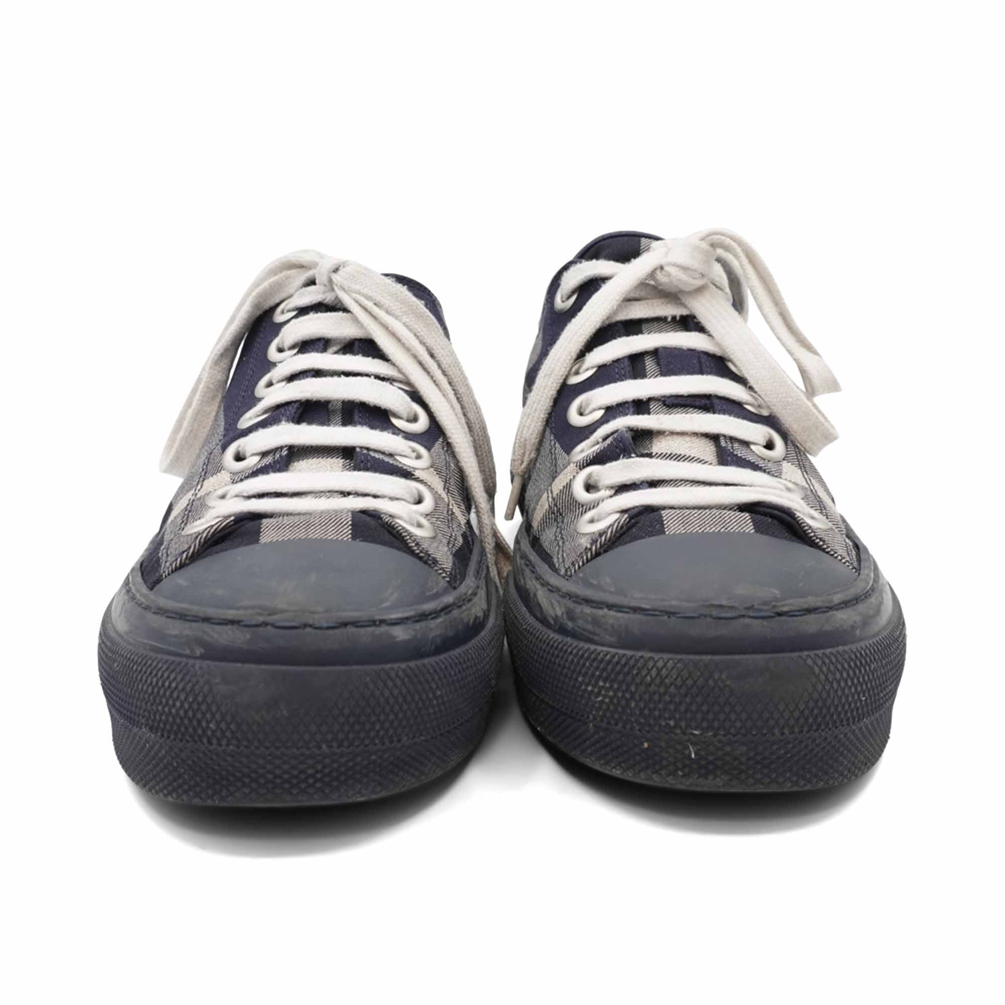 Burberry canvas low top sneakers with all over navy, cream and black 'Novacheck' pattern. The shoes have a rubber platform sole with a rubber logo in back and navy toe cap.