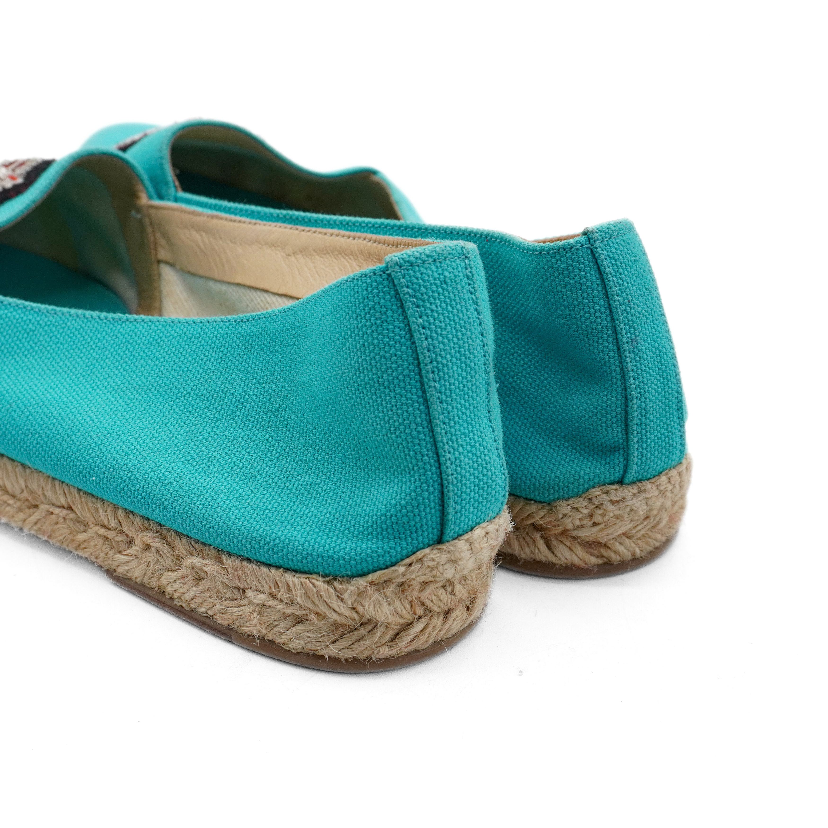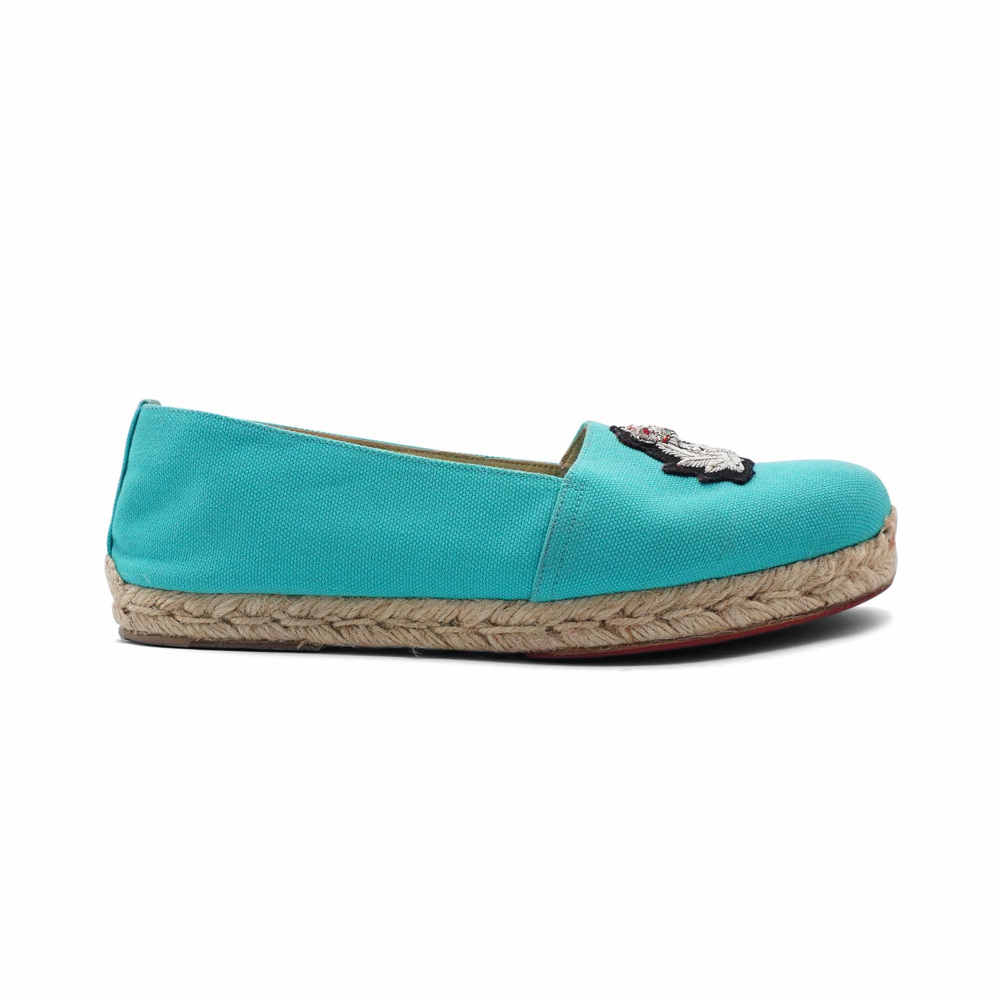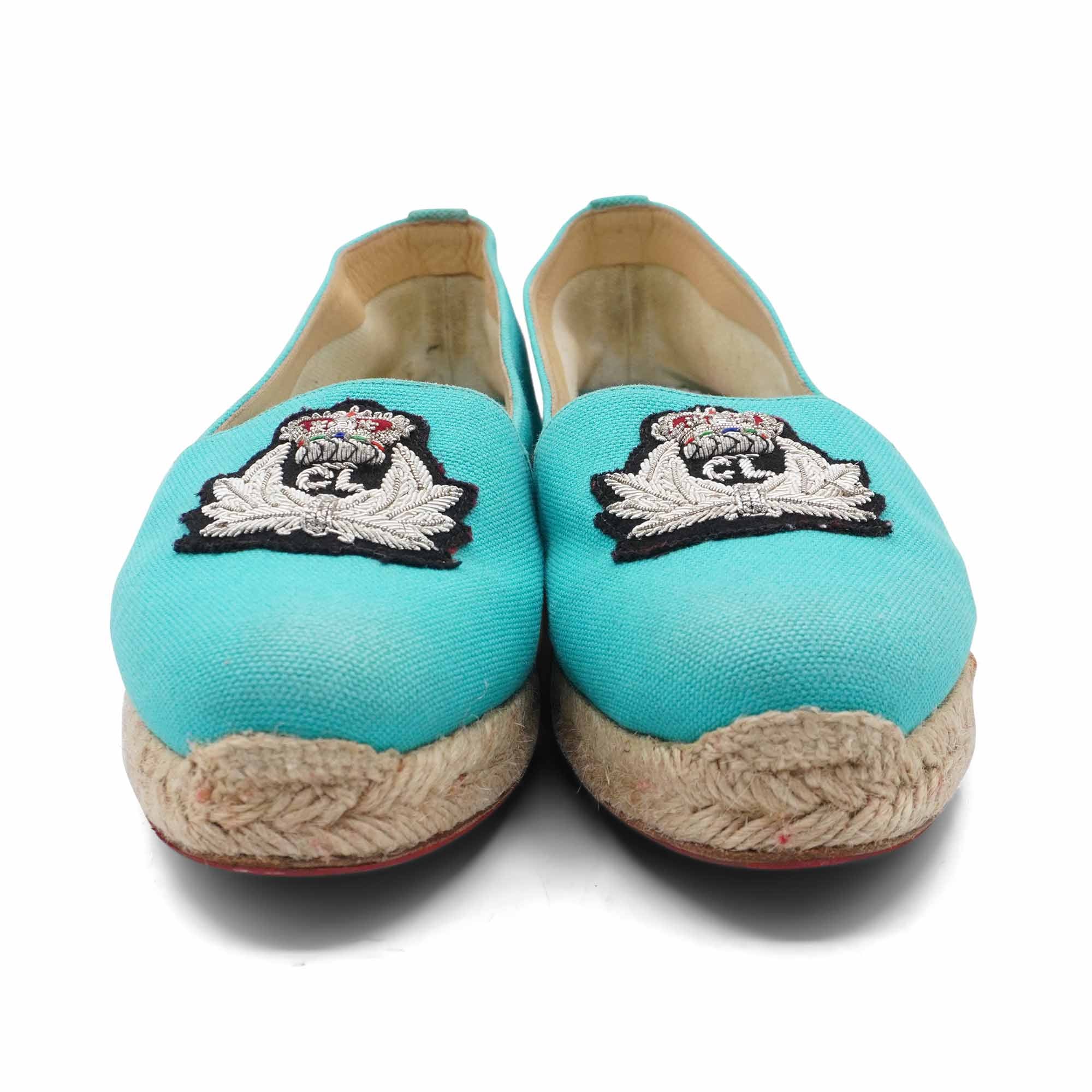 Christian Louboutin 'Gala' espadrilles in turquoise blue canvas with a black and silver crest appliqué on the toes and a woven sole.