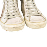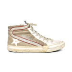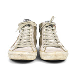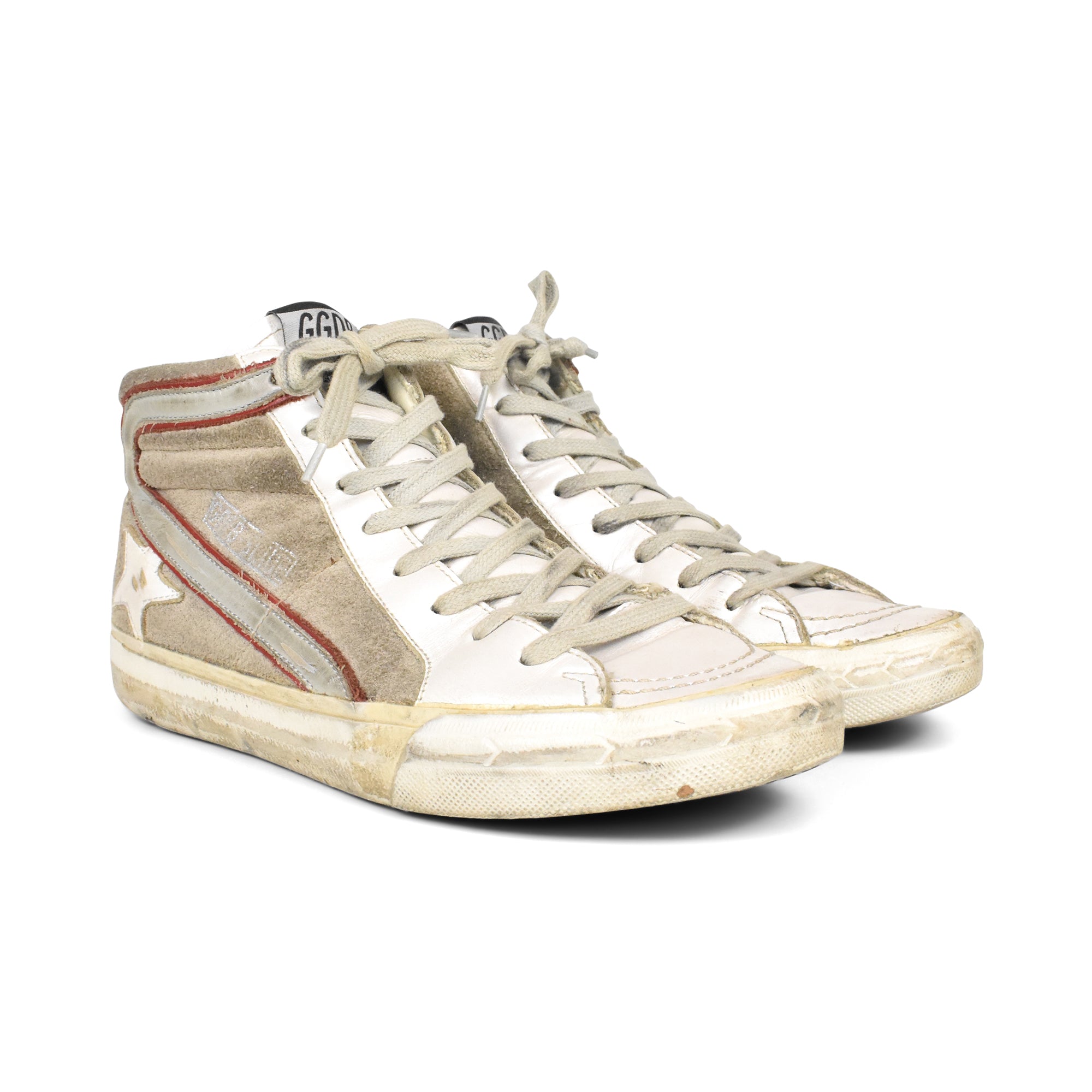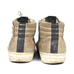 Golden Goose high-top sneakers in grey suede with white leather panelling, an inner zip closure in silver hardware, grey and red star and stripe detailing on the sides, and intentional distressing throughout.