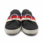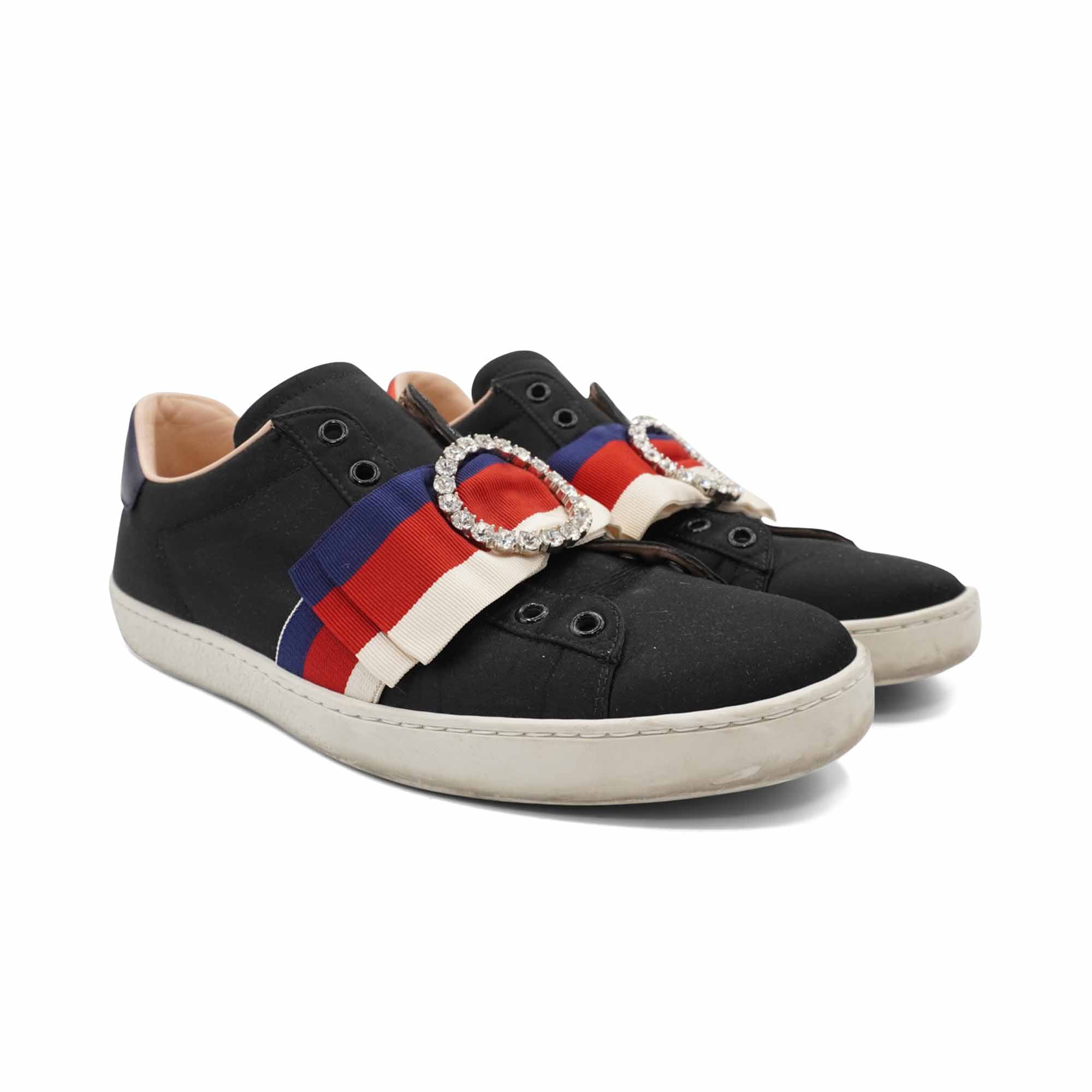 Gucci slip-on sneakers in black satin with a large 'Sylvie Web' racing stripe bow on the toe, a rhinestone 'O' appliqué, metallic blue and red leather heels, and a white rubber sole.