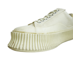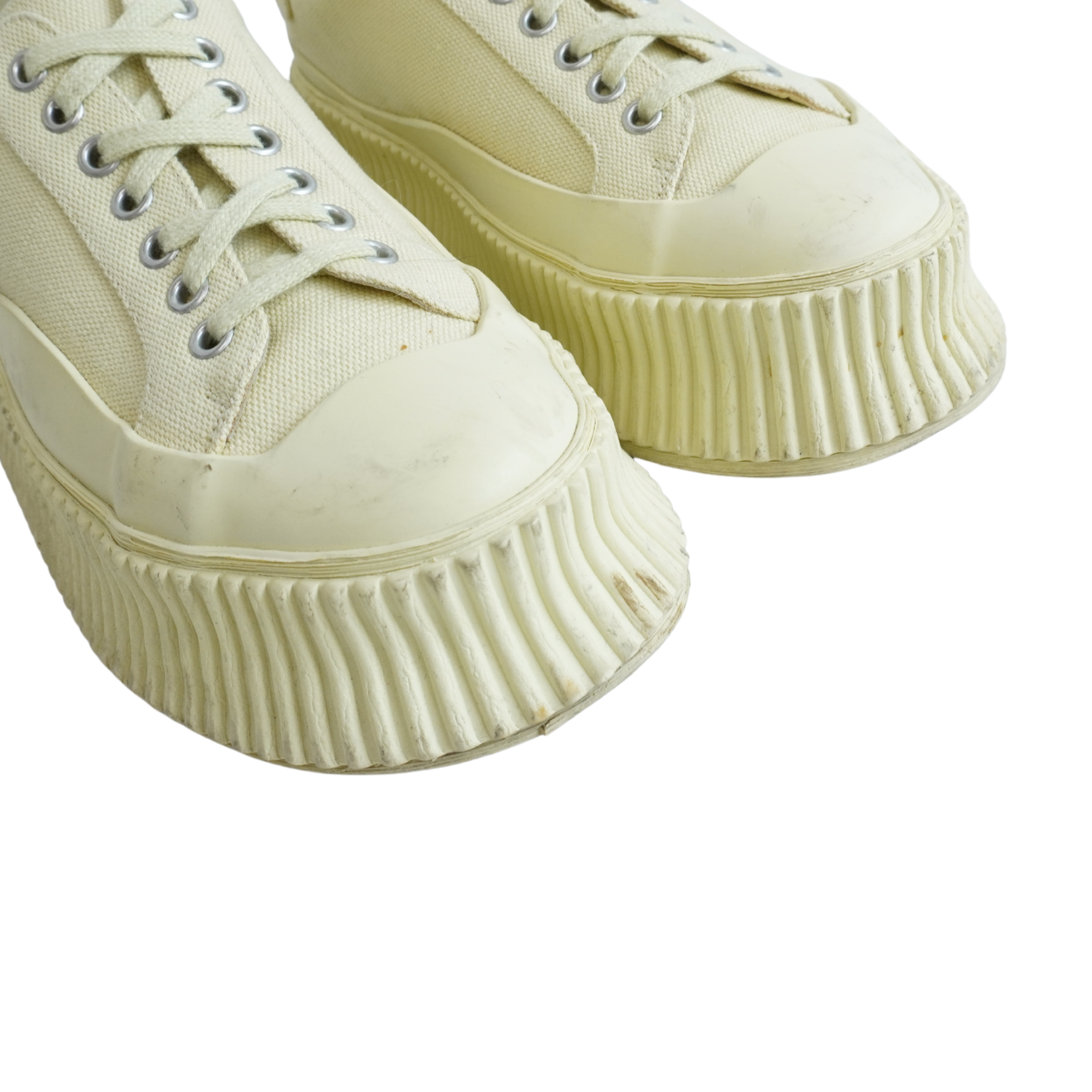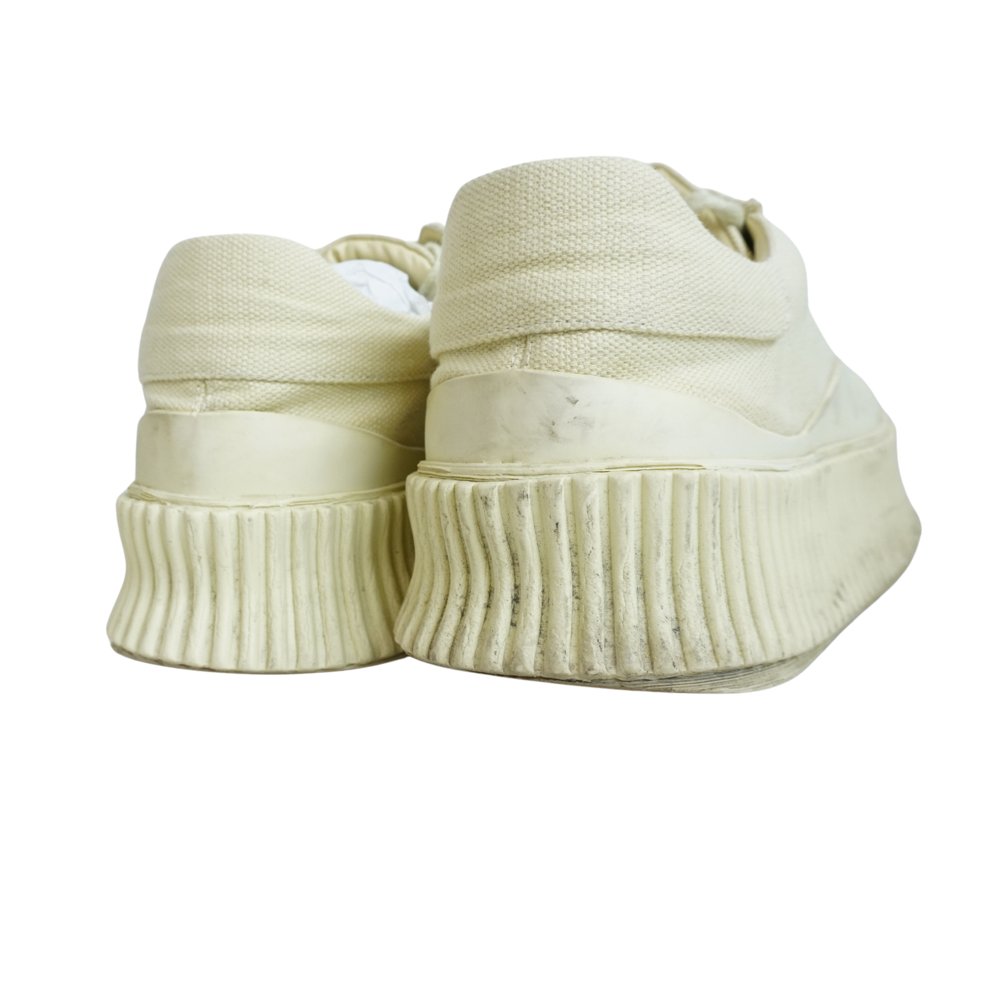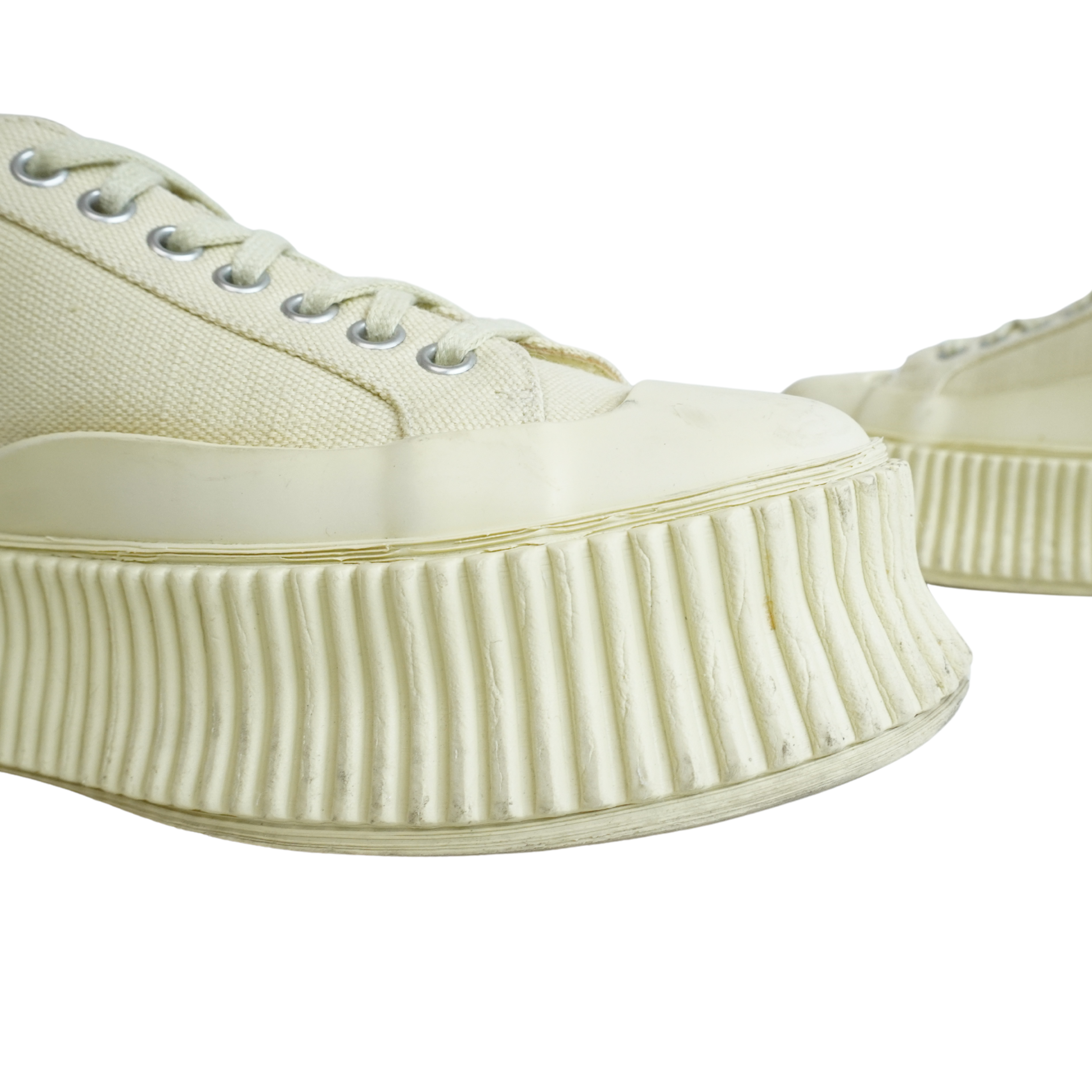 Jil Sander platform sneakers in light yellow canvas with chunky rubber soles, tonal laces and silver hardware.