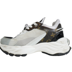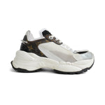 Louis Vuitton 'Run 55' sneakers in cream mesh with a brown monogram PVC trim, black suede and patent panelling throughout, a silver cord detail at the back, and a chunky rubber sole.