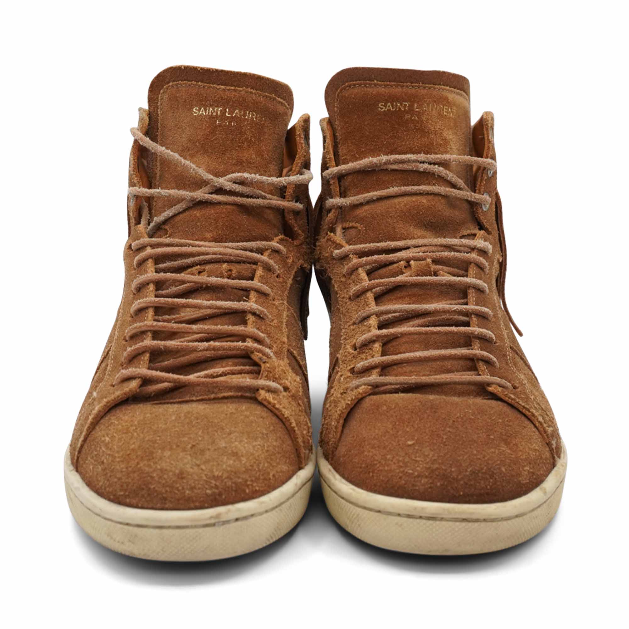 Saint Laurent 'Court Classic Fringe' high top sneakers in cognac brown suede with leather laces and fringe detailing around the ankle.
