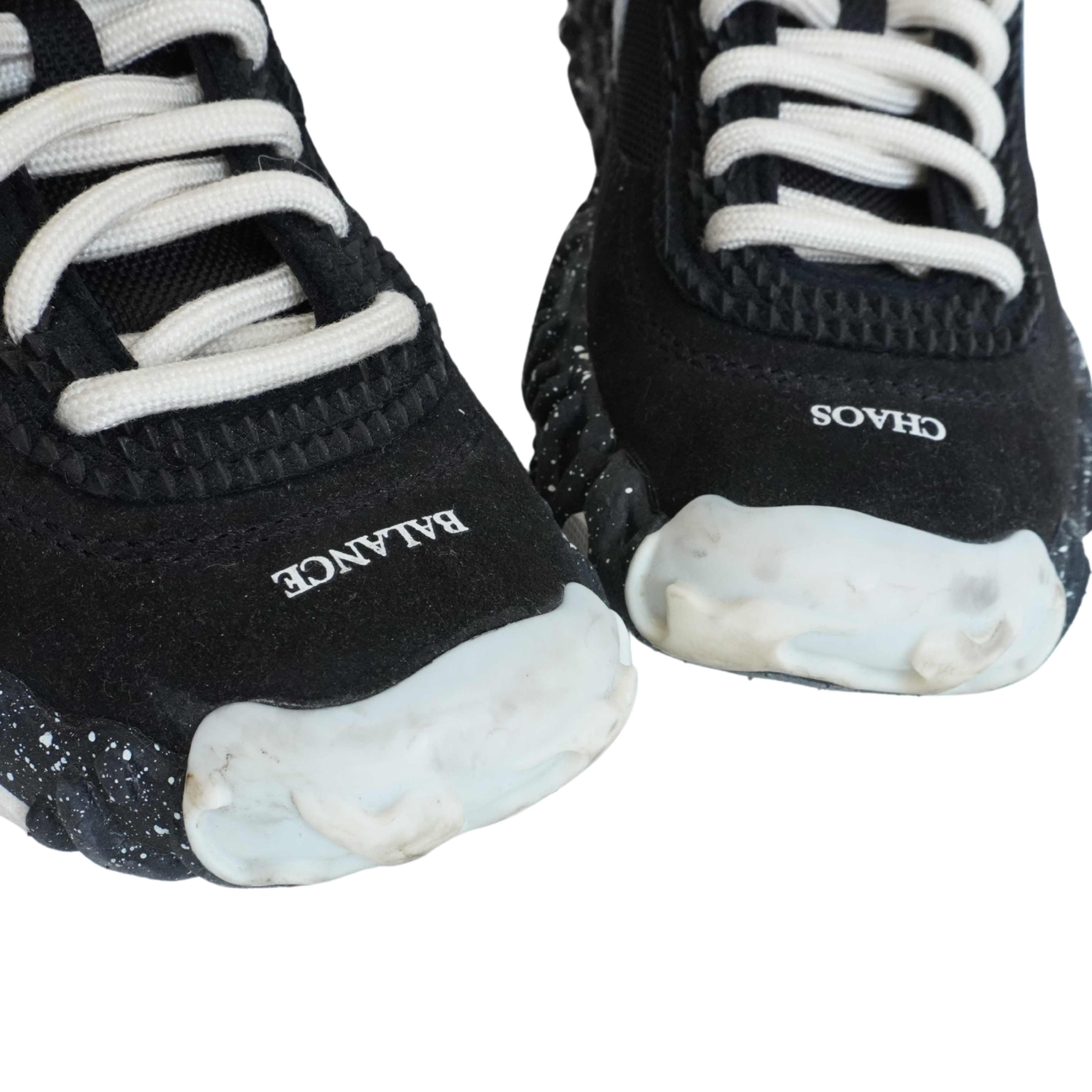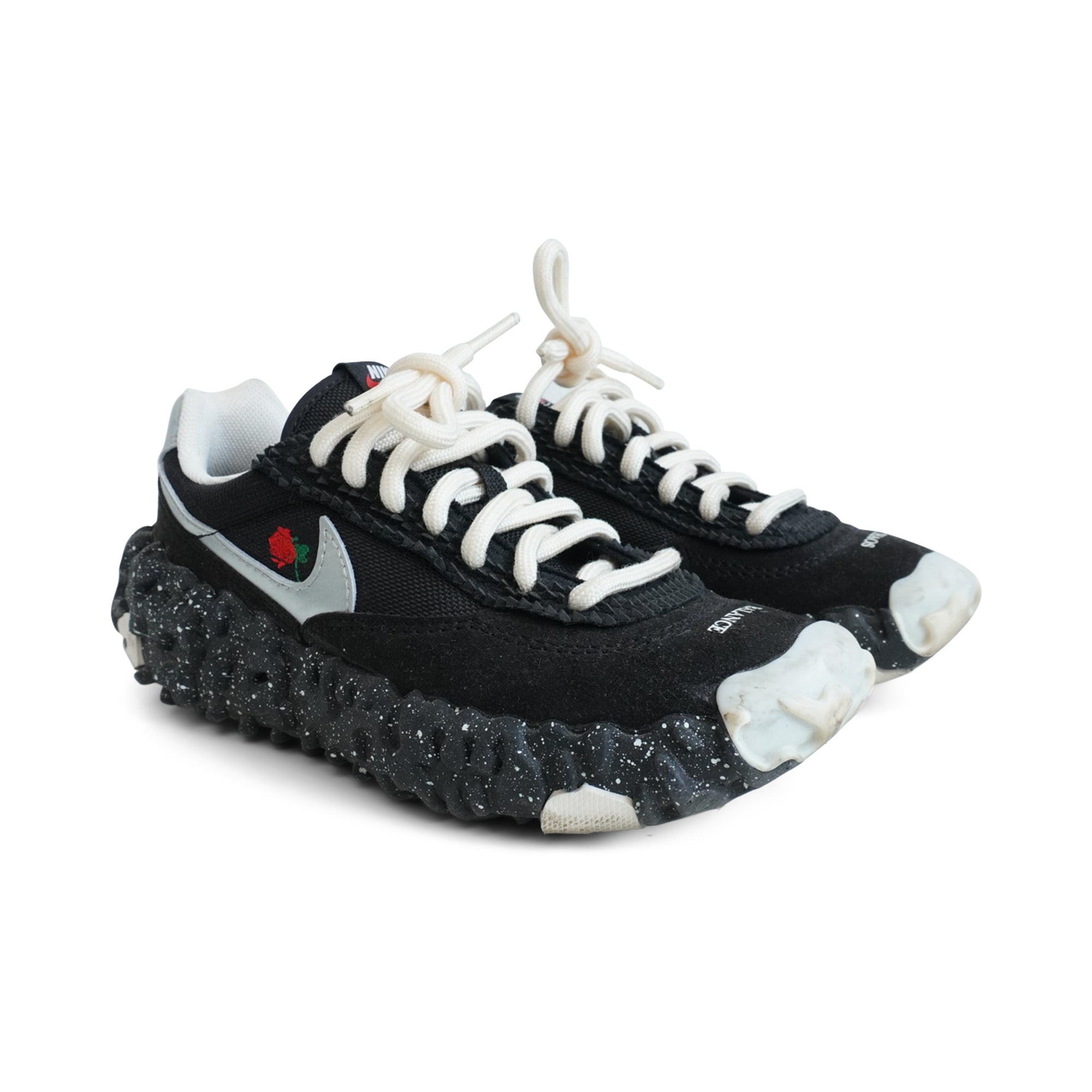 Undercover x Nike Overbreak 'SP' in black suede with metallic silver detailing and cream laces. Features a embroidered rose on the side, 'chaos' & 'balance' print on toe and black rubber soles with white paint speckled design.