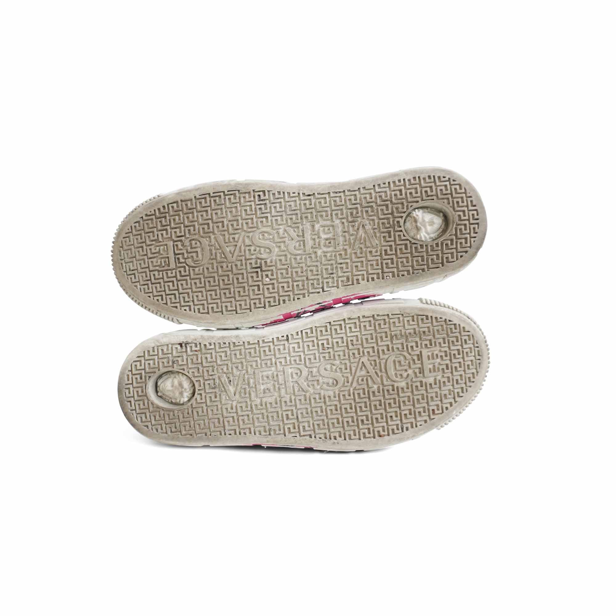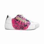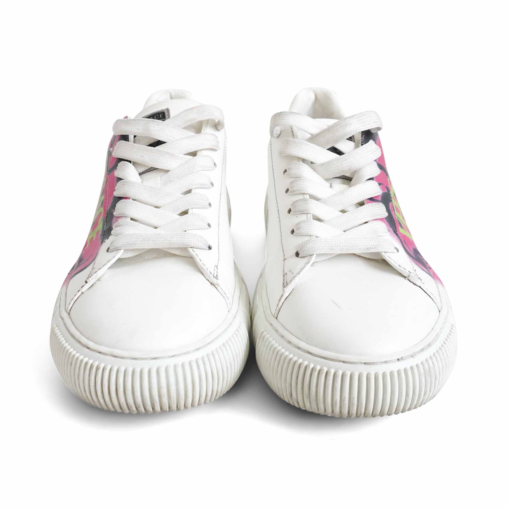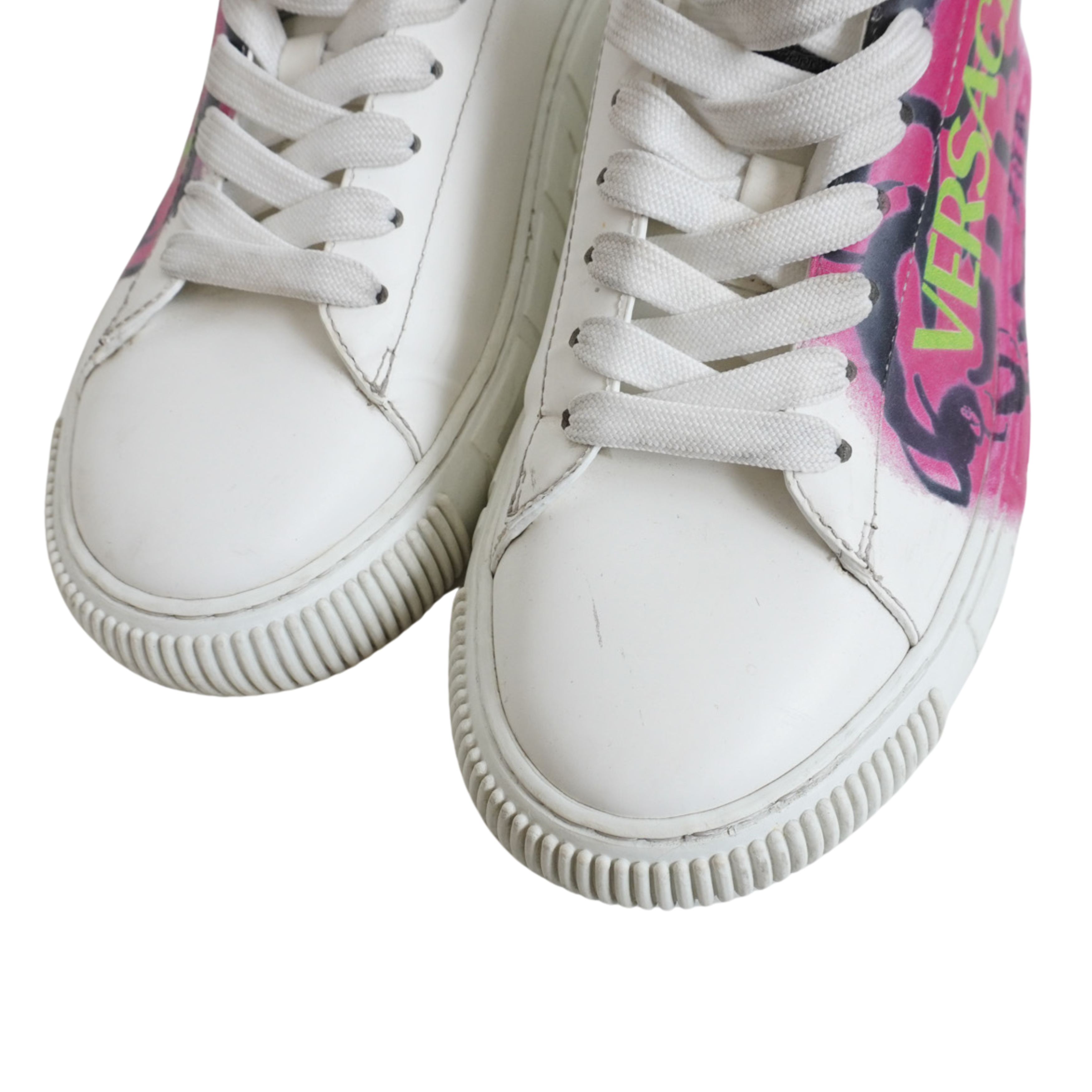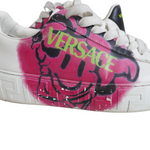Versace 'La Greca Medusa Tag' sneakers in white leather with a large pink, black and white spray paint graphic on the sides.