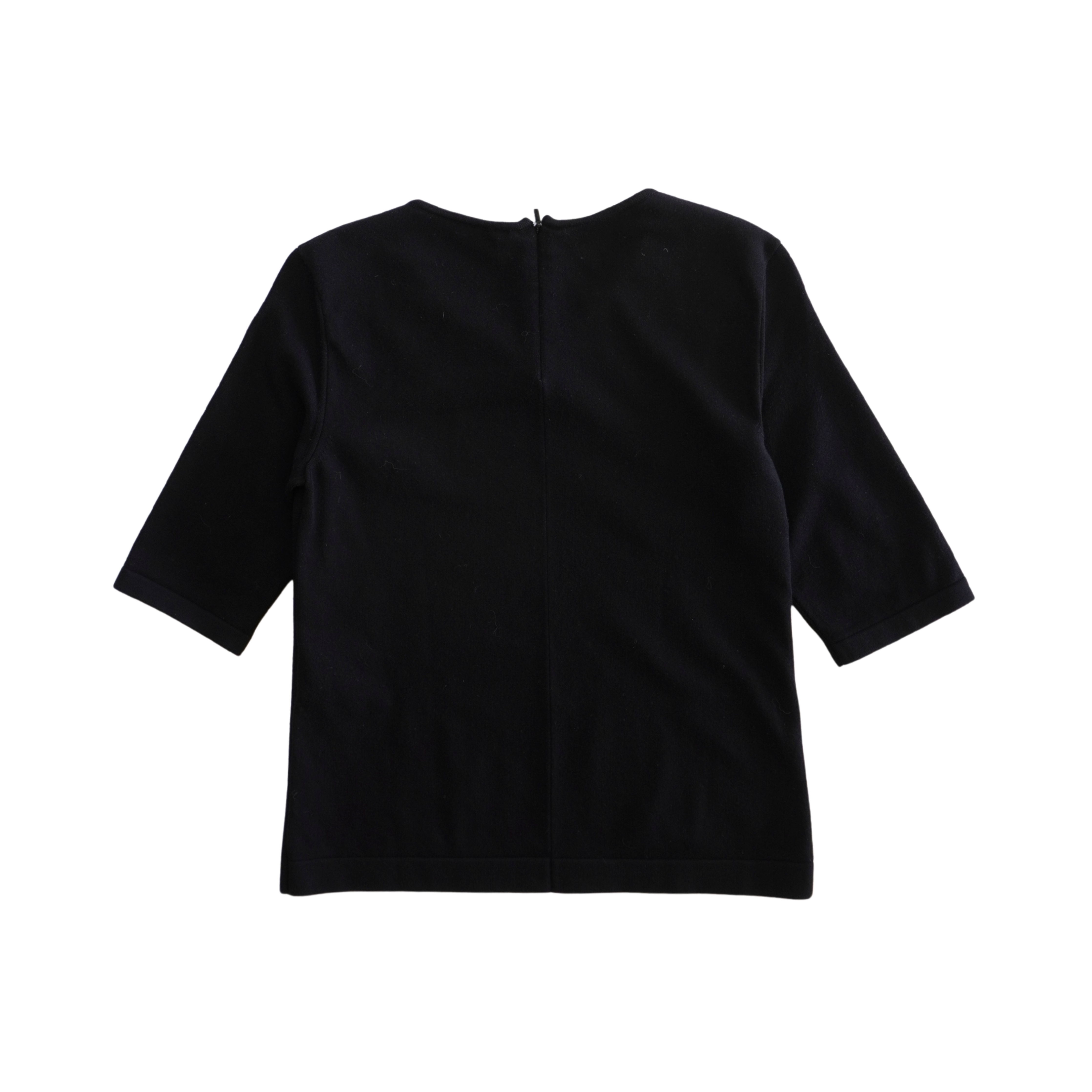 Fendi short sleeve top in thick black knit with hexagon cutout details at the neckline and a beige underlay.