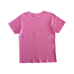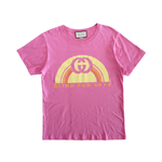 Gucci T-shirt in pink cotton with a yellow rainbow logo graphic and 'Blind For Love' print across the chest.