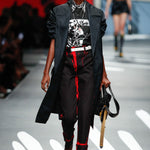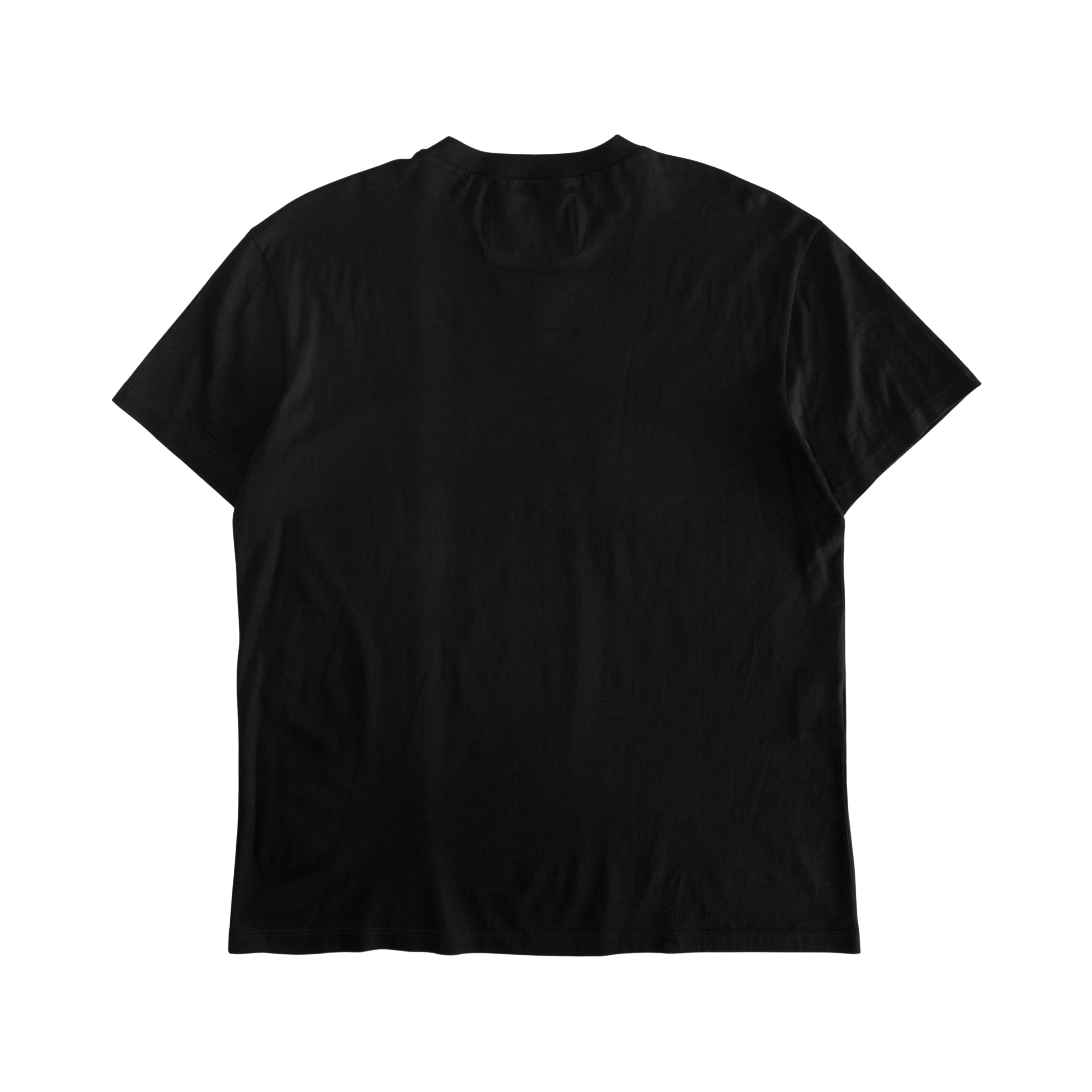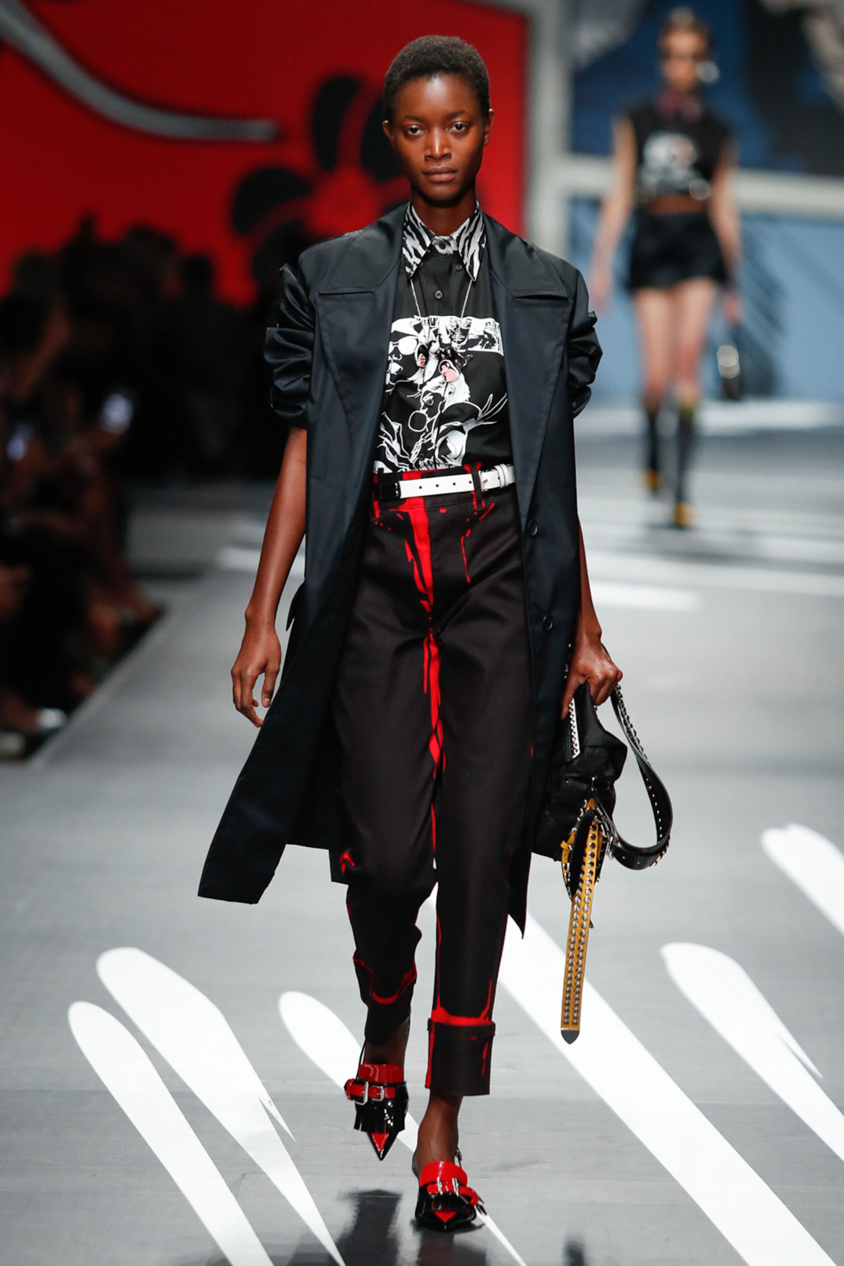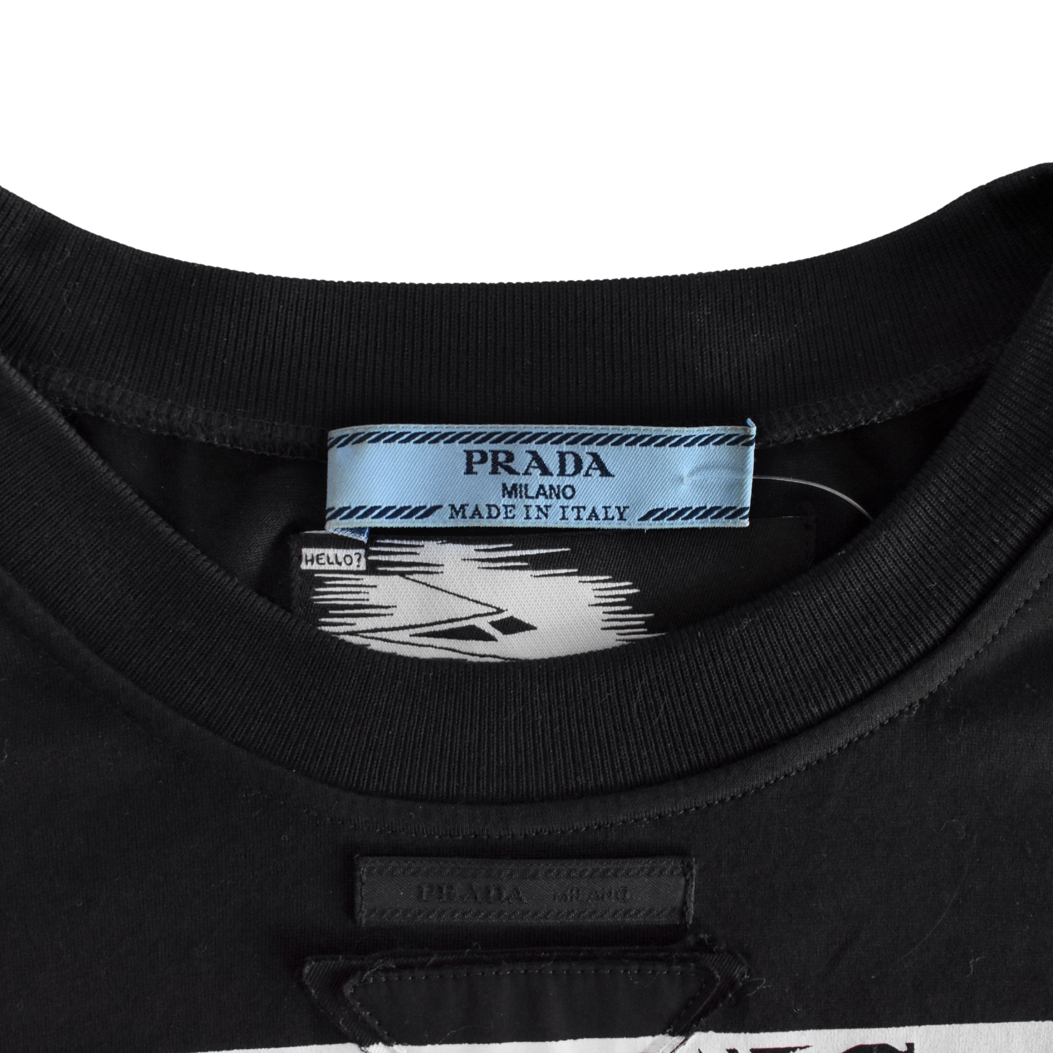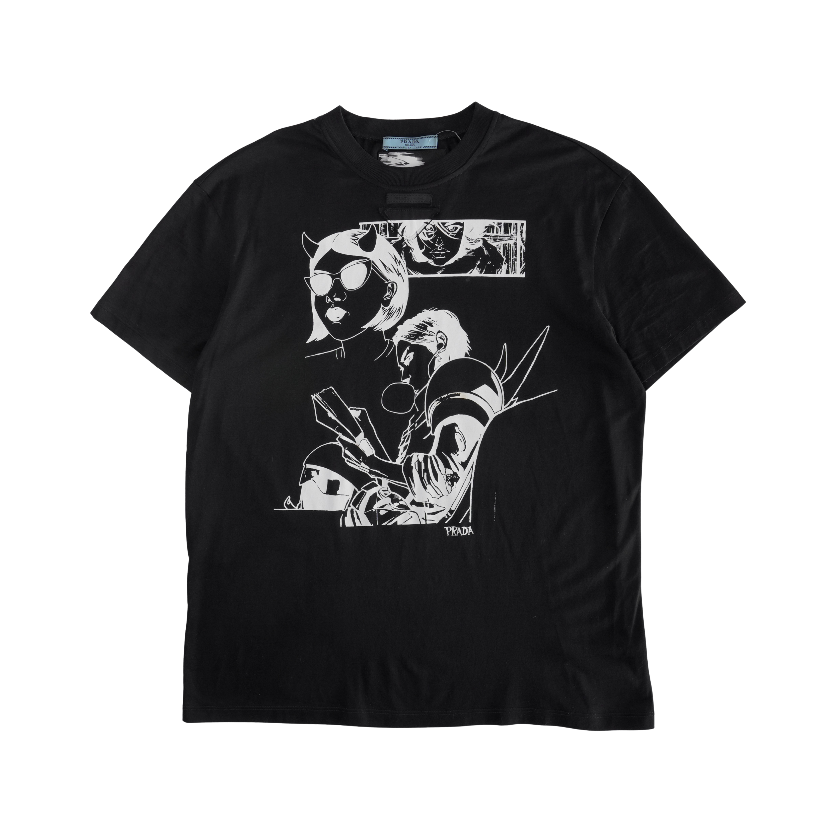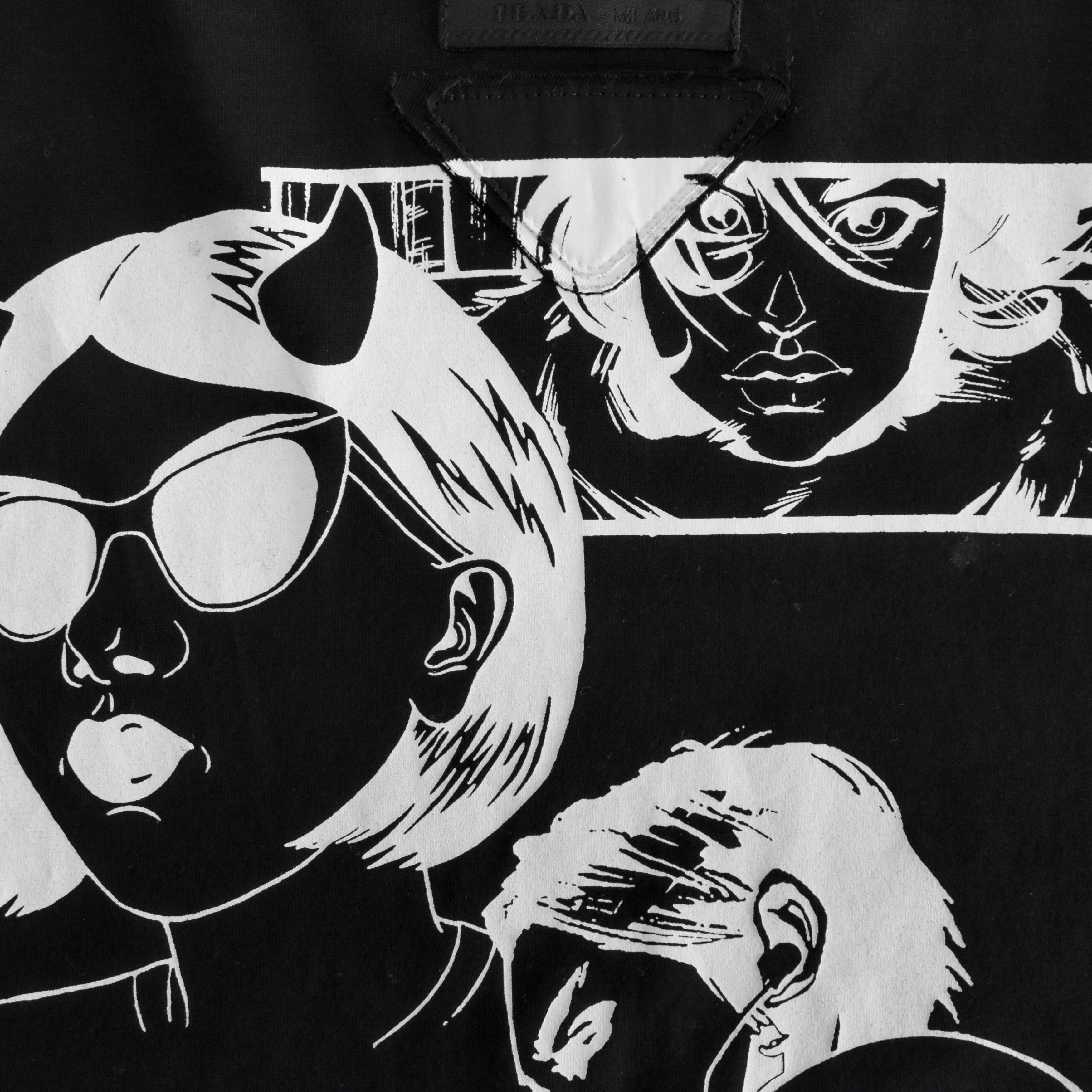 Prada black t-shirt with white comic strip graphic as seen on the runway for the spring-summer 2018 collection. Features a tonal black logo tag and triangle patch below the collar.