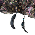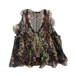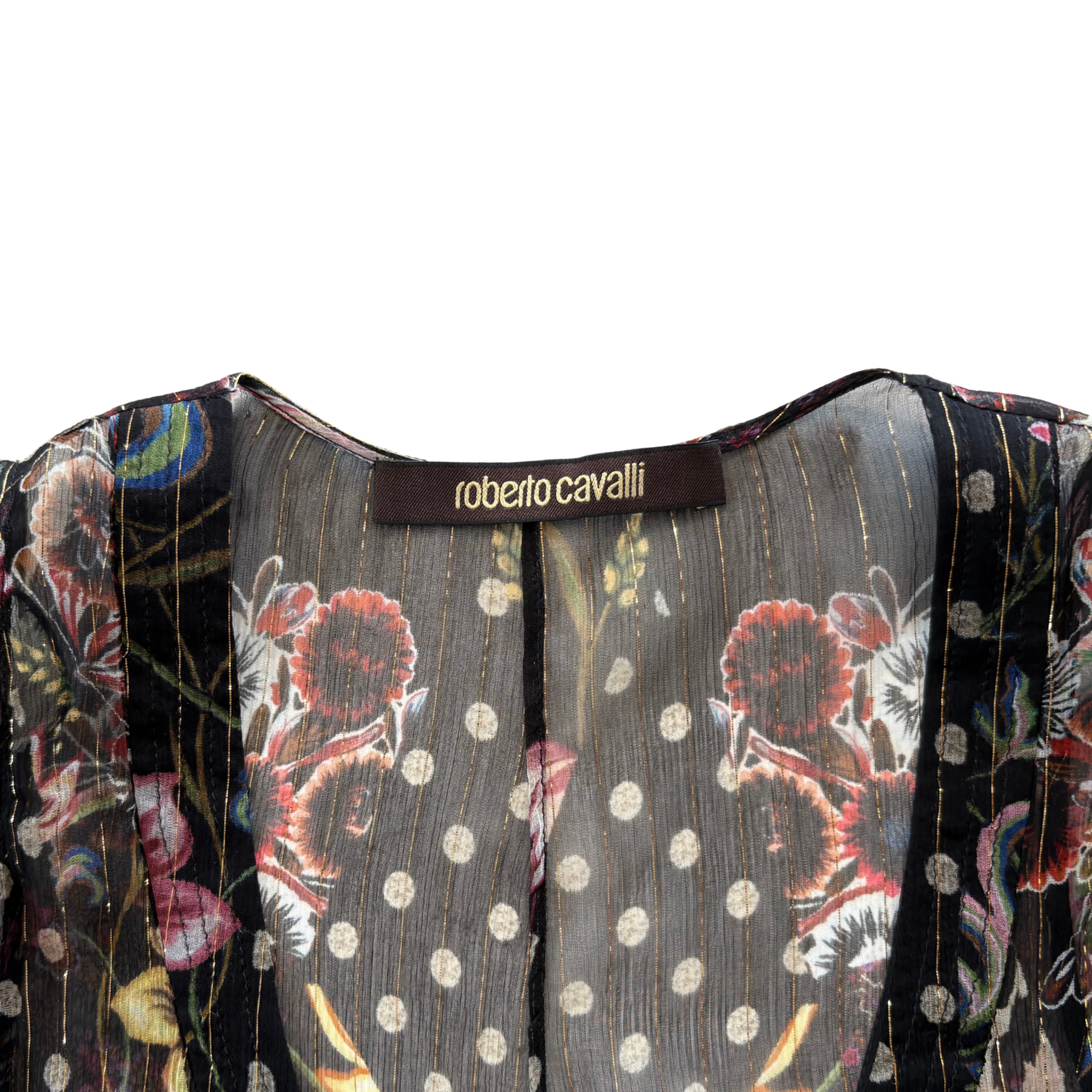 Roberto Cavalli sleeveless blouse in black semi sheer silk with an all-over floral print and gold metallic stripes, ruffle trim, and a black leather tie at the front with feather tassels.