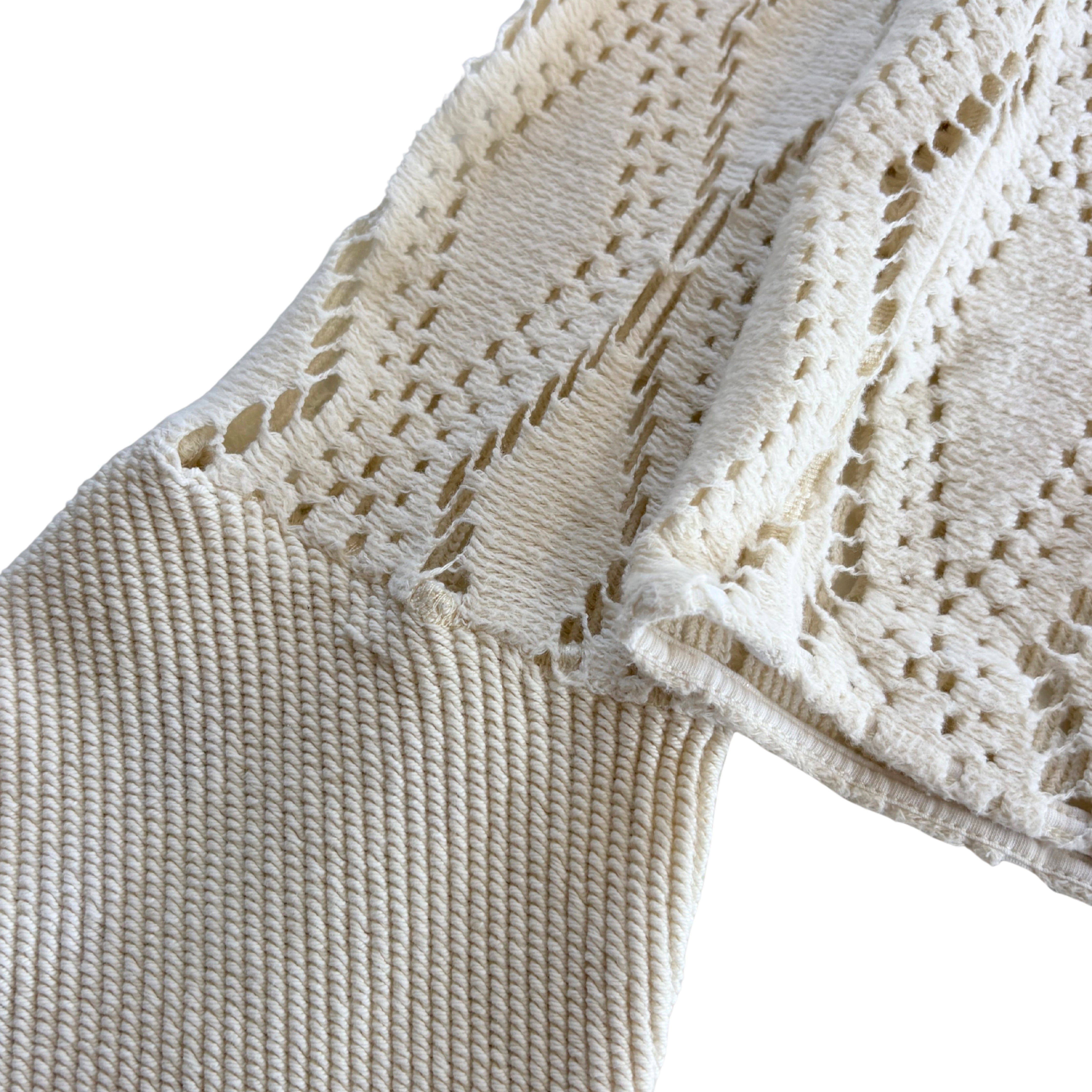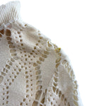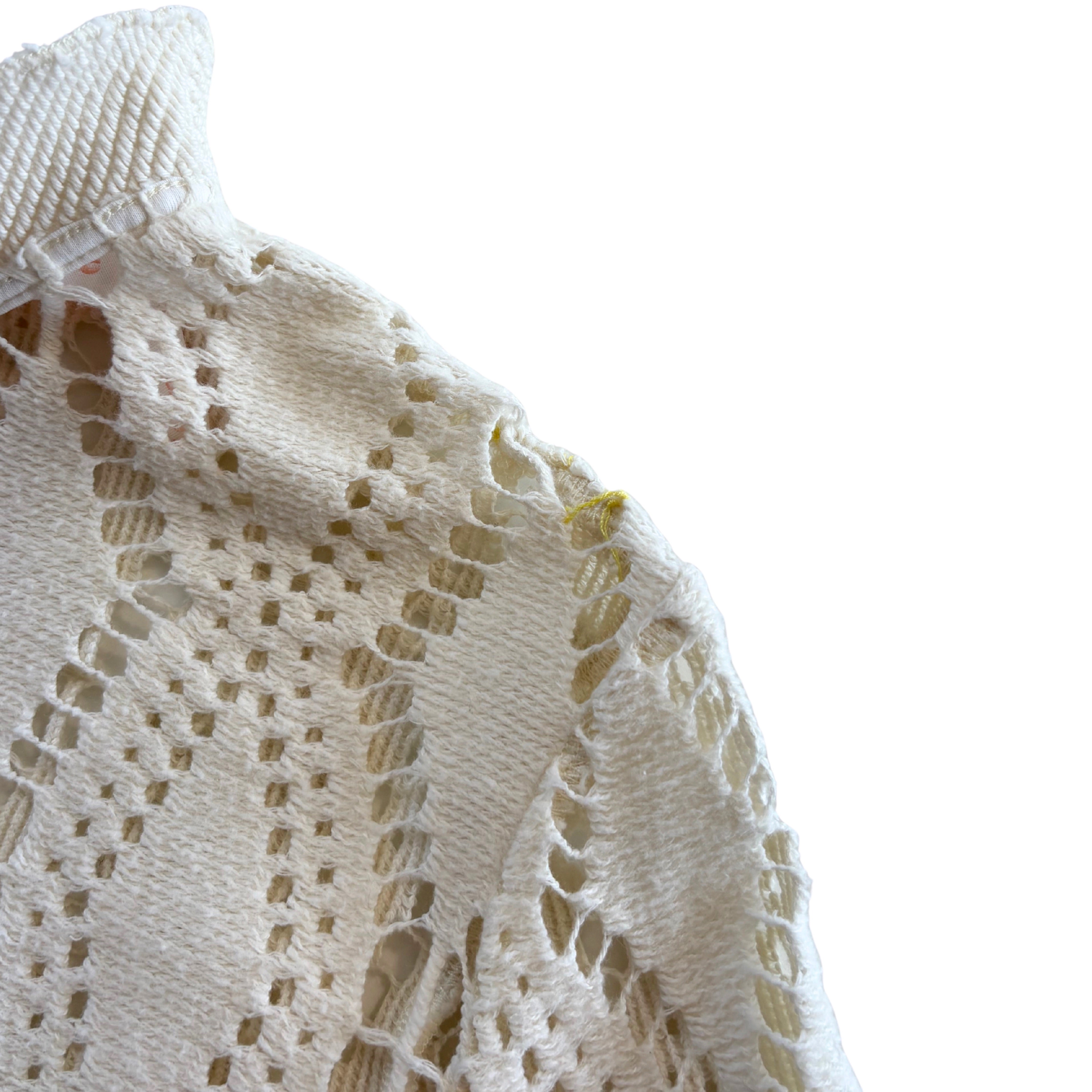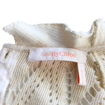 See By Chloe long-sleeve top in cream crochet cotton with flare sleeves, a mock neck, and back button closures.
