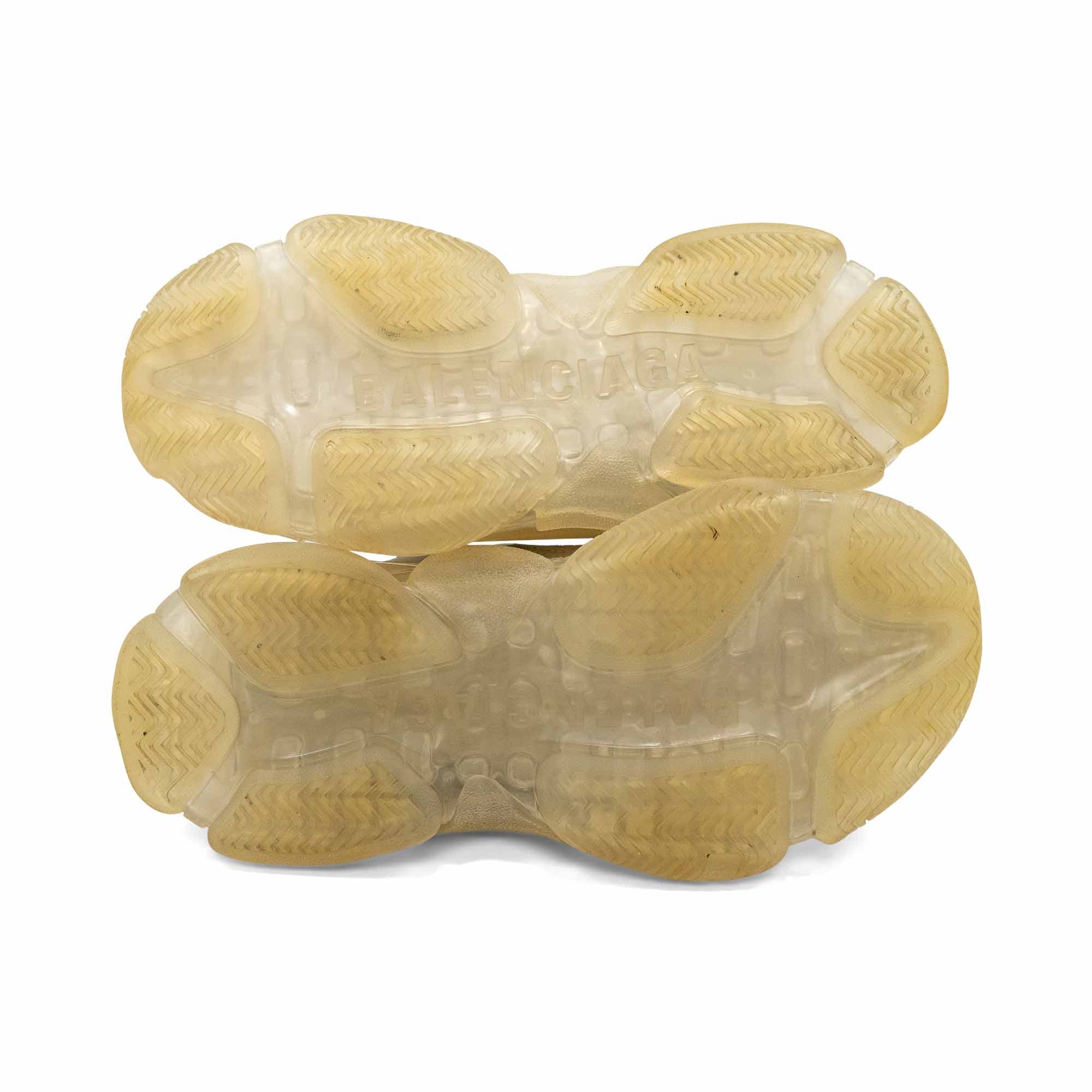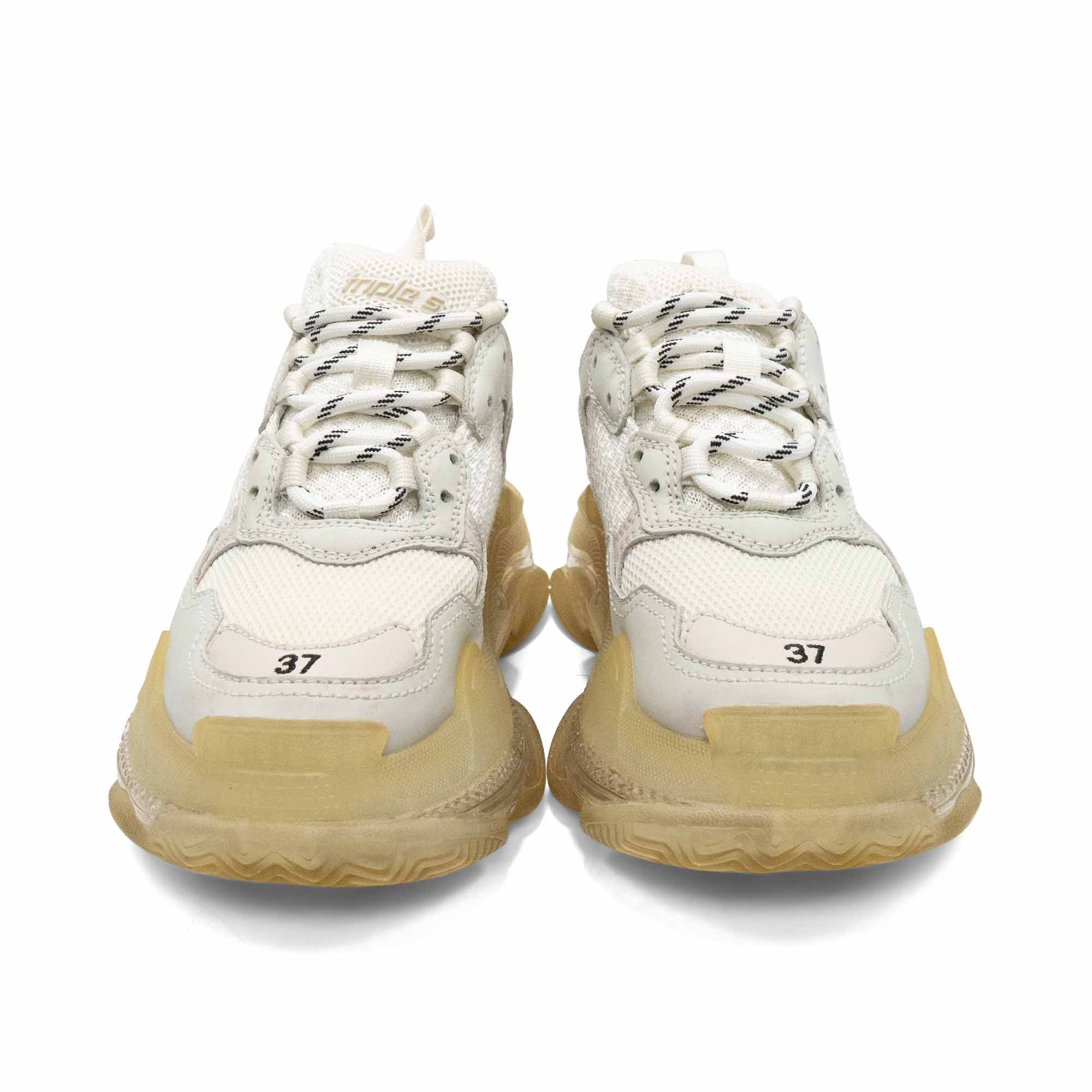 Balenciaga 'Triple S' chunky sneakers in cream with clear sole detail. Features pale blush and off white leather details, cream mesh body, black logo embroidered on outer side and '37' embroidered on the toe, and a rubberized, tonal 'triple s' logo on the tongue.