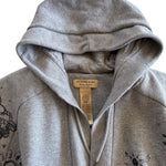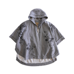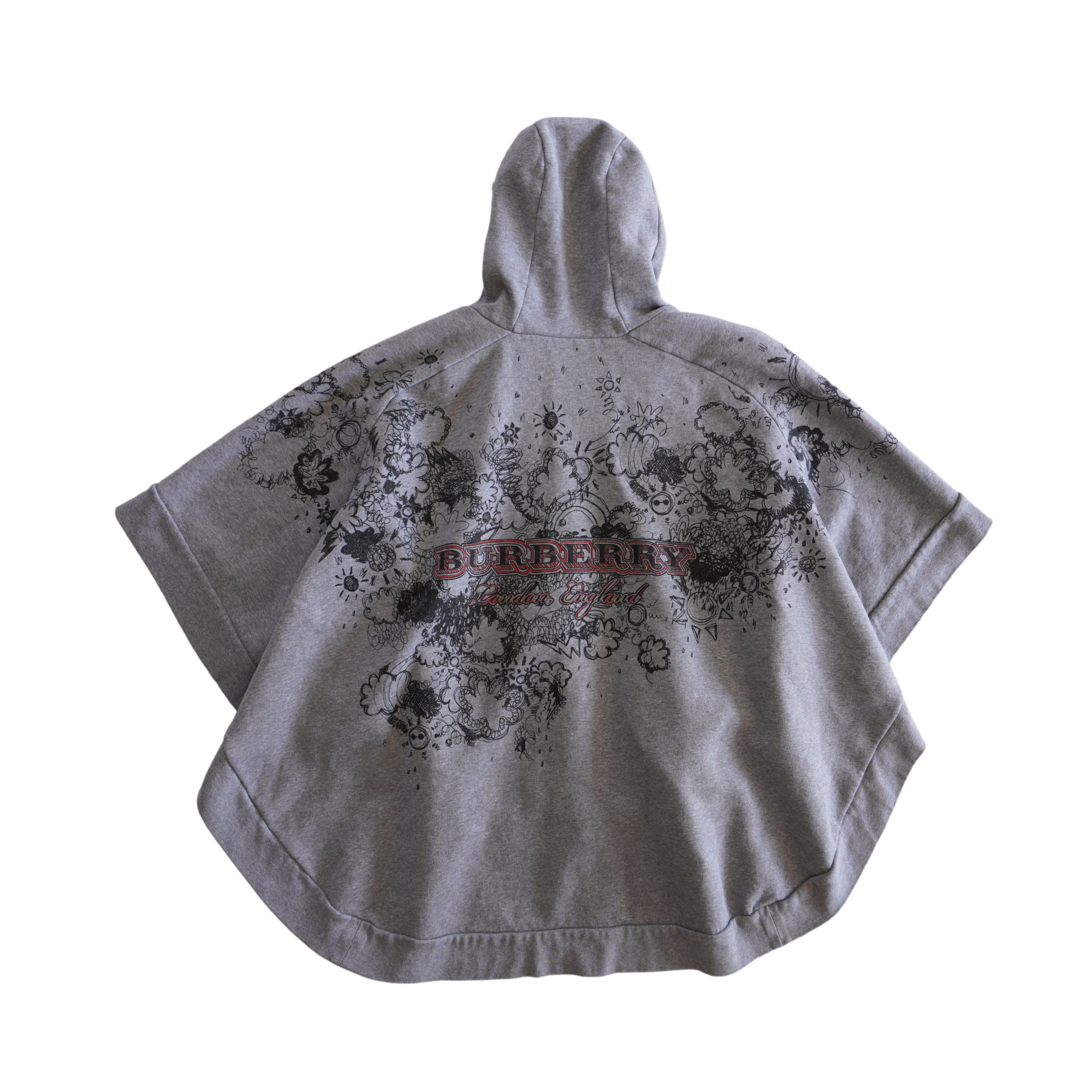 Burberry cape sweater in grey cotton with a black doodle design throughout, an open front, and a hood.
